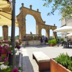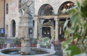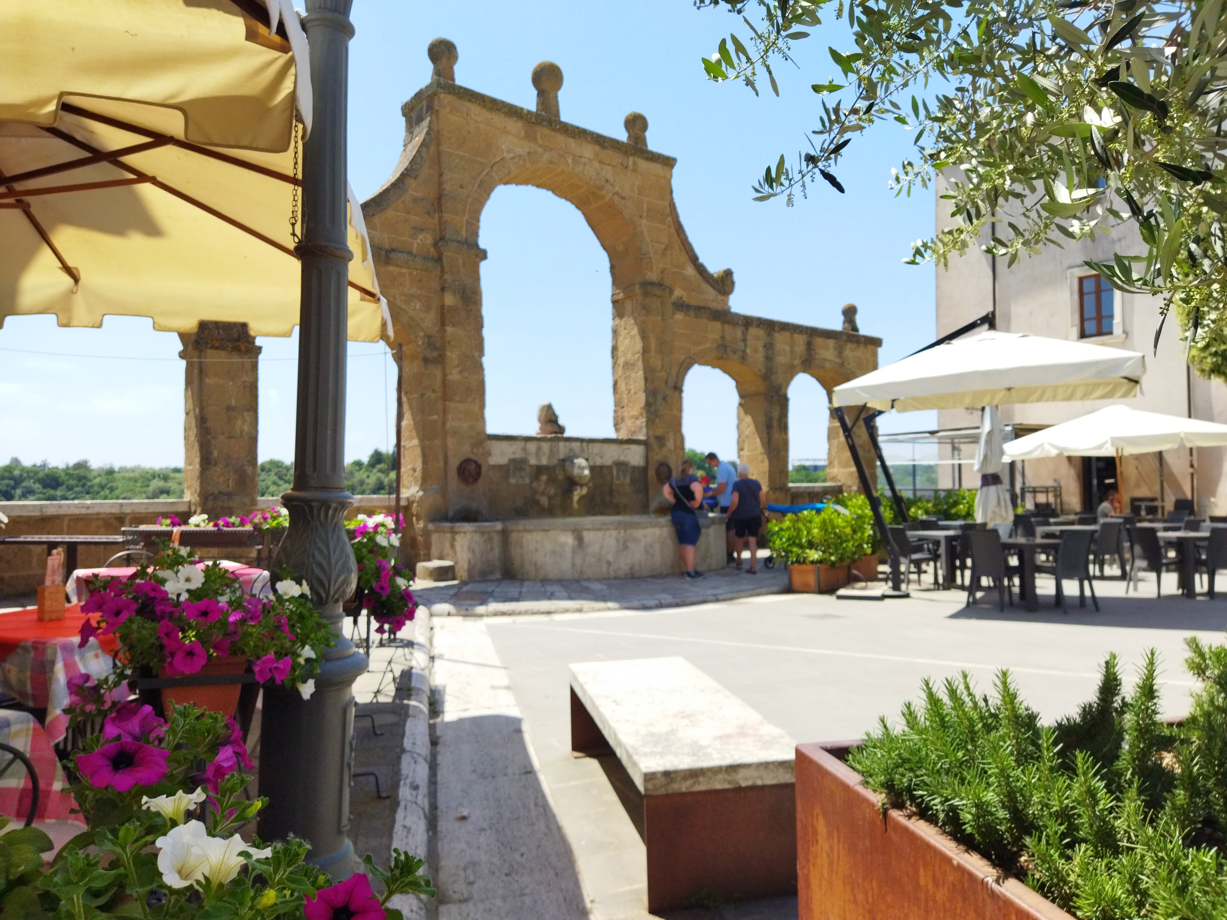 一方、上の写真の左の建物の前がフランチェスコ・ペトルッチョーリ広場になっており、バールやレストランが並びます。紋章のある大きな門を入ると、橋を渡った場合と同じく、そこは市役所のあるガリバルディ広場。そこから城壁沿いのアーチが並ぶ道を左折、まっすぐ行くと左右に大きな広場、フォルテッツァ・オルシーニ広場にでます。広場の名前にもなっているオルシーニ家は中世にここを治めた一族で、現在もルネサンス時代のヴィラが残っており、現在は博物館になっています。