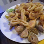 上左からサラダに白身魚フライ、下左からタコのスパイシートマト煮込み、海老のグリル。エビが2匹だったものの、それ以外は量もあったので、少しずつ前菜を食べるなら複数人でシェアで十分な量です。アツアツのフライはあっという間になくなりましたが、煮込みのタコも柔らかくトマトソースも絶品だったので、パンですくって完食!