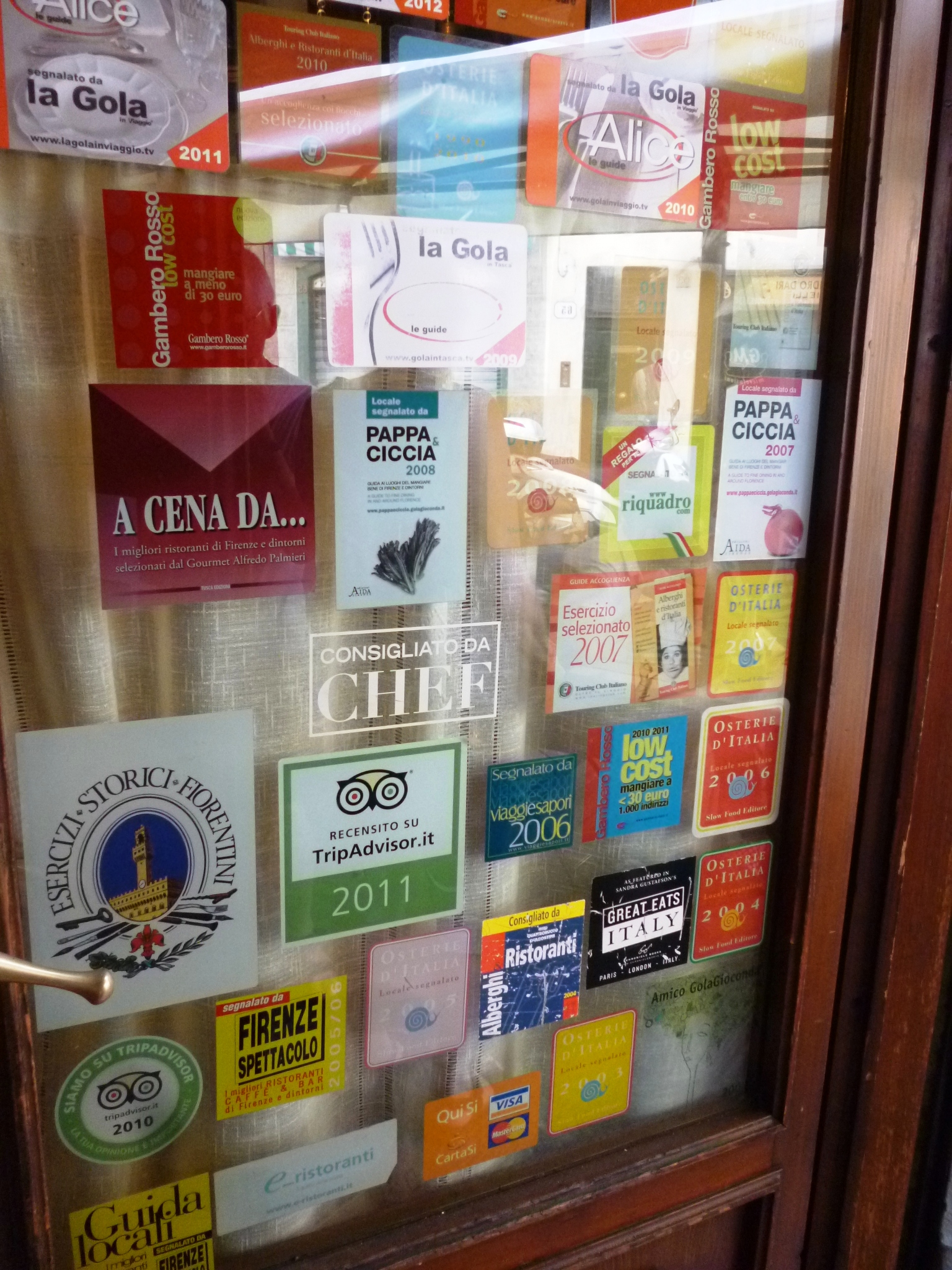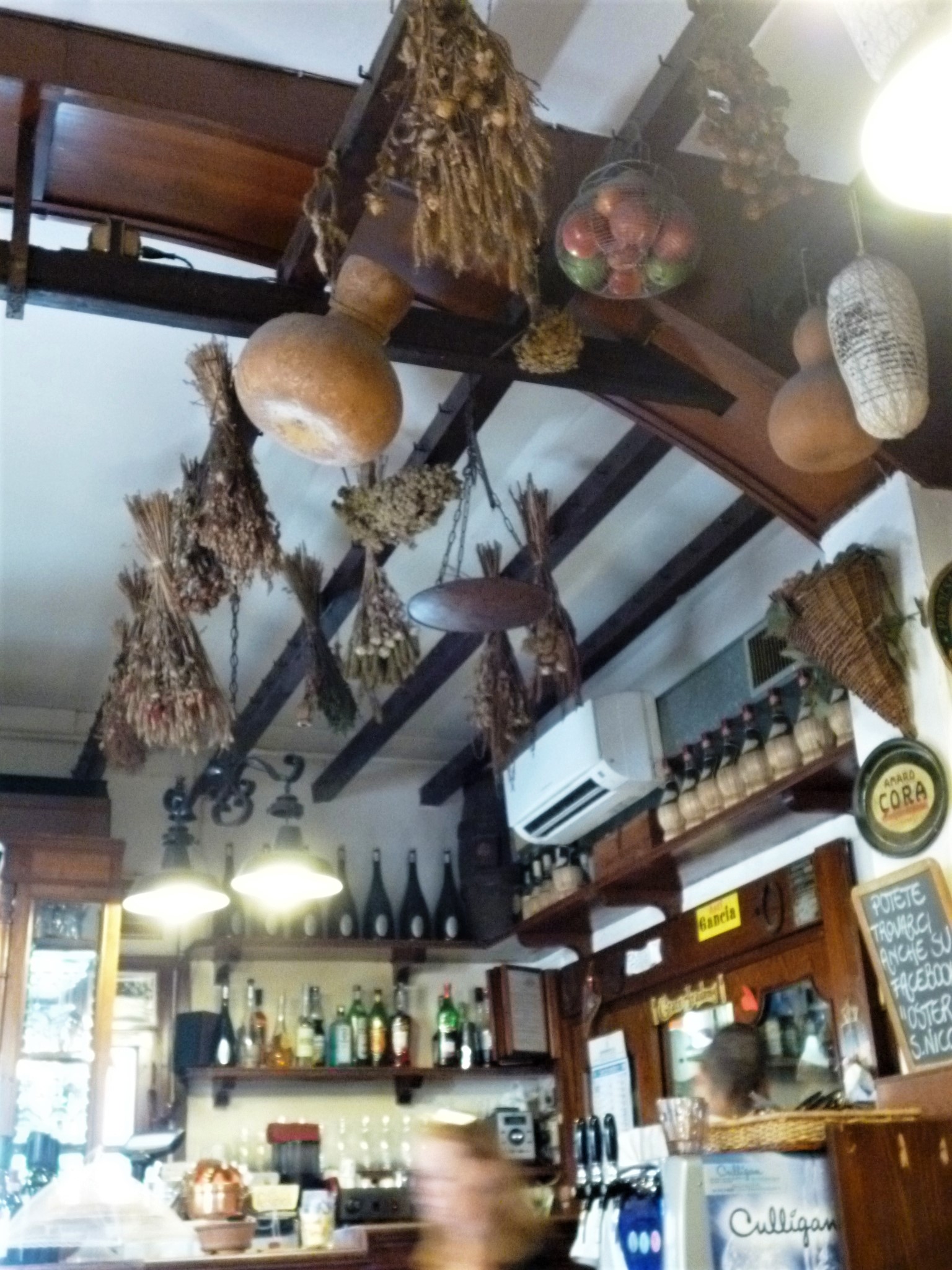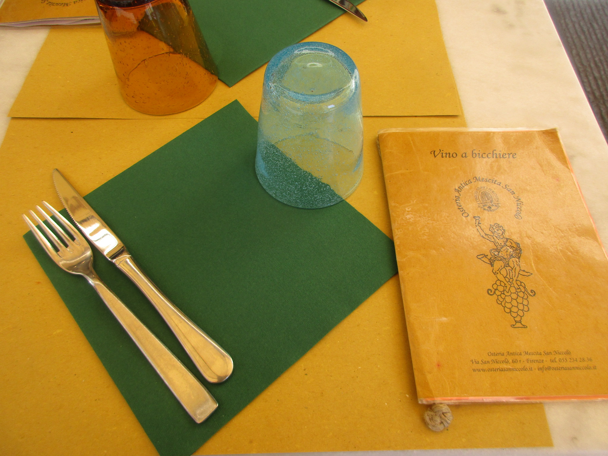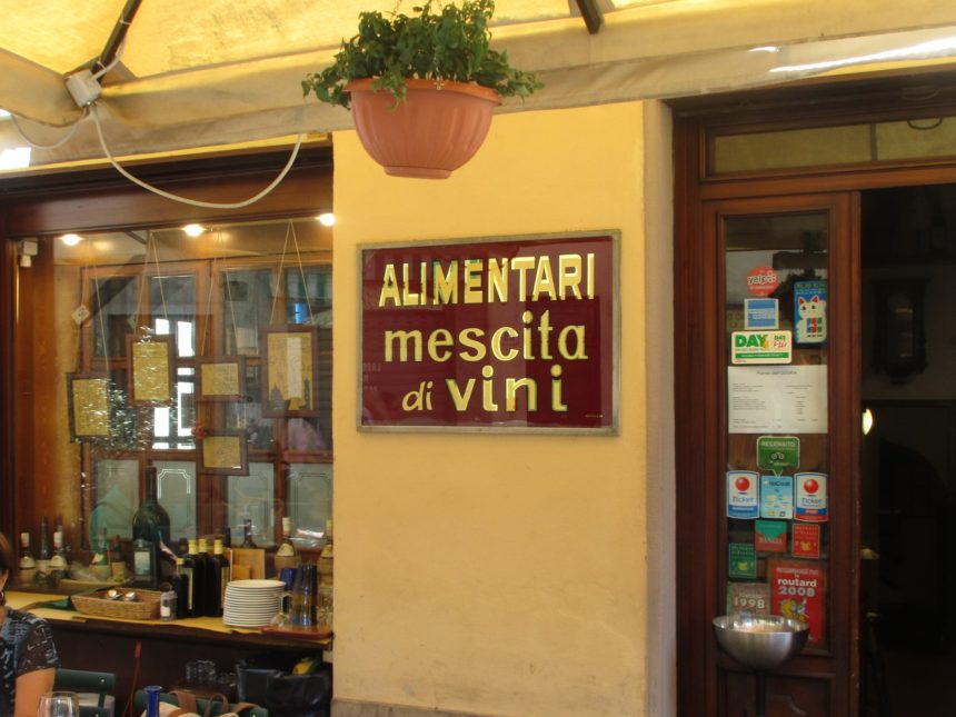 アルノ川の向こう側・サンニッコロ地区にあるオステリア。トスカーナ料理を食べられる店はたくさんありますが、個人的に気に入っていて、このゾーンに来たらここで食べることが多いです。何よりもスタッフ(特にメガネで長髪のお兄さん!)とお店の雰囲気がとても感じ良い。そして営業時間も昼の12時からノンストップなので、遅いランチにも早いディナーにも便利だからです。この場所の歴史は古く、元々はキアンティから入ってくるワインの税関、そして800年代には食材とワインを扱うお店だったそう(Alimentari=食料品、Mescita=酒屋)。このお店の名前でオステリア(食堂)となったのは1970年になります。
