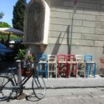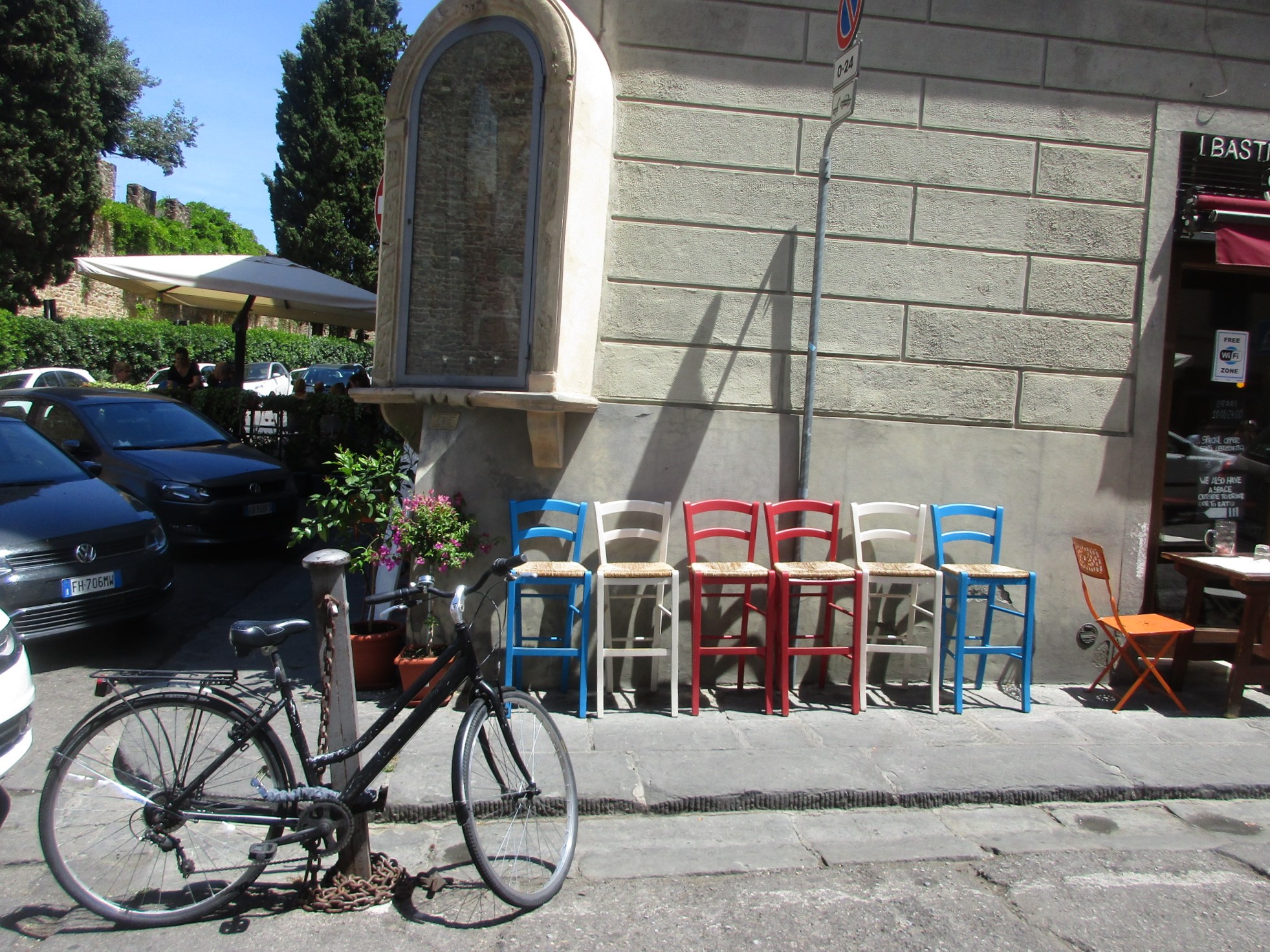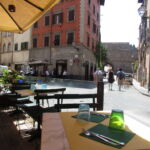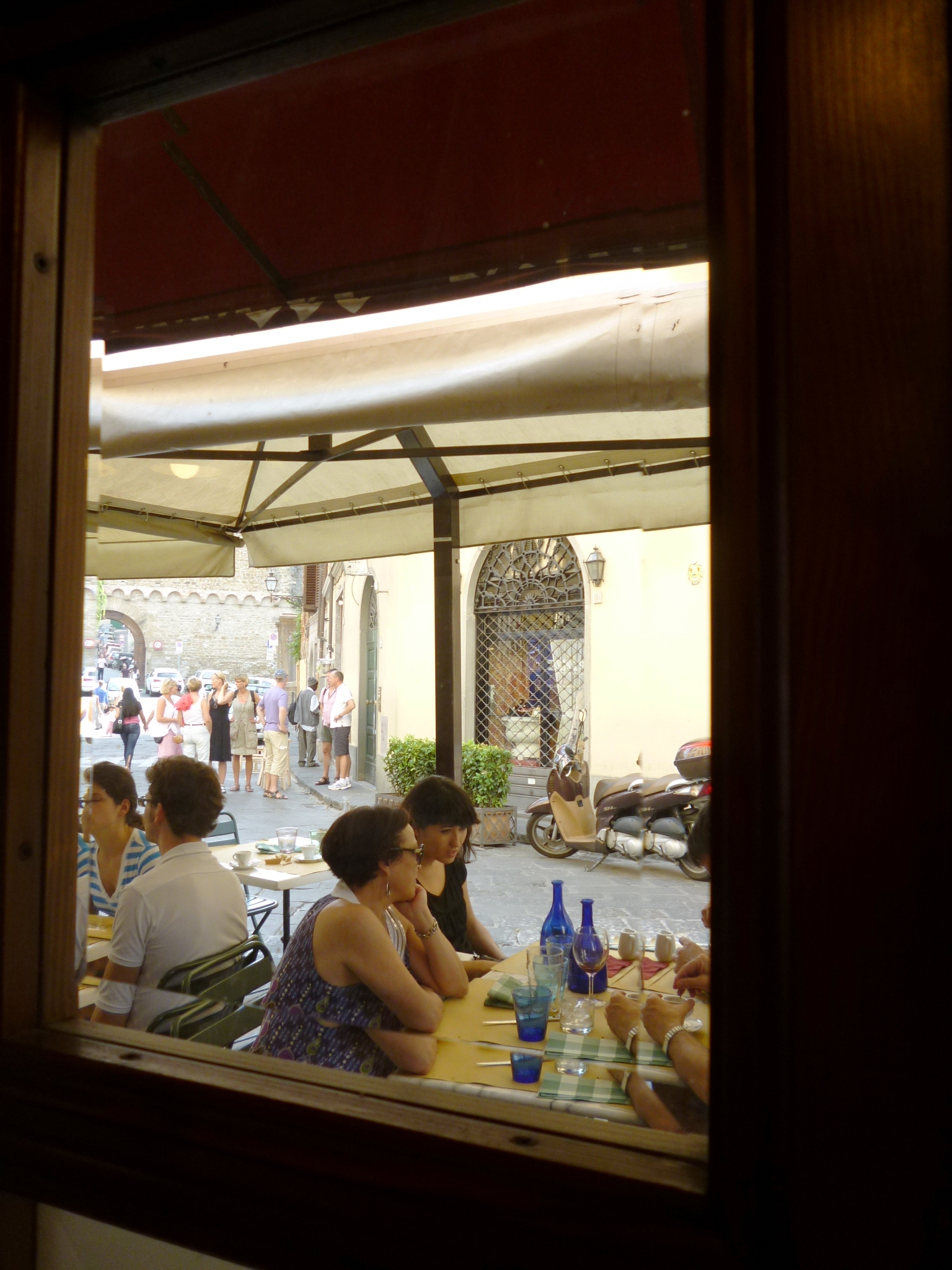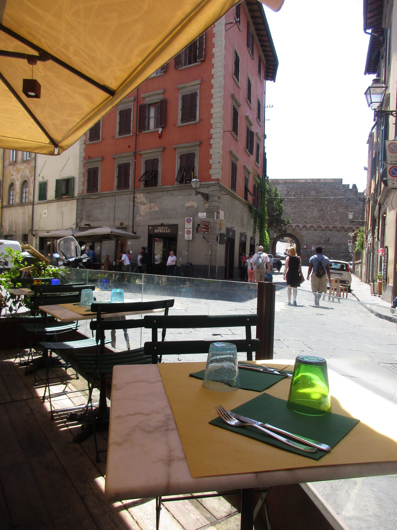春~秋はテラス席がおススメ。サン・ニッコロ教会の隣で、三叉路の中心にあるので、 下町地区であるこの界隈の様子を感じながら食事 ができます。前に見えるのは、サン・ミニアート門。ここを出て坂を上っていくと、ミケランジェロ広場&サン・ミニアート教会に着きます。