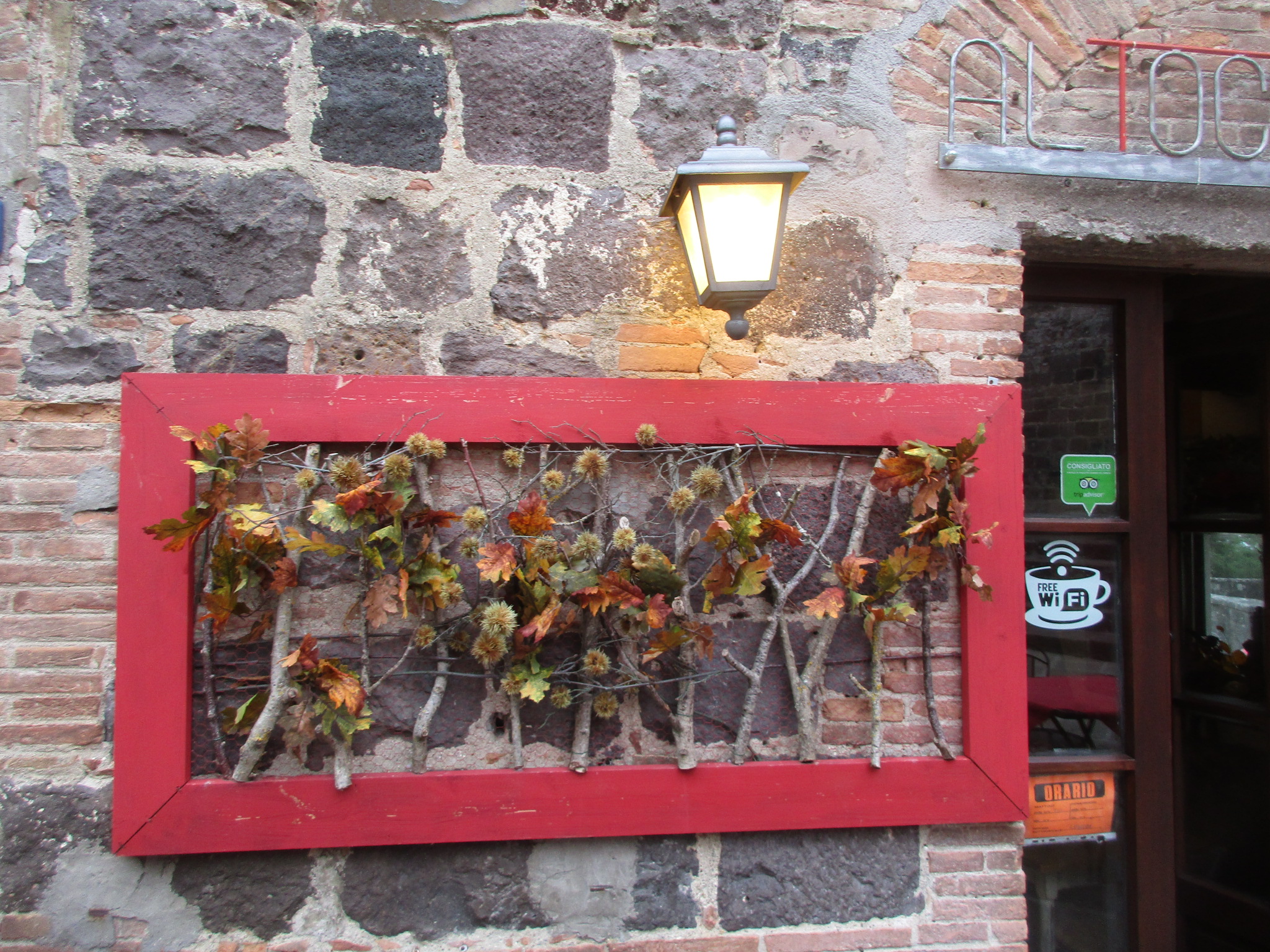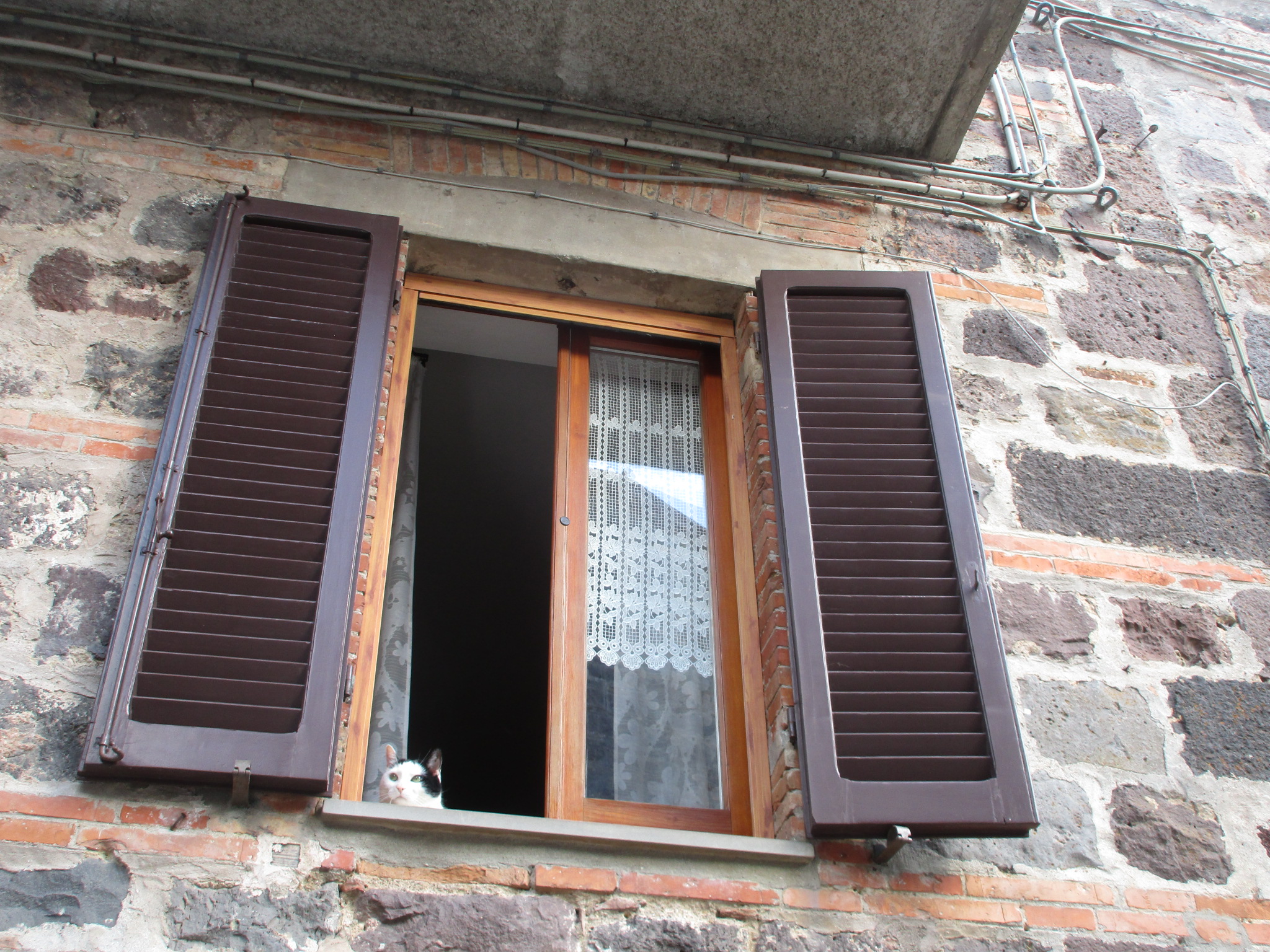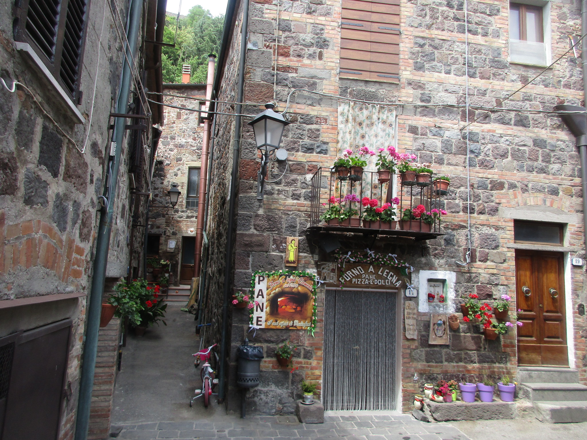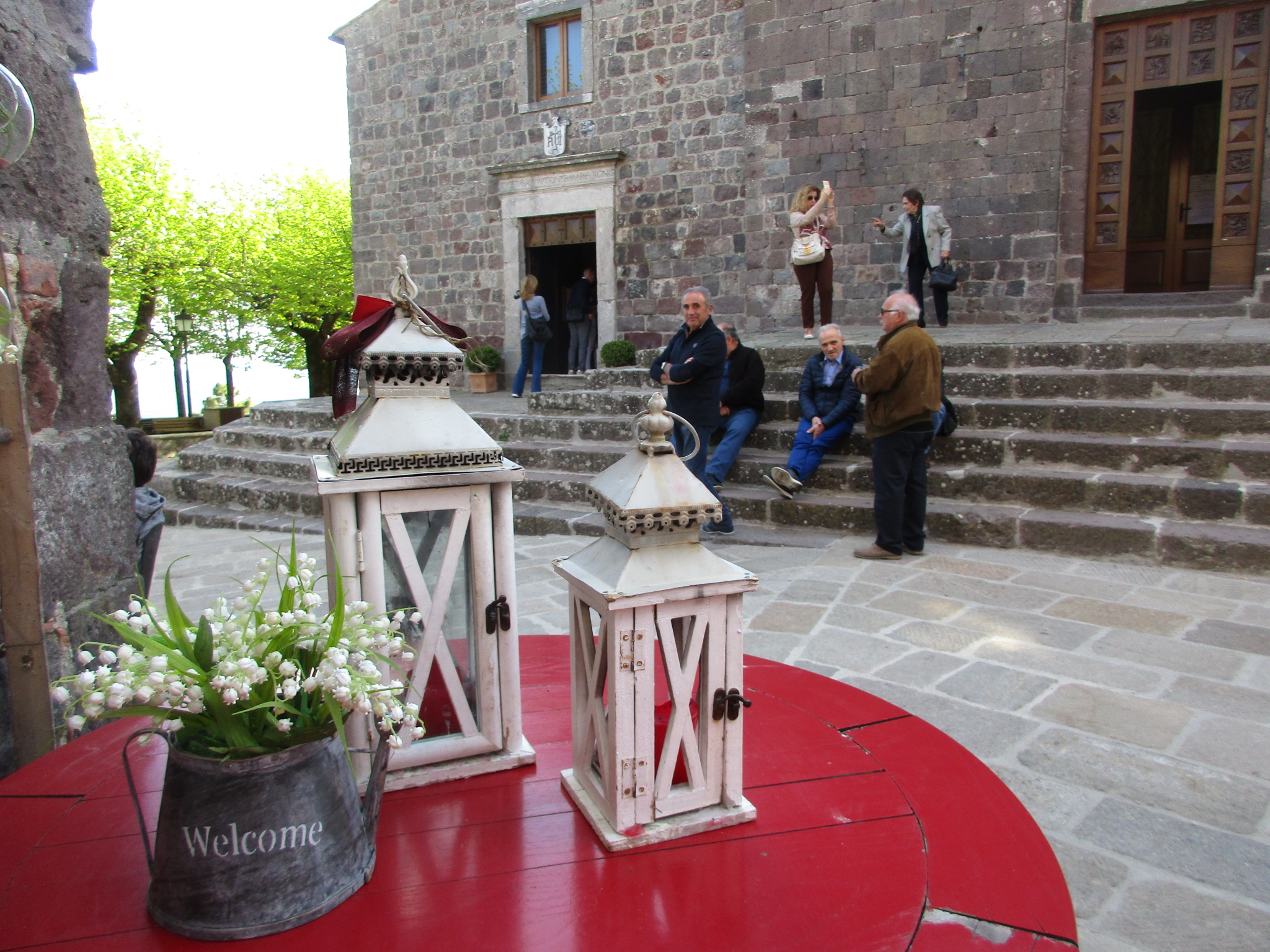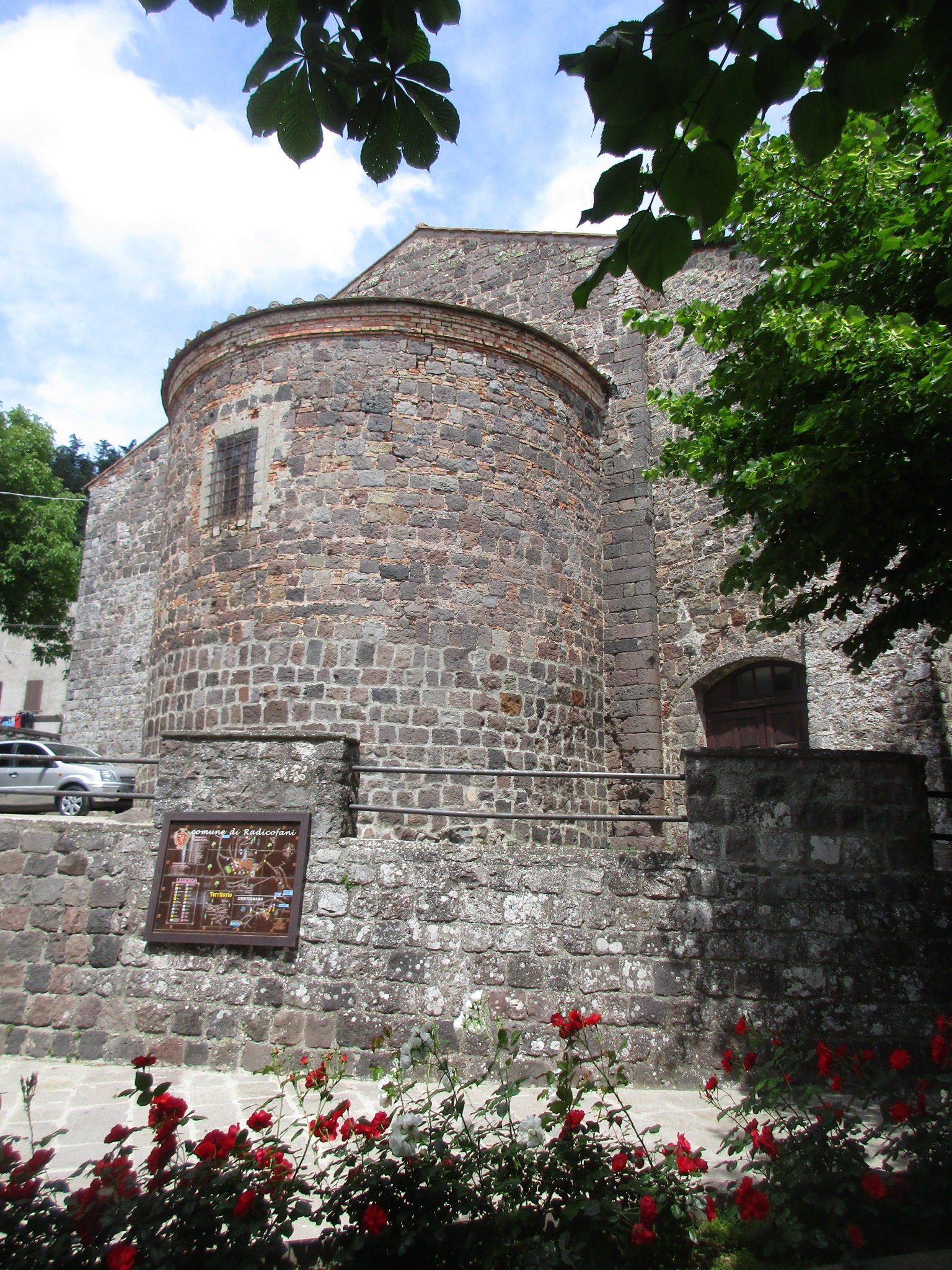 まずは村の中心であるサン・ピエトロ広場から。ここの一方は城壁に沿うように公園になっており、ここからアミアータ山やオルチャ渓谷のパノラマが楽しめます。そしてパノラマを背に左側がサン・ピエトロ・アポストリ教会。10~11世紀頃に建設が開始されましたが、すぐに拡大・改築が行われ、記録では1224年に完成。現在ではロマネスク・ゴシック様式の3身廊の教会となっています。入って右側には、フィレンツェの捨て子養育院などでも作品を残す、アンドレア・デッラ・ロッビアの聖母子像が、祭壇にも彩色テラコッタの十字架像があります。
