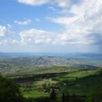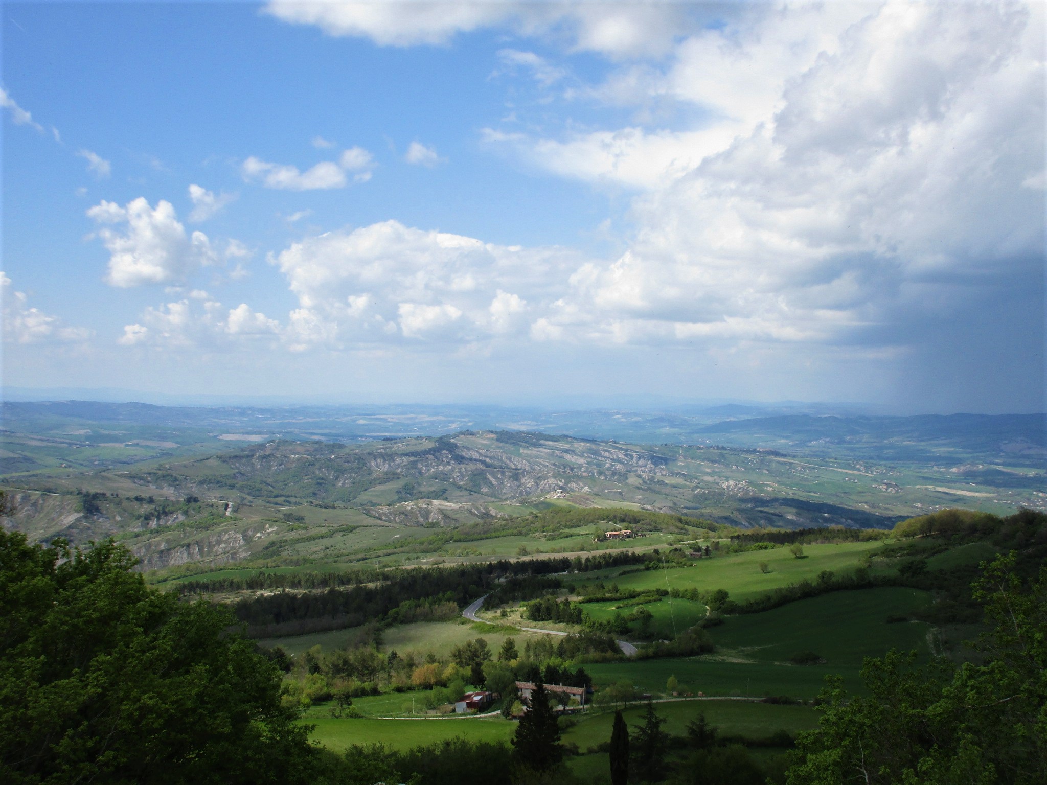 オルチャ渓谷の5つの市(ピエンツァ、モンタルチーノ、サン・クリーリコ・ドルチャ、カスティリオーネ・ドルチャ、ラディコーファニ)で一番南に位置し、一番高い所にあるのがラディコーファニです。周りに高いモノがなくぽっかり浮かんでいて、道中からはこんな風に近づいてきます。