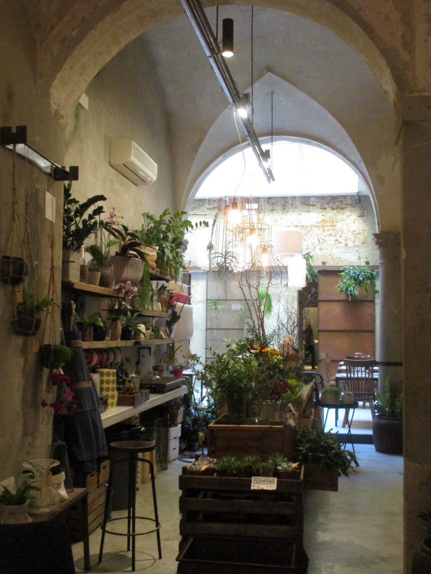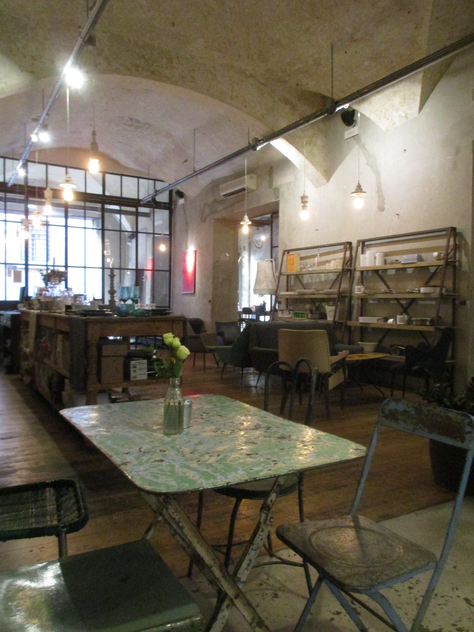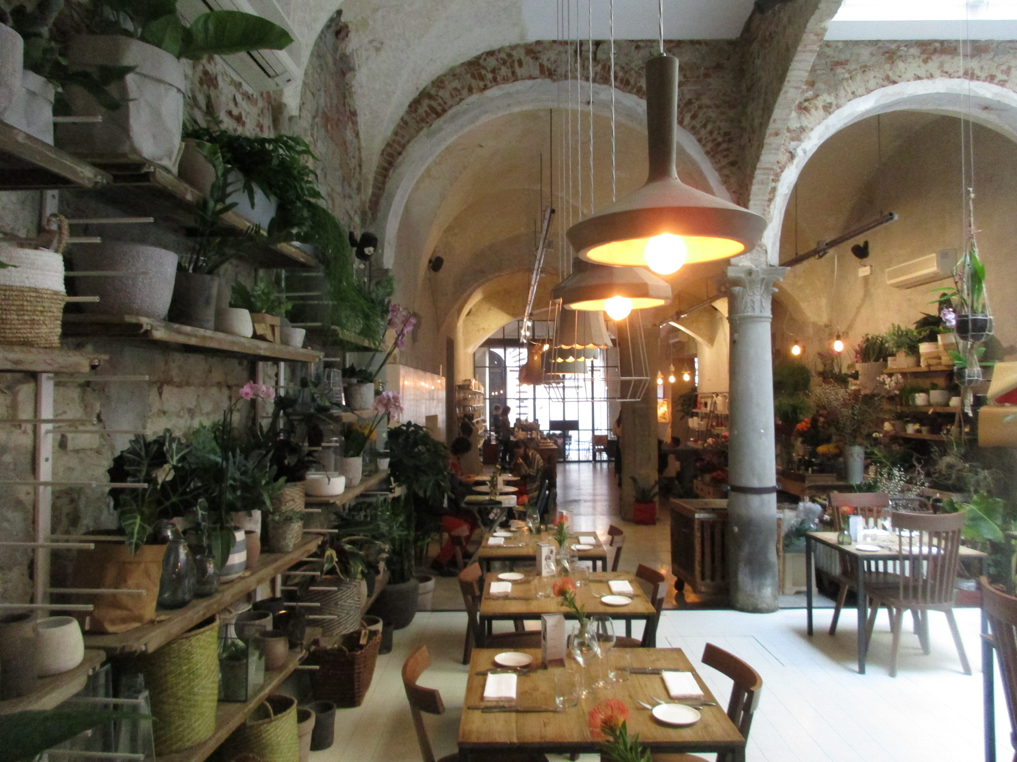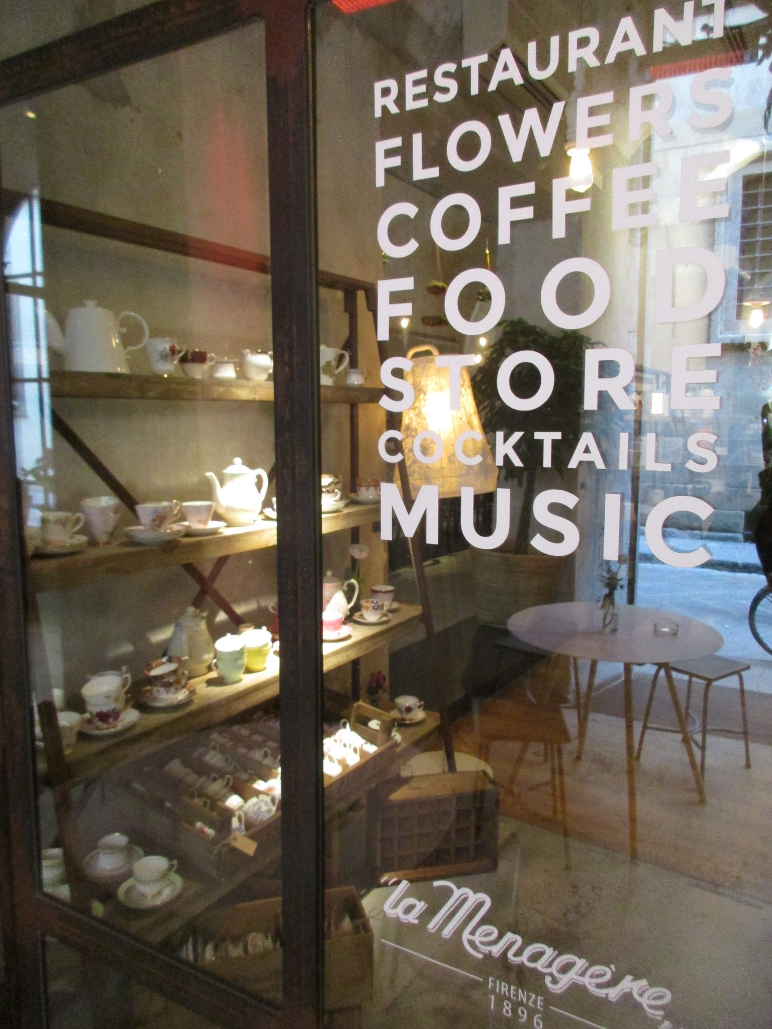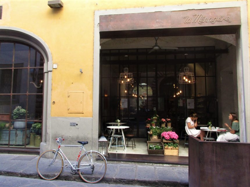 まず1つ目はサン・ロレンツォ地区、リッカルディ宮殿の裏にあるLa Ménagère。元は1896年に開店した同名の老舗家庭雑貨店があった場所で、近年「コンセプトレストラン」として再オープンしました。外席も少しありますが、中はとても広く、入ってすぐは注文カウンタとテーブル席、奥はソファーのある小さい部屋、左は雑貨や花の売り場もあるテーブル席、更にその左にテーブル席と奥にもテーブル席があります。