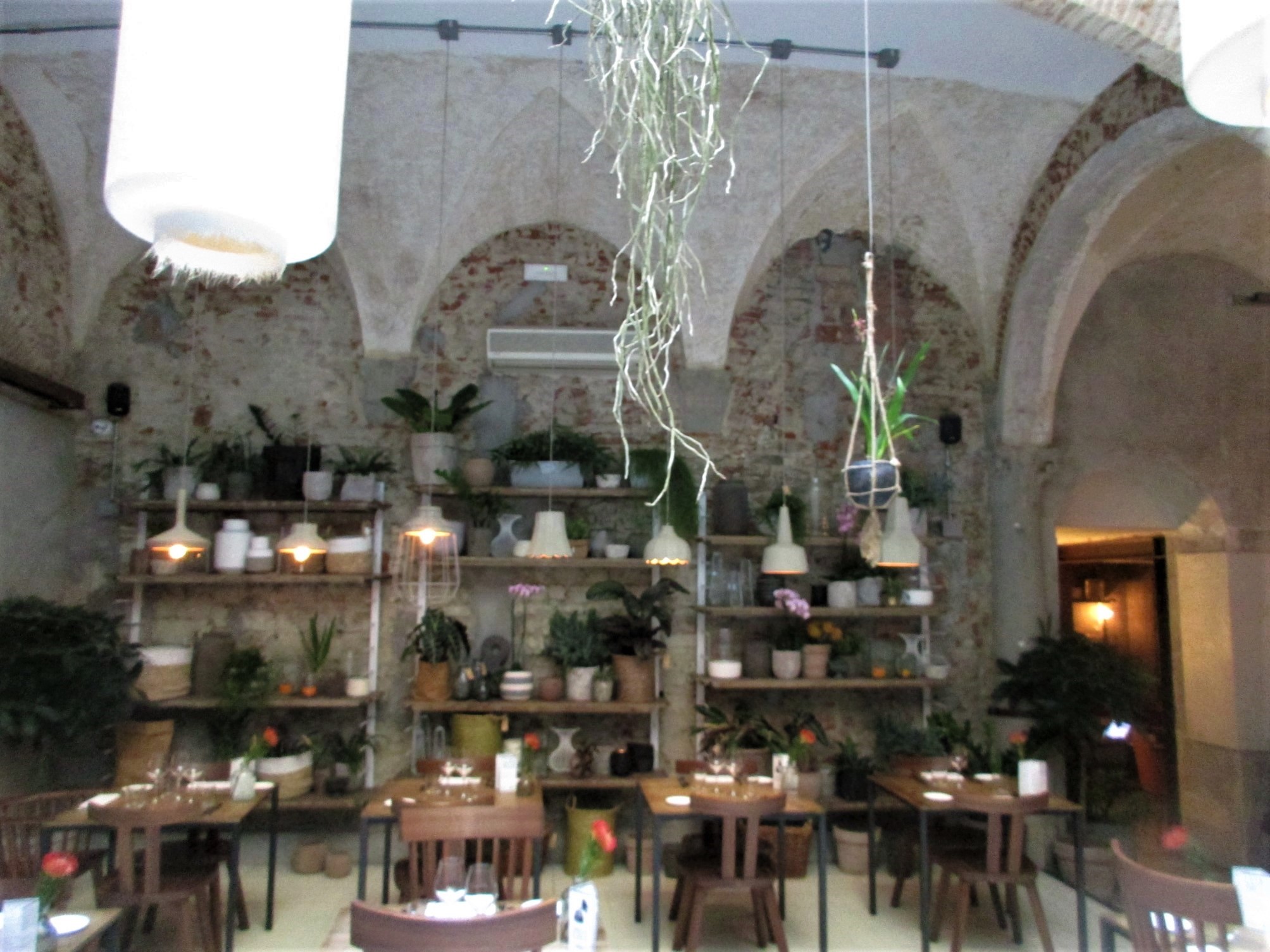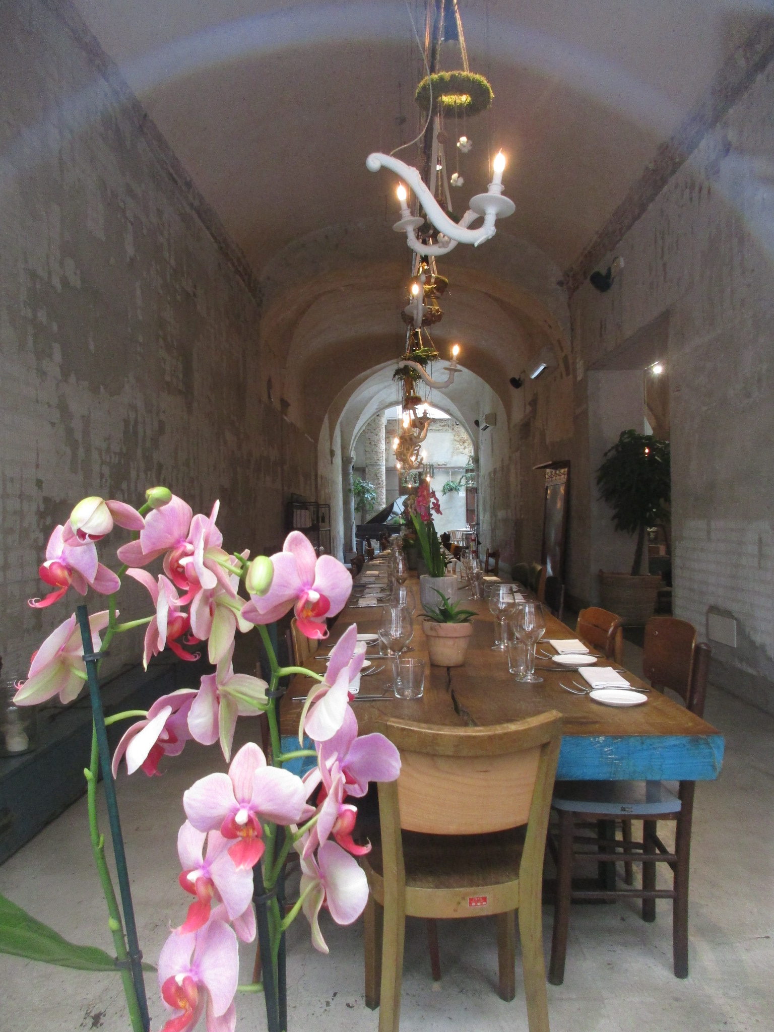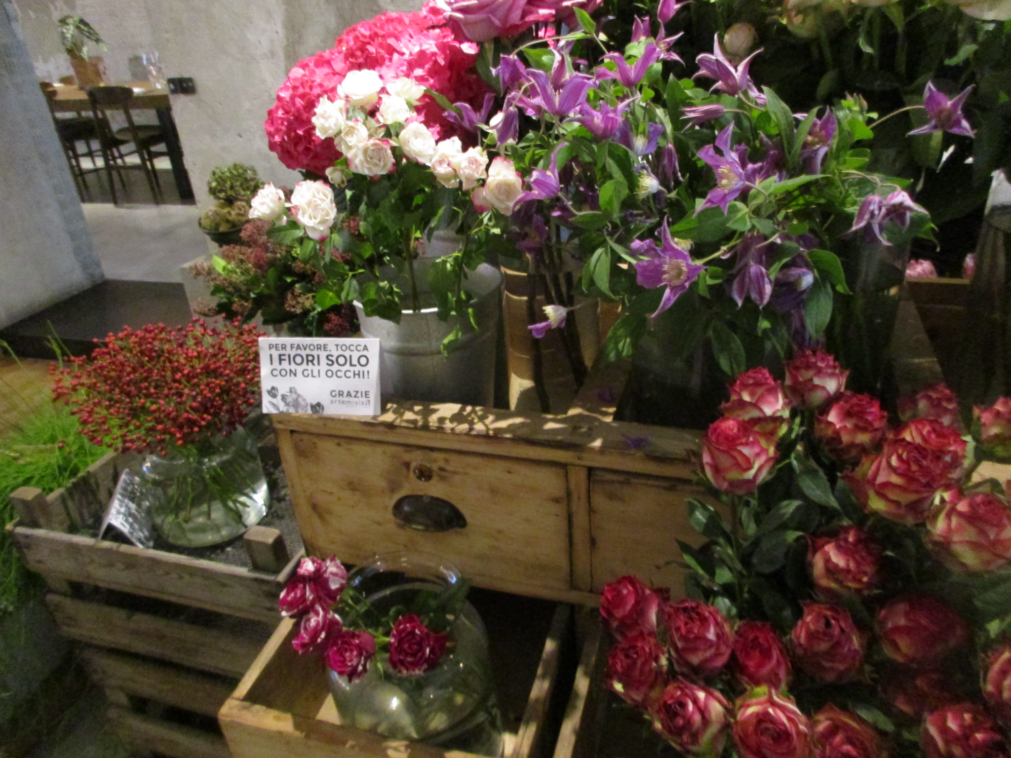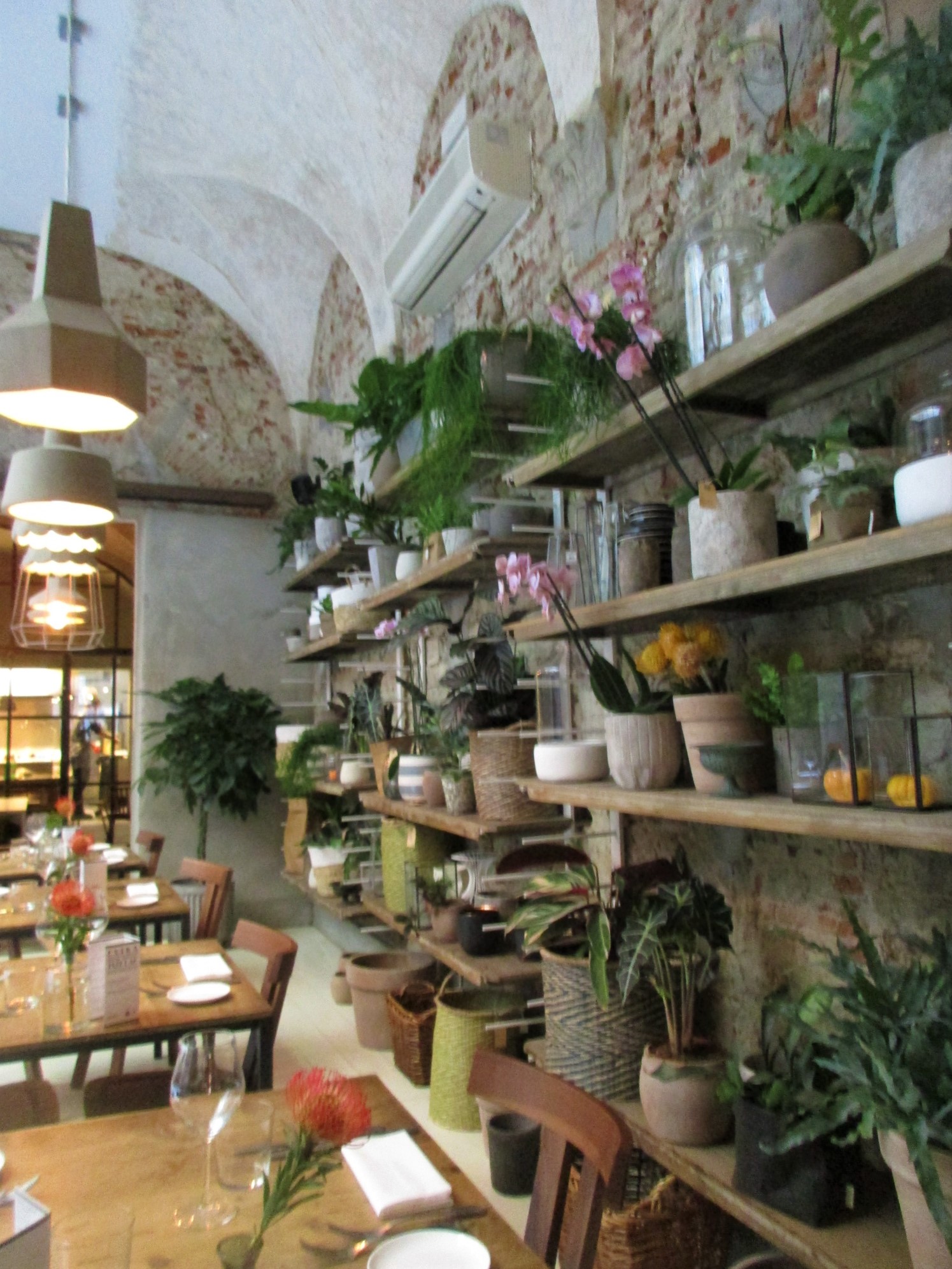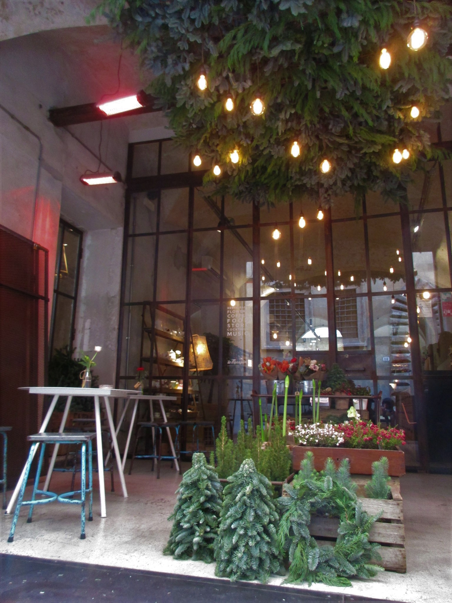 まず1つ目はサン・ロレンツォ地区、リッカルディ宮殿の裏にあるLa Ménagère。元は1896年に開店した同名の老舗家庭雑貨店があった場所で、近年「コンセプトレストラン」として再オープンしました。外席も少しありますが、中はとても広く、入ってすぐは注文カウンタとテーブル席、奥はソファーのある小さい部屋、左は雑貨や花の売り場もあるテーブル席、更にその左にテーブル席と奥にもテーブル席があります。