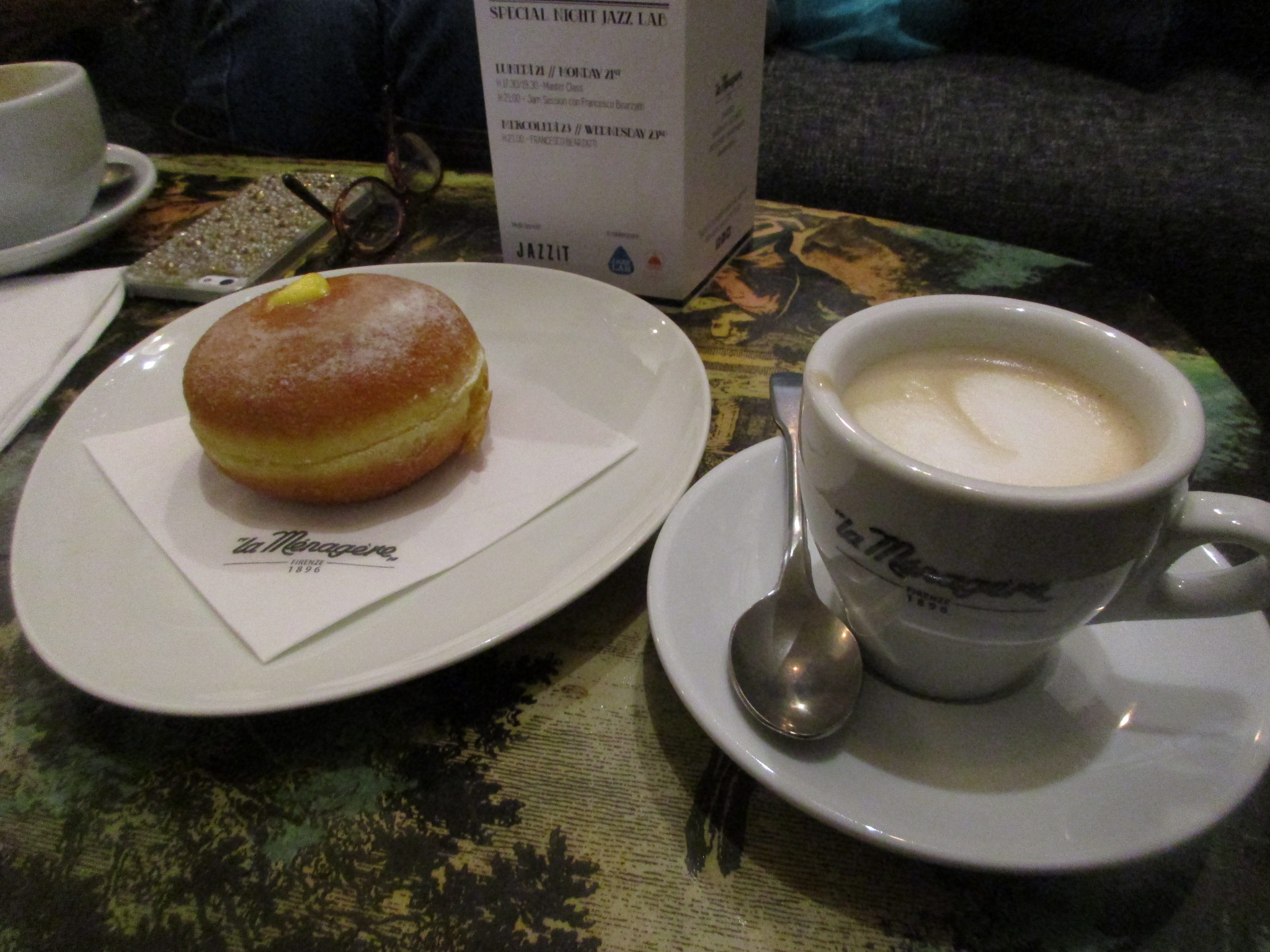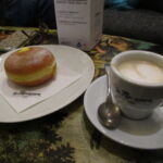 お茶する場合はまずカウンターへ・・・美味しそうなスイーツもずらり!そしてイタリアのバール朝ごはんに必須のブリオッシュ(クロワッサン)や写真のボンボローネ(カスタードクリームの入った揚げパン)などもあります。ここでオーダーしてお会計をしたら、店員さんが席に運んでくれます。ここは座っても他の立ち飲みバールより、2割り増しくらい。ゆっくりお茶するなら、全然高い料金ではありません。