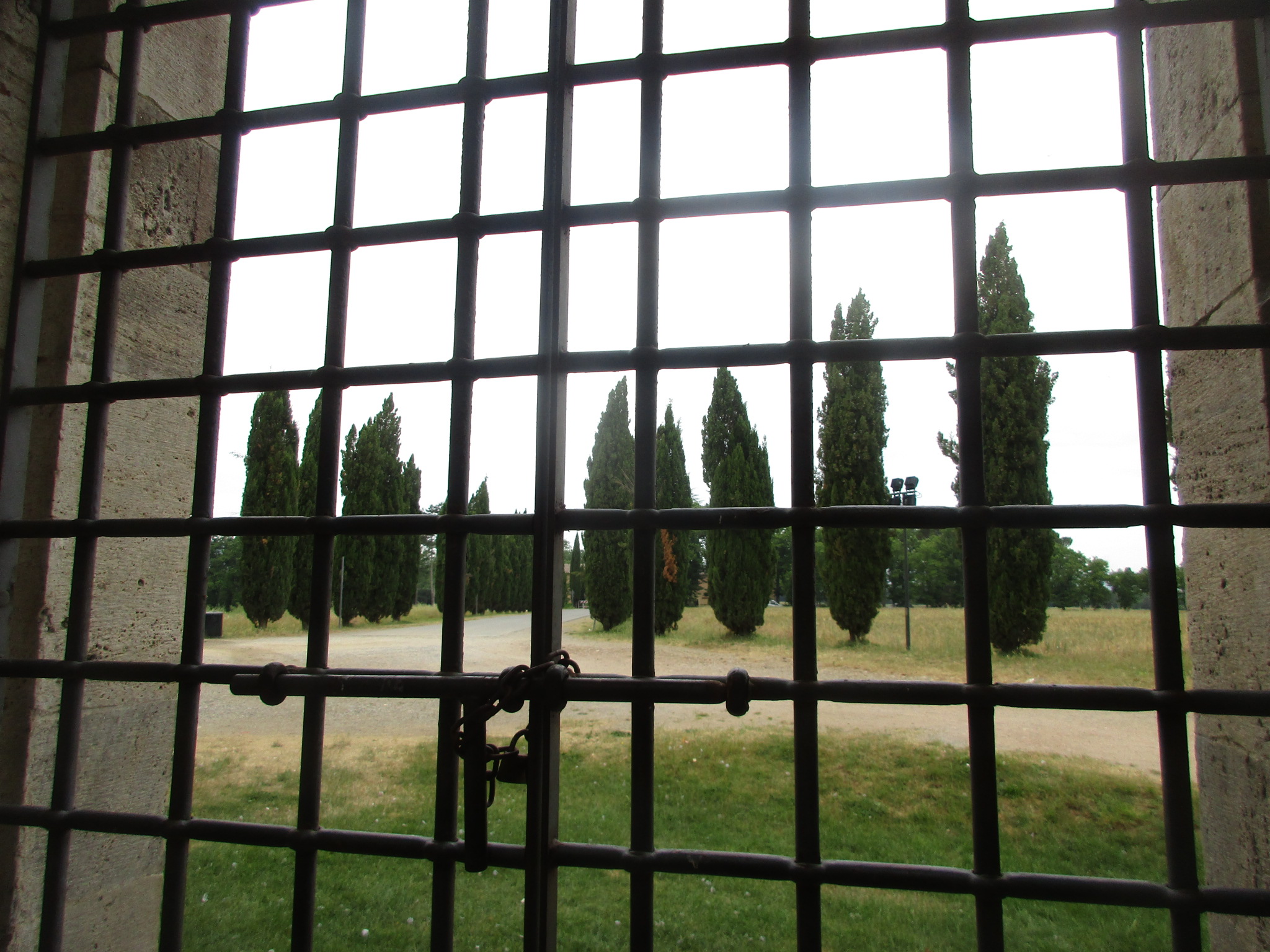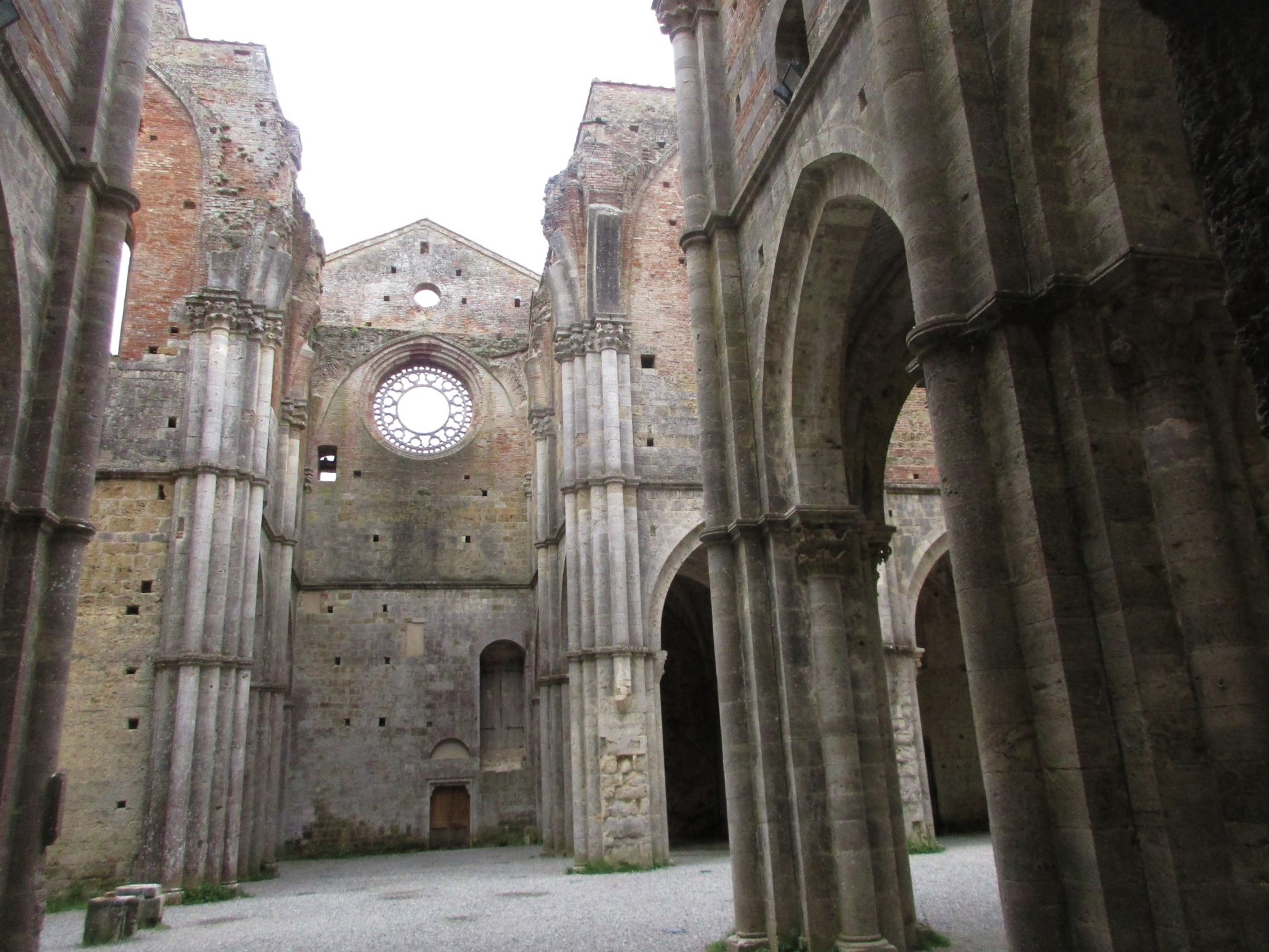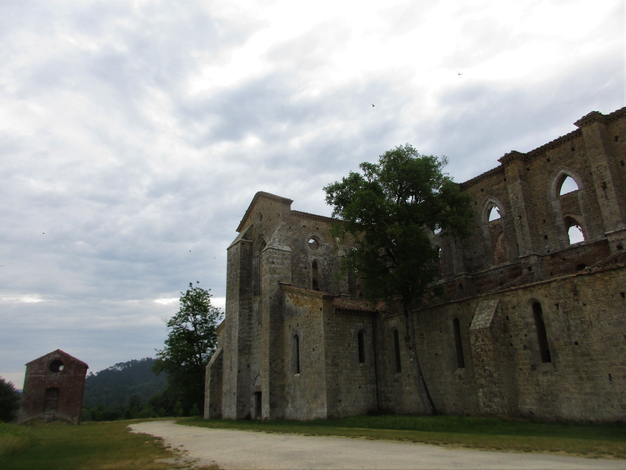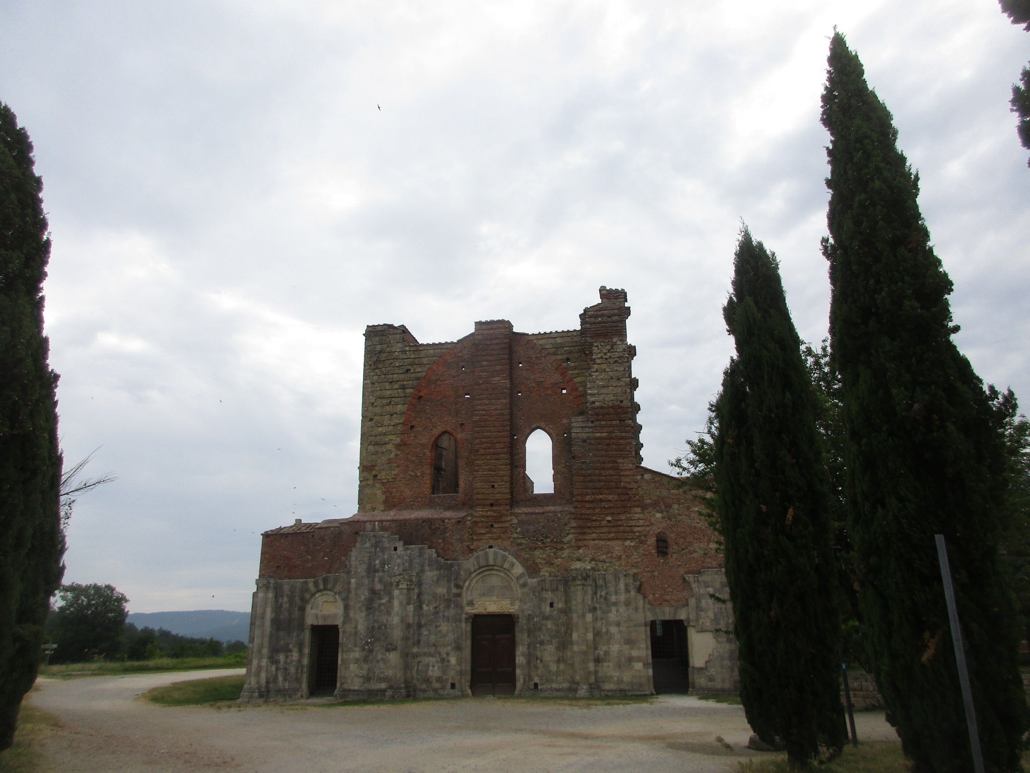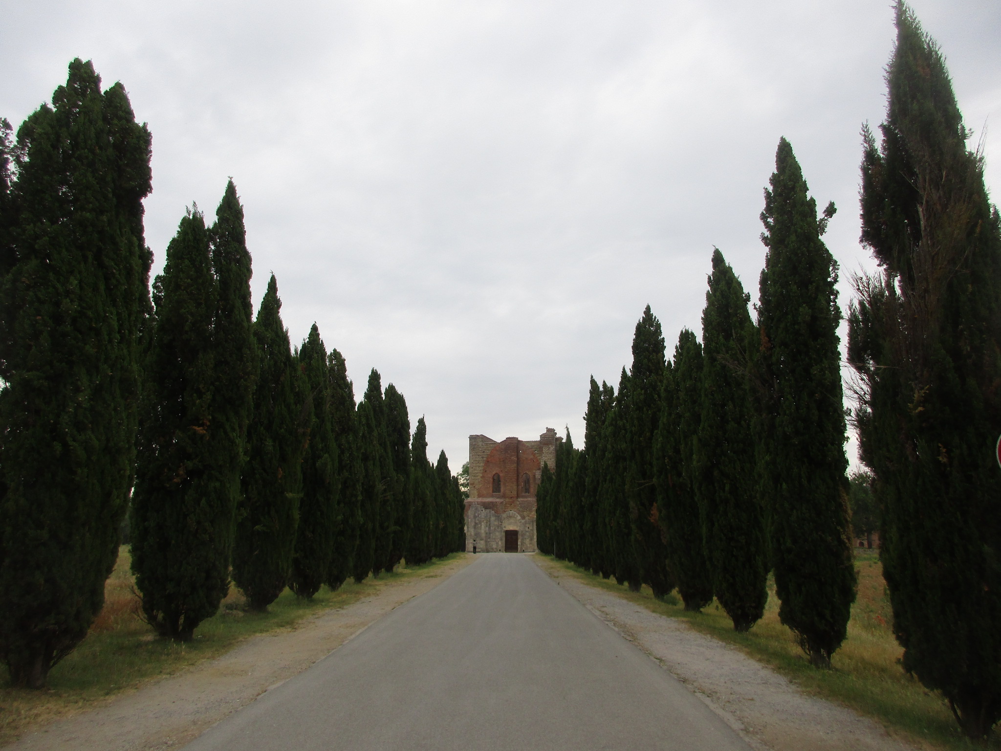 シエナから南西に約30キロ、何にもない田舎の県道から少し入ったところにぽつんと立っているのが、このサンガルガーノ修道院。ぽつん、と見えるのは最後の直線に入る前だけで、近づくにつれ、その大きさが分かるようになります。