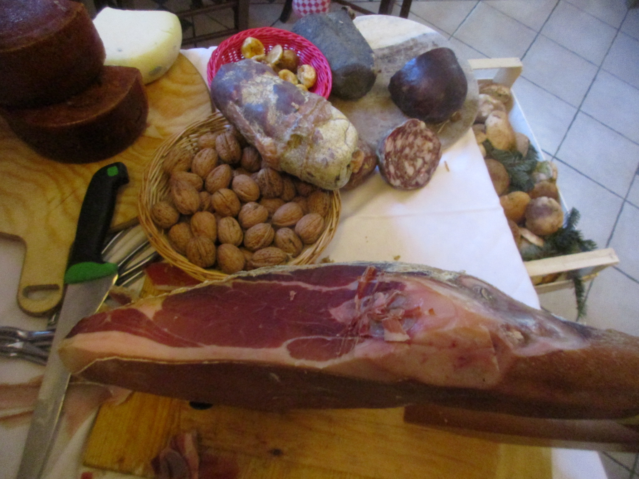 前菜はまだまだ続き、生ハム。ただの生ハムでなく、シェフが自ら作った生ハム、これが店の一角に置かれていて、その場でスライスしてくれるんです。トスカーナの生ハムは一般的に塩がきついんですが、ここのはとてもまろやかで舌でとろける美味しさ。シェフに製法を聞くと、なんとサクラのチップで燻製しているそうです。