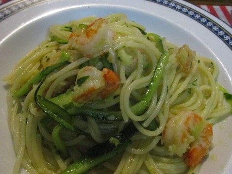 ◎エビ・10~20頭 ◎ズッキーニ・1本 ◎にんにく・2かけ ◎スパゲッティ・320g ◎オリーブオイル、白ワイン、塩・適量