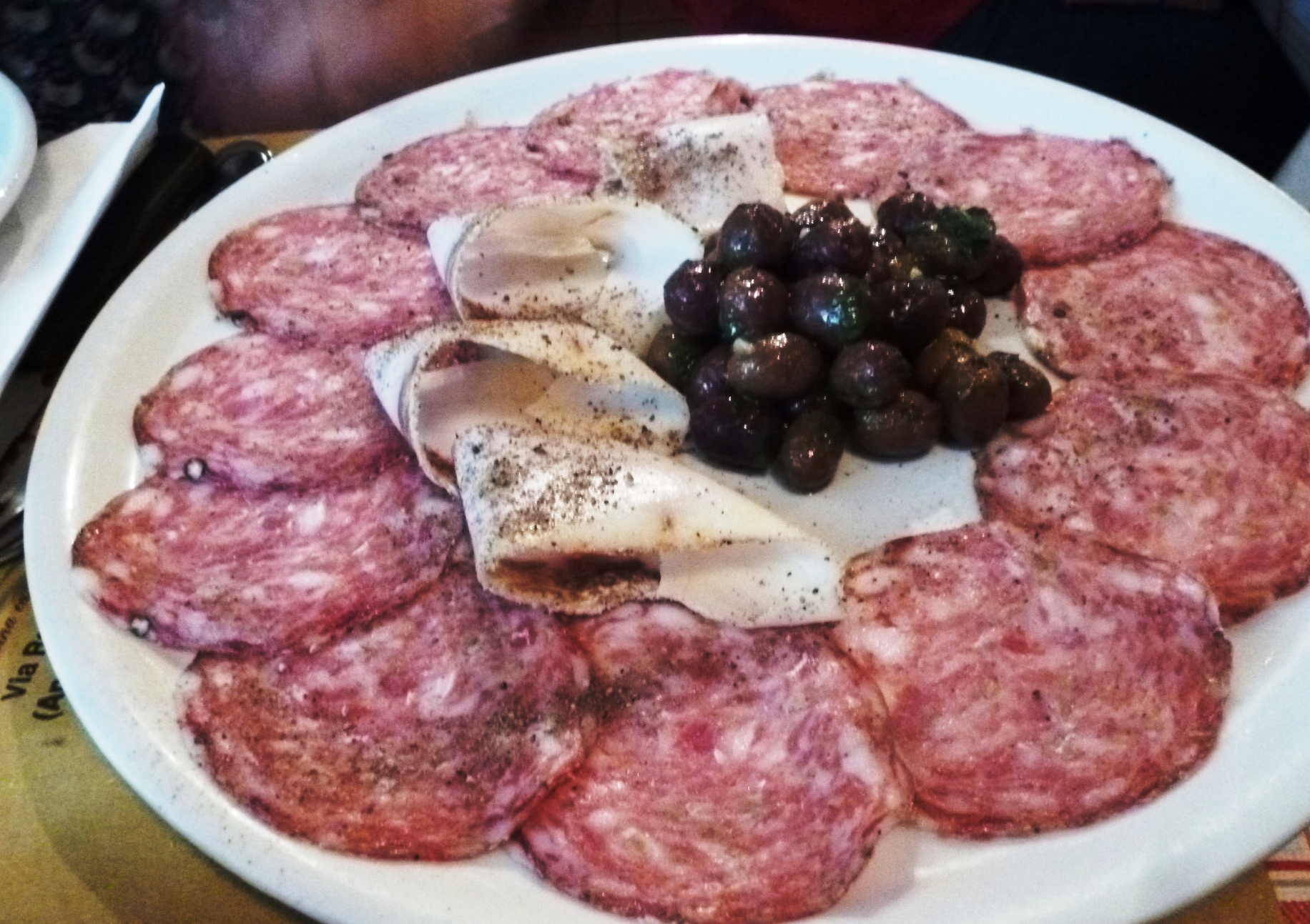 さて、注文ですが、こういうところは ちゃんとしたメニューはありません。外に貼ってるメニューか、カウンターに貼ってるメニューを見て・・・イタリア語のみ、さらに在住者でも時に手を焼く手書き!あるいは、テーブルで口頭で。カメリエーレが英語OKかは不明でしたが、 隣の人の指差してこれ~とかもアリ です。残念だったのは、 トスカーナ料理では必須のレバーパテのクロスティーニがなかった こと。これは何故なのか不明・・・ともあれ、まずは前菜もってことで、 トスカーナのハム・サラミ盛り合わせ 。多そうだったので、2人分で頼んだのに・・・どやっ!って量。