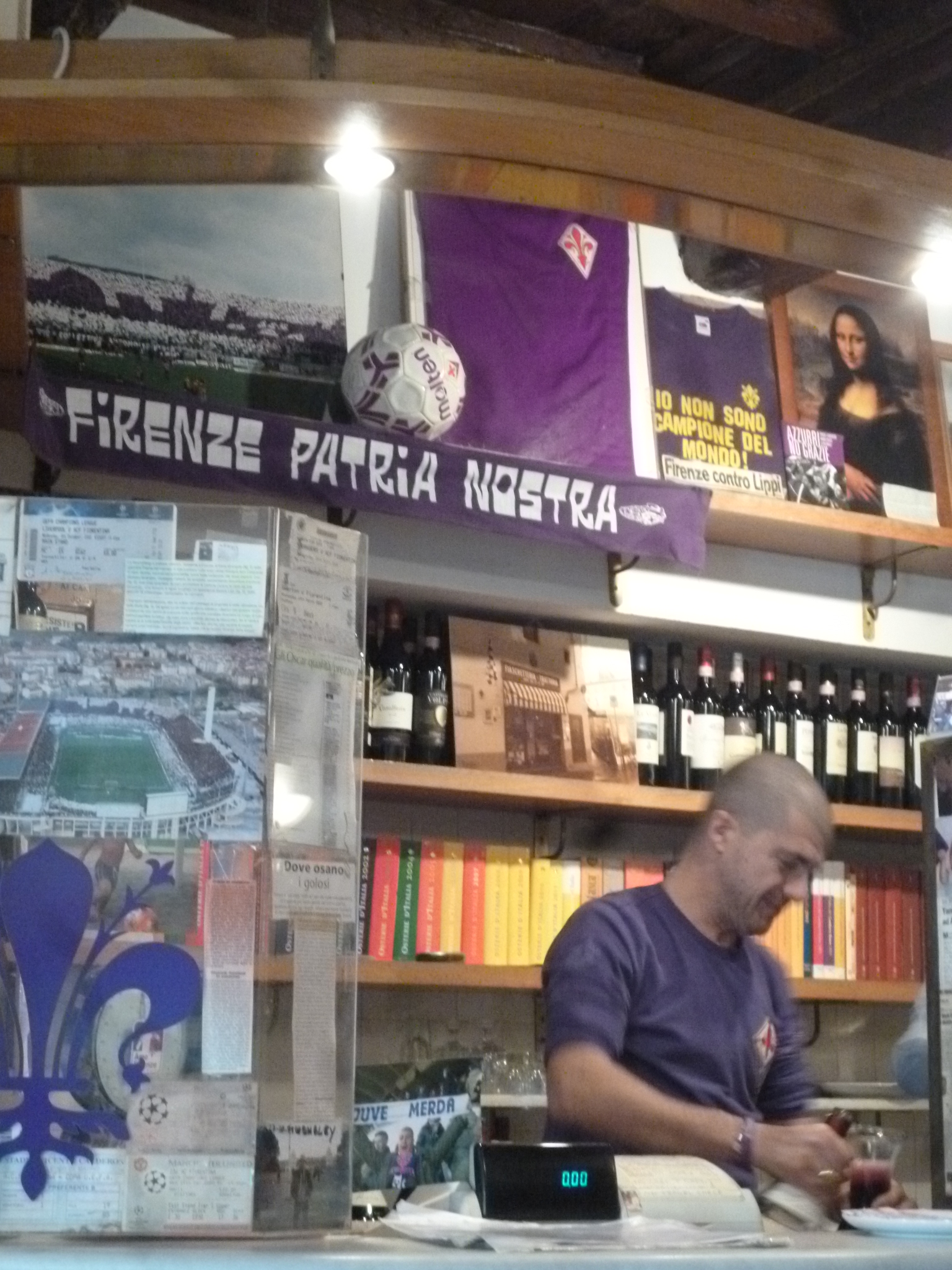 そして厨房から ダンダン! と音がしたかと思ったら、 フィレンツェ風ビステッカ(Tボーンステーキ)を切っている音 で、それを炭火焼きコーナーに持ってくスタッフが行き来したり(それがまたすんごいデカさ)、店内に飛び交うスタッフや常連客の話声はまさに フィレンツェ訛りベッタベタ。そして、忙しそうに動き回っていたこのオーナー?のお兄ちゃん、ぶっきらぼうかと思ったら、お会計の時はにこやかでなかなか感じも良いです。“JUVE MERDA(ユヴェントス、クソ)”と書いたTシャツを着てスタジアムにいるお兄ちゃんの写真が貼ってありますが、ユヴェントスファンの方はご立腹せぬよう・・・ただのフィレンツェ命なだけですので(笑)。