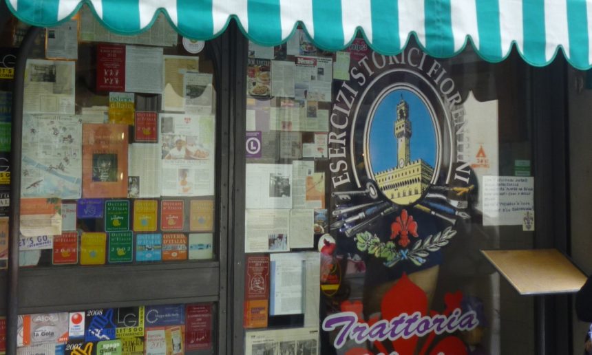 ウェイターも忙しく動き回っていて、回転は結構速いです。客層は観光客(日本人観光客もいた!後で店のサイトを見たら、フィレンツェ在住のライターさんが日本の雑誌で紹介してました)から地元の常連さんまで様々。店の外も、中も、店員さんのTシャツにも見えるのは 百合の紋章=フィレンツェのシンボル ・・・そう、まさにフィレンツェを愛する純血100%って感じがまたイイです。