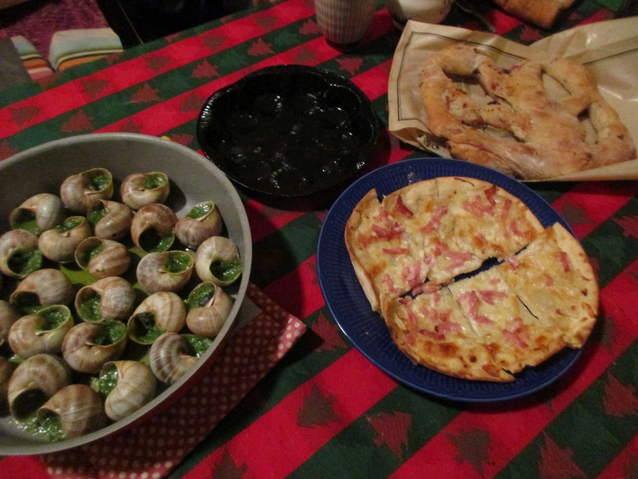 さすがフランス~!とうなったのが、エスカルゴ!普通にスーパーに売ってて、オーブン皿に入れてオーブンで焼くのみ!バジルソースも最初から入ってるのが楽チーンで、美味しい!ちなみに、その横はアルザス地方のピッツァみたいなもんらしいです。