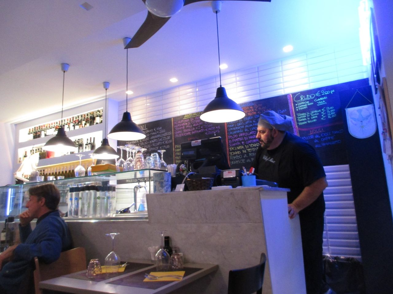 このでっかい(笑)シェフ・マックスのお店は、アルノ川向こうのサント・スピリト地区にあります。ここは仕入れによってメニューが変わり、カウンターに並べられた魚を選んでオーダーもできるそうですが