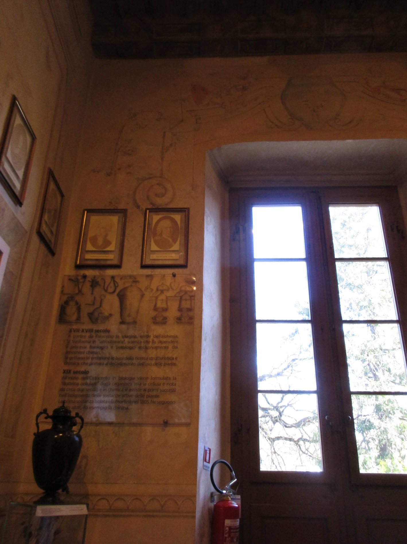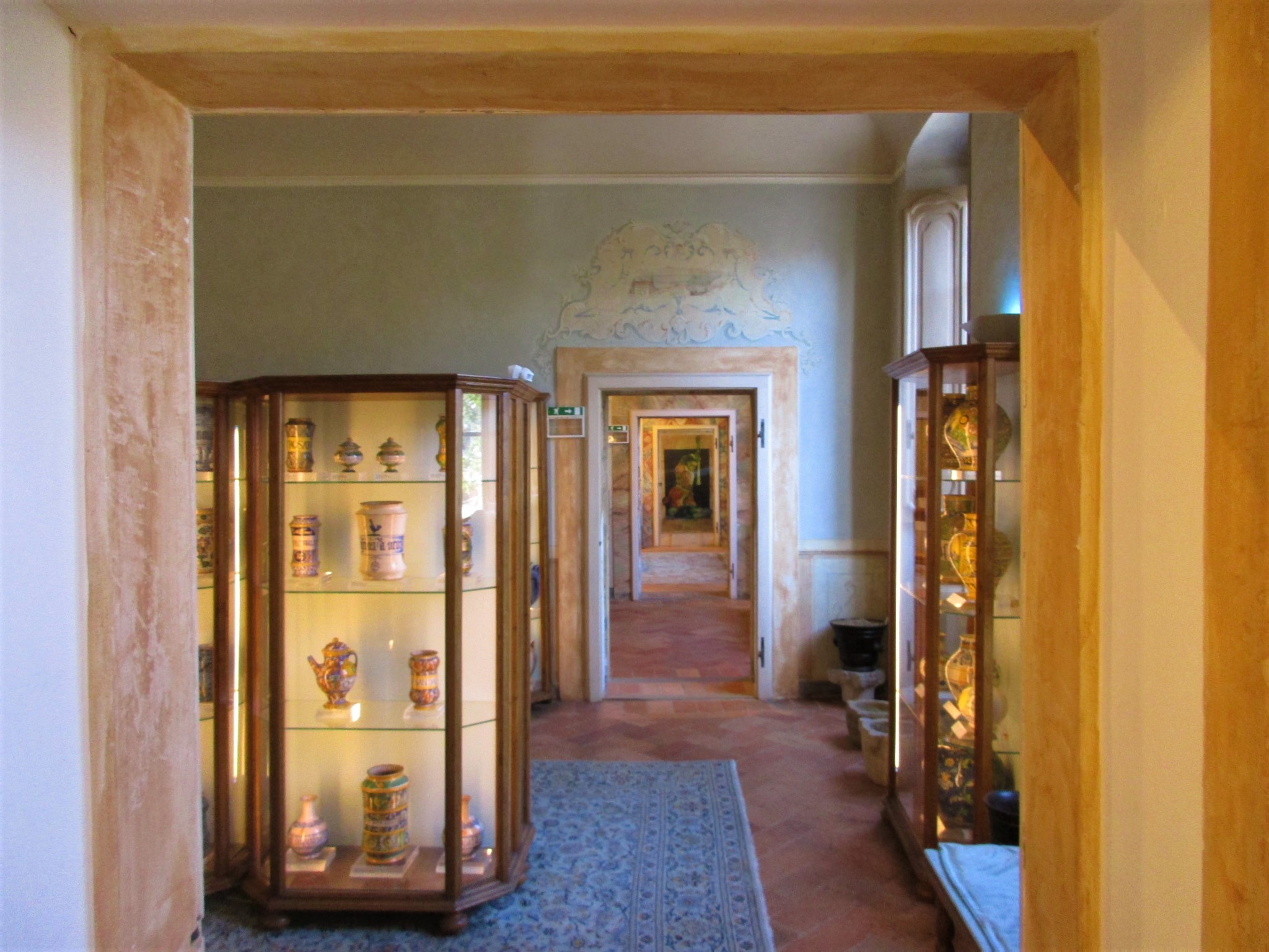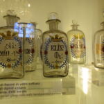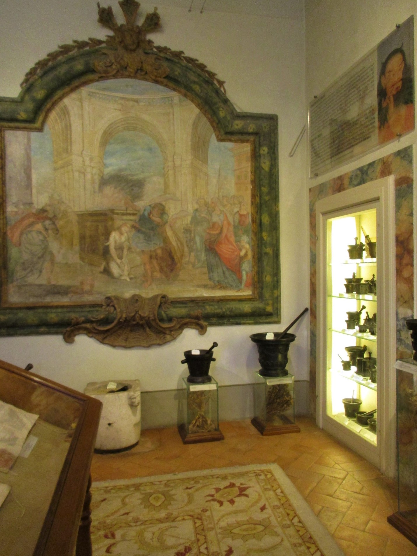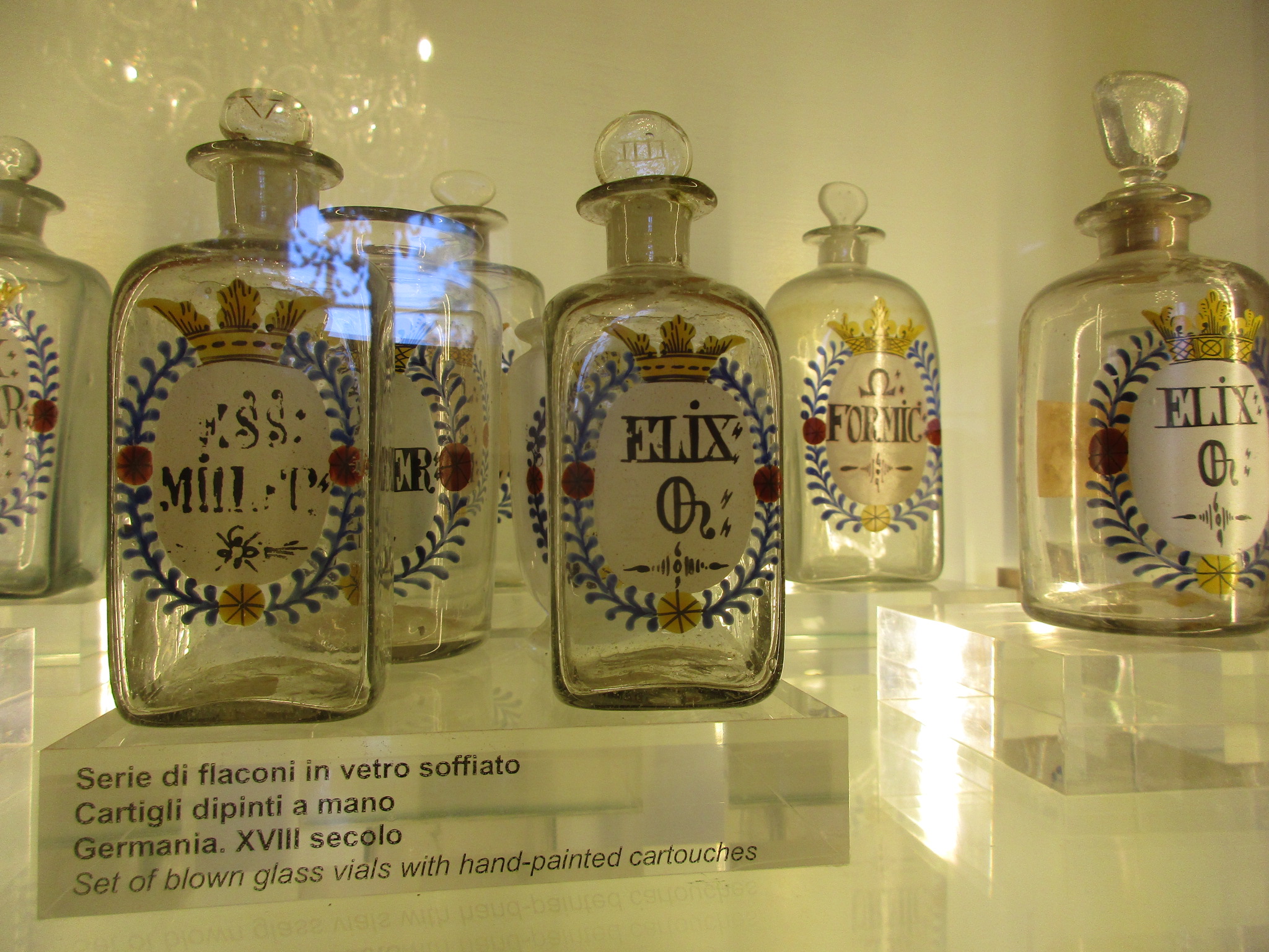 陶器の間では、ルネサンス期からの芸術的発展と、薬草を保存する機能的発展が融合した作品たちが。トスカーナを始めとしたイタリア中部の作品が展示のメインとなっています。そのお隣は、ガラスの間。ガラスは古代エジプトから使用され、イタリアではヴェネツィアを中心に中世より芸術的ガラスが作られてきました。ここに展示されているものは医薬に関連するものですが、手作業でつくられた渦巻き装飾など芸術的価値も高い1700年代の作品は、入口右に展示されています。