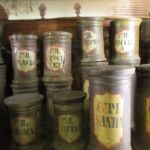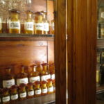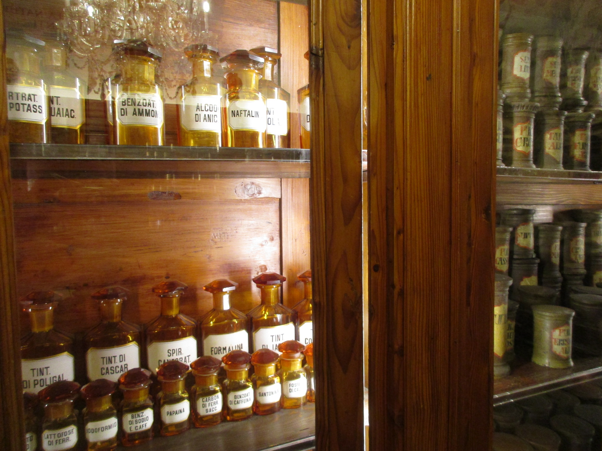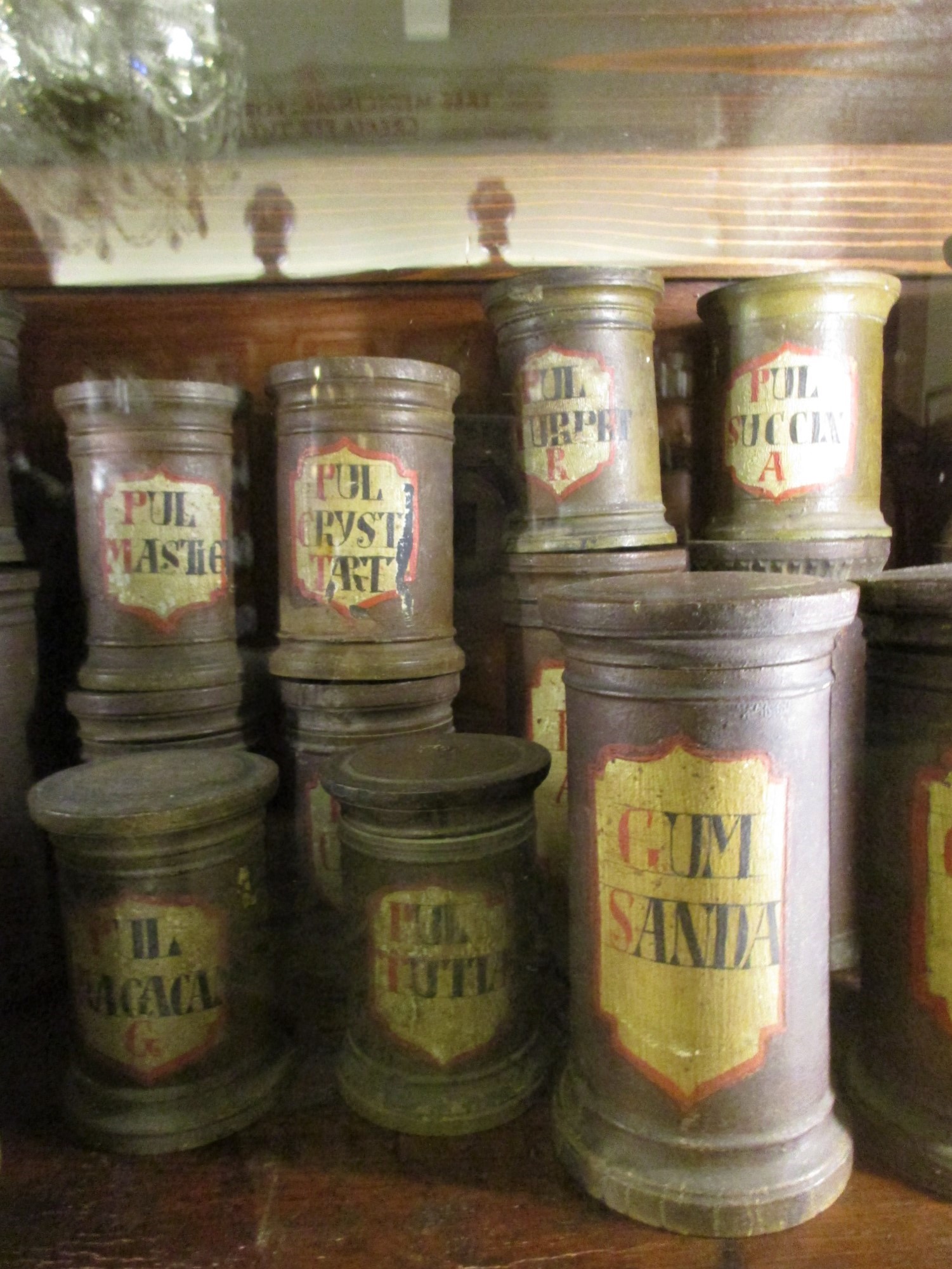 乳鉢の部屋のお隣は1800年代の薬局を再現した間。こちらも1800年代のそのままの松製の家具、レトロなボトルにうっとり・・・
