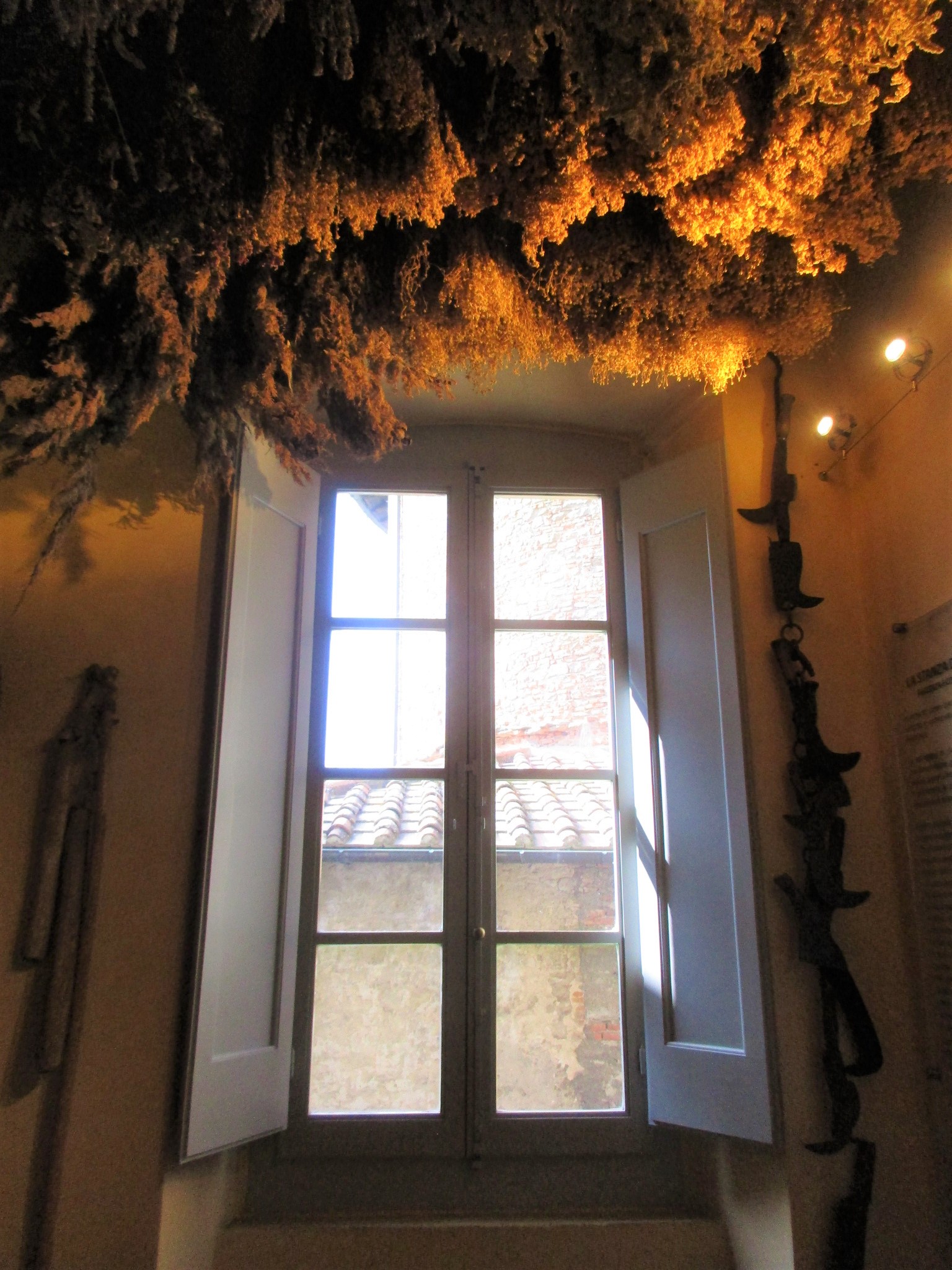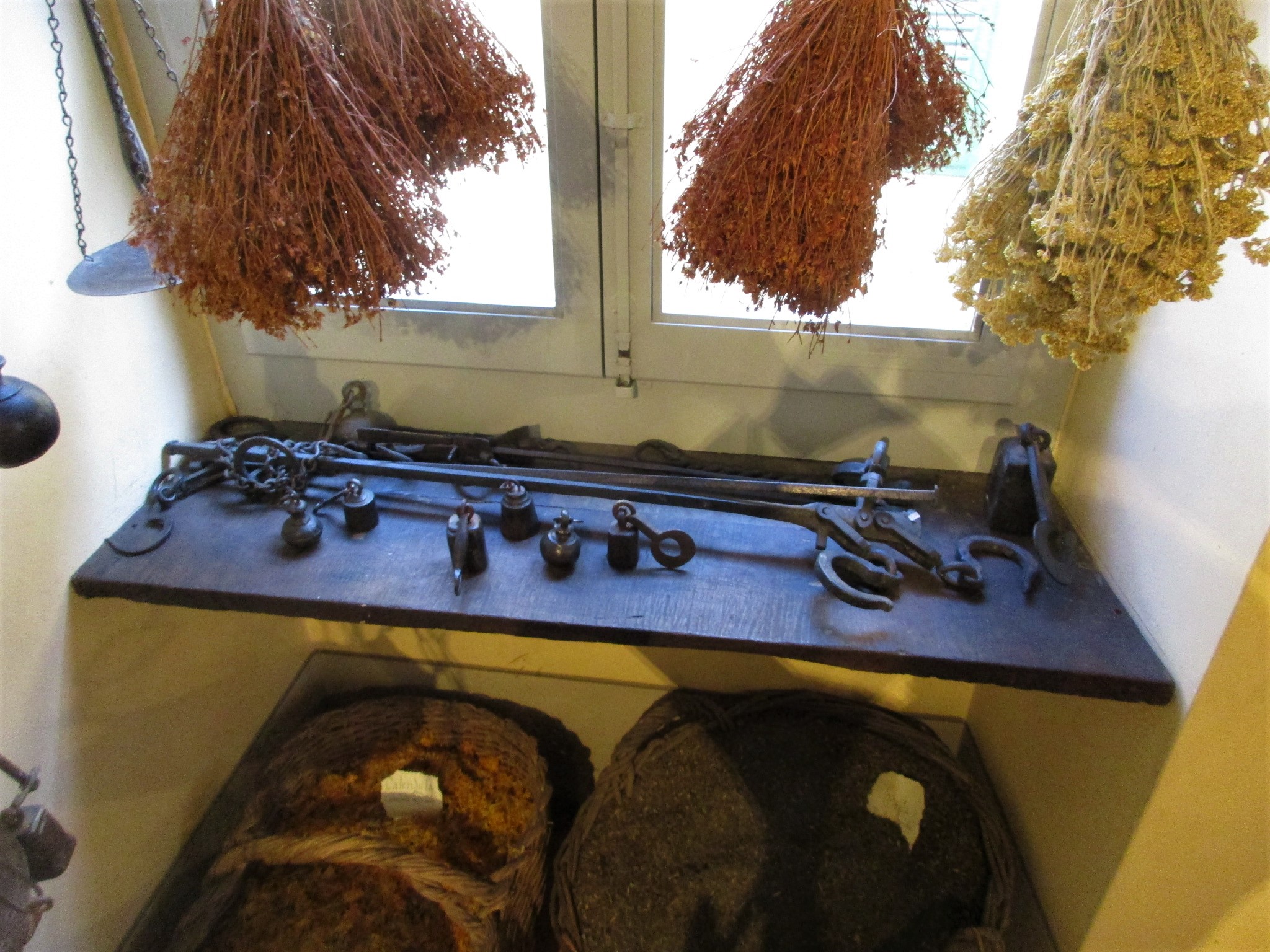 そして薬草の間。天井からいろんな種類のドライ植物が吊り下げられていますが、ラベンダーやカモミールなどは今でもお馴染みのもの~昔から利用されていたんですね。薬草を収穫する器具や保管する箱なども展示されています。