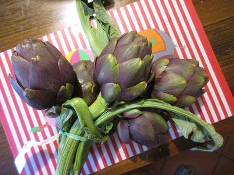 私の大好きなイタリア野菜・アーティチョークが最盛期!スーパーではアンティチョーク山盛りに積まれています。この日は5つ1.43ユーロと大特価だったので、もちろん買ってきましたよ。マンマレシピも良いけど、今日は生で・・・