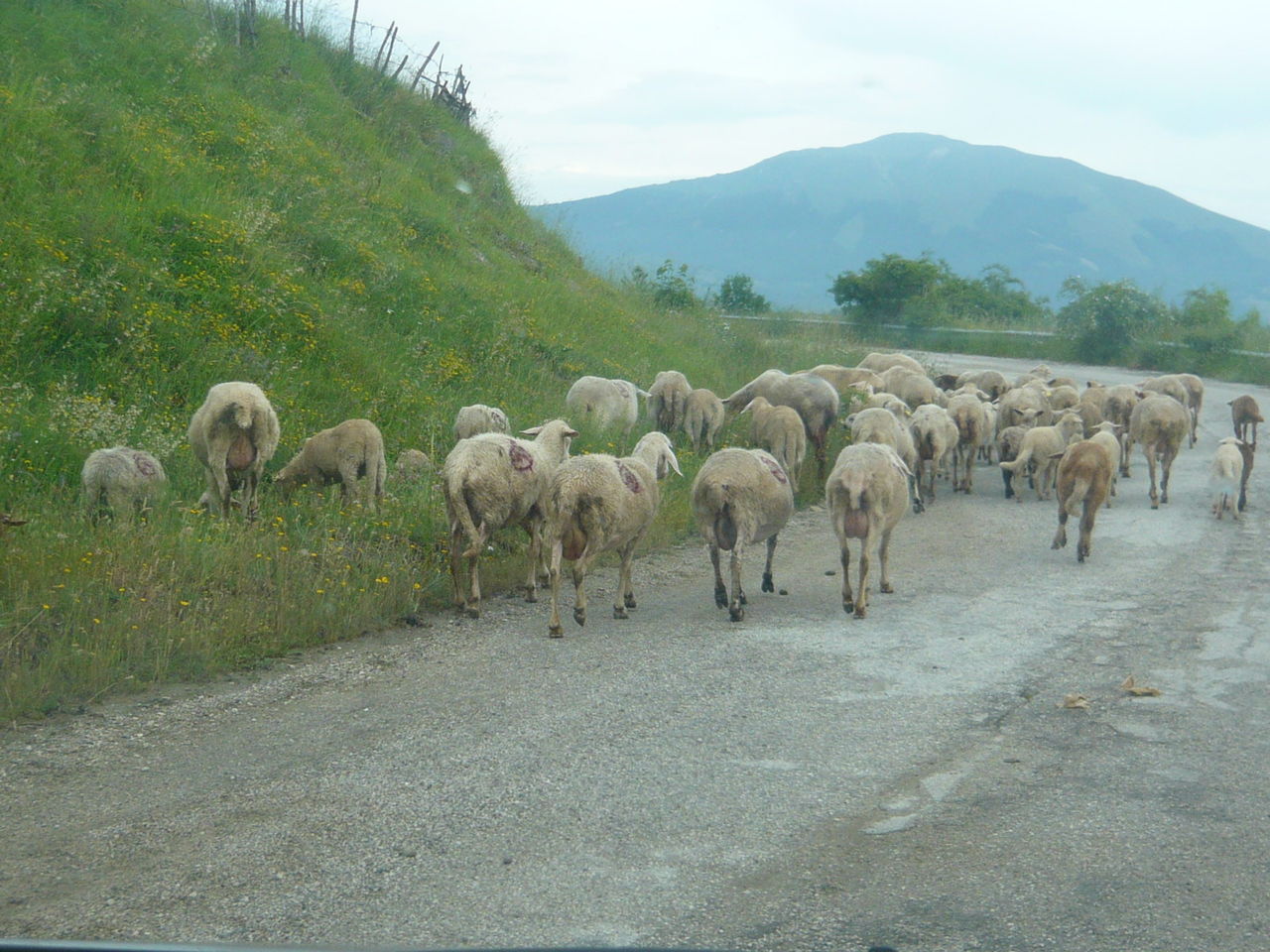 道を完全にふさがれたことは数回ですが、この羊には驚きました~(写真はトスカーナでなく、2010年のアブルッツォ旅行にて)。この時は当然ですが、最初は羊をジャマせずにゆっくり後ろについていたのですが、あまりにノロいので、ダンナが軽くクラクションを・・・すると、羊飼いさんも気づいて路肩に誘導してくれました。ここまでふさがれることはなくとも、鹿にぴよーんと横切られたり、鶏が脇の原っぱから出てきそうで怖かったり。ほのぼのしたり、ビビったり、いろいろあります。