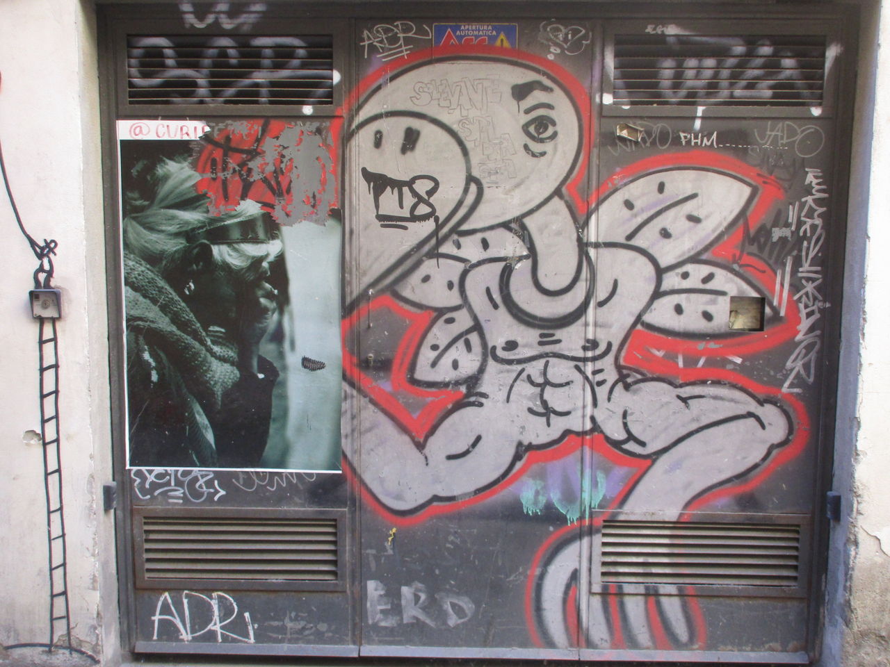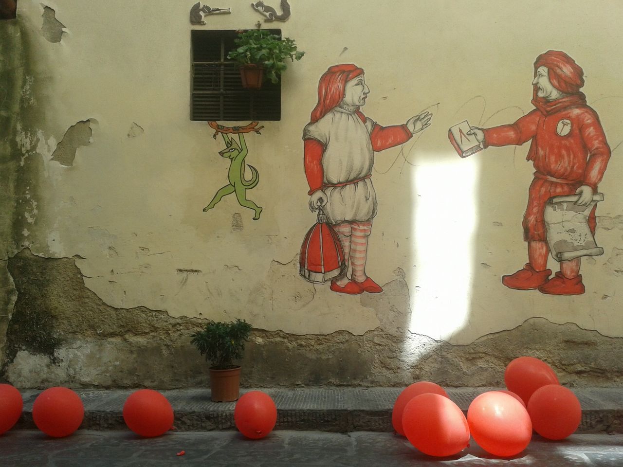 たまたま、なんでか分からんけど赤い風船が舞っていたのもあり入ったんですが、この写真のように、レベルの高い落書きでいっぱいの通りでした!この左の人物は、ドゥオモのクーポラ持ってるから、ブルネッレスキ?この右の人物は、地図持ってるからアメリゴ・ヴェスプッチ?これぞザ・フィレンツェの落書きです。