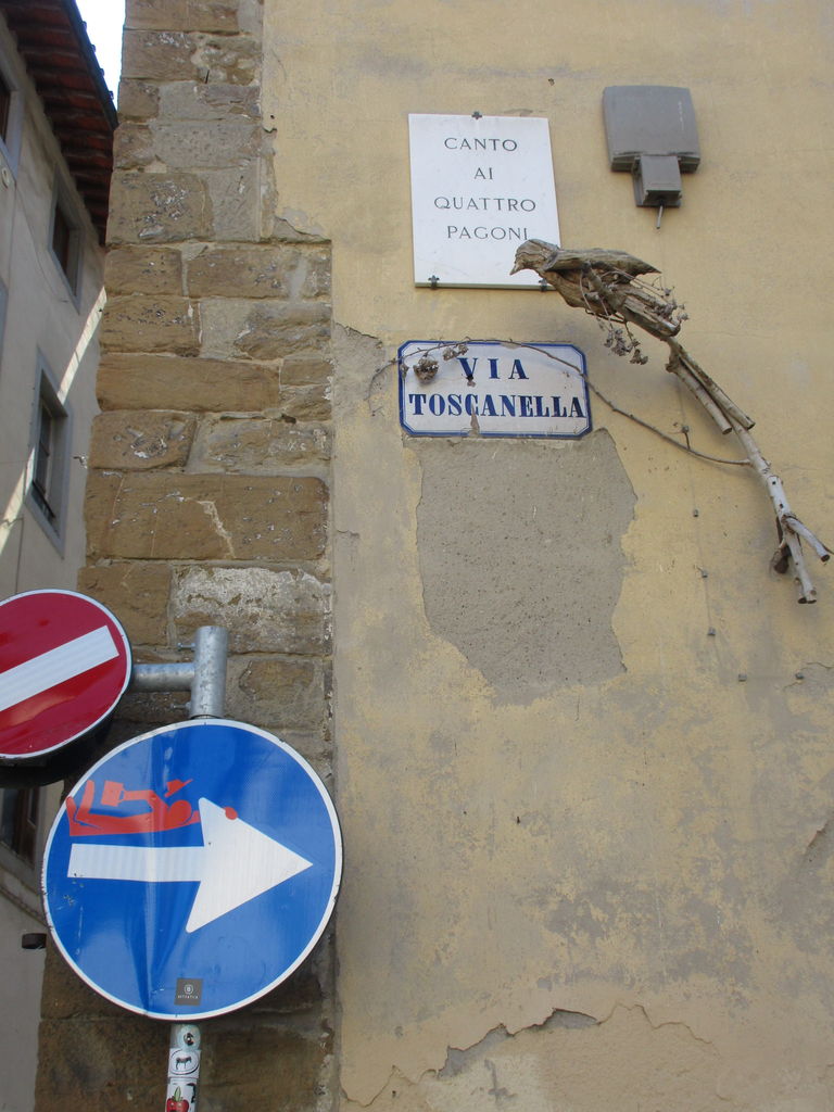 右上の鳥のオブジェがオシャレ!左下の一方通行の標識は、日本でも物議を醸しだしたお馴染み?CLETのもの。フィレンツェでは交換せずにそのままになっているので、あっちこっちで見られます。