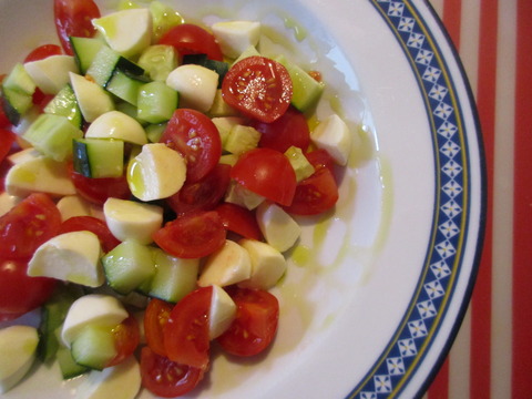 ◎プチトマト・10個 ◎キュウリ・半分 ◎モッツァレッラチーズ・1個 ◎オリーブオイル・適量 ◎好みでオリガノやバジル