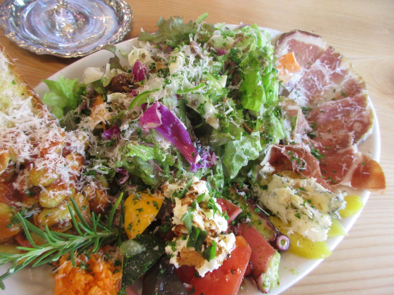 たっぷりのサラダ、生ハム、チーズ、タコのマリネ、豆とブルスケッタ・・・