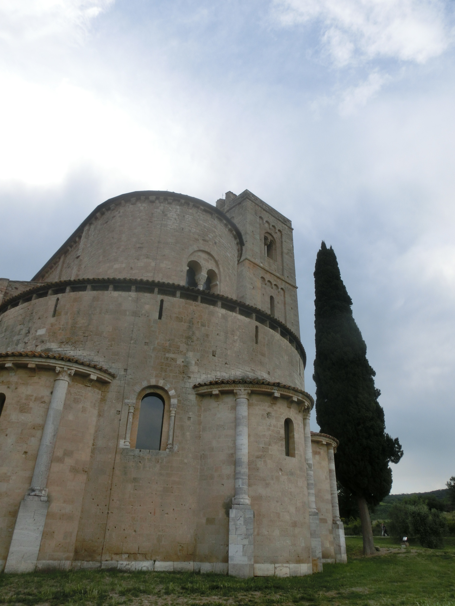 モンタルチーノから車で15分程度、、山々とチプレッソ(糸杉)そしてオリーブが点在する緑の平野にひっそりと佇むのが、このサンタンティモ修道院。TOPの写真は教会の後ろ= 後陣と鐘楼の後ろ側ですが、どこから来てもまずは後ろ側から教会を見ることになります。ここから道はぐるっと教会の左側を回りますが、目の前に広がる草原に駆けたくなったら草原から入って後ろから眺めるも良し、まずはやっぱり正面に回って中に入ってみるのも良し。