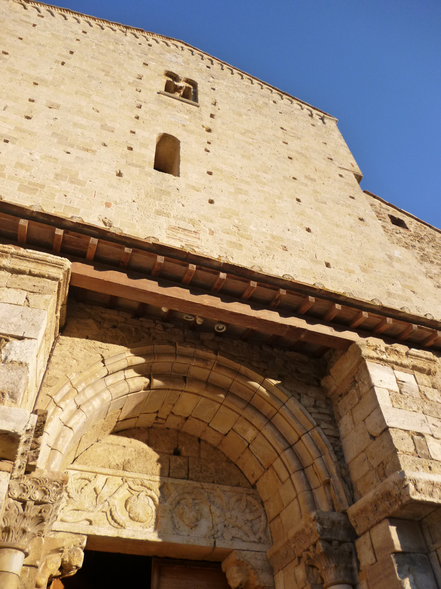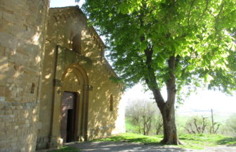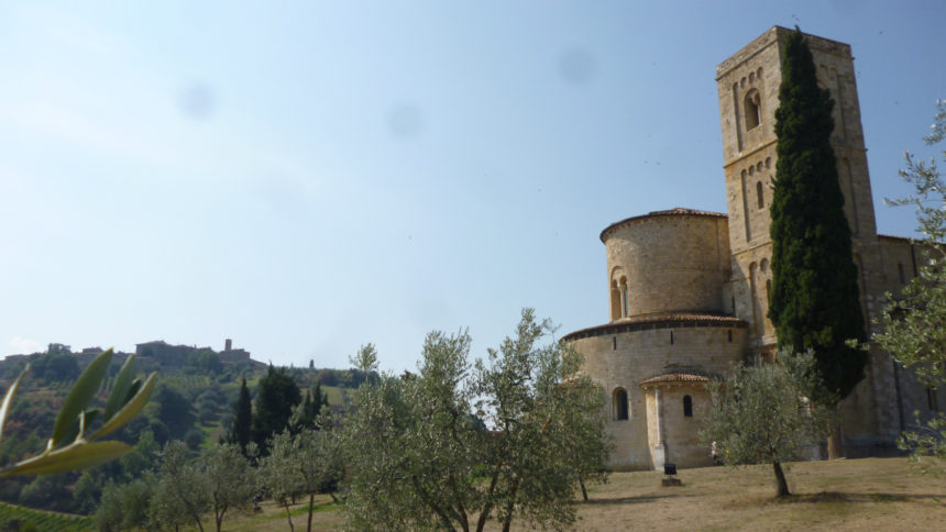 後陣に向かって左上の丘に見える小さな村は、Castelnuovo dell’Abate(カステルヌォーヴォ・デッラバーテ) 。
