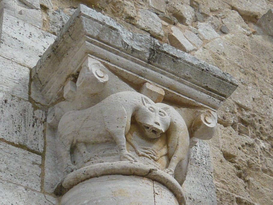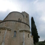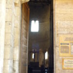 外から自然光だけの(夜は分かりませんが昼間は自然光だけでした)内部に入ると、最初は暗くてよく分かりませんが、目が慣れてくると、後陣から放たれる光に浮かび上がる簡素な十字架、柱・・・ なんともいえない荘厳な美しさ。以前、ミサなどで修道士によって歌われる グレゴリオ聖歌 が低いボリュームで流され、信者でなくとも神聖な気持ちにさせられます。入って右側の身廊奥(祭壇手前)にある小さな階段を下りて クリプト(地下礼拝堂) を、そしてトスカーナでは数少ない 2重後陣 (祭壇の後ろも通行できる)を周って教会内を一周できます。