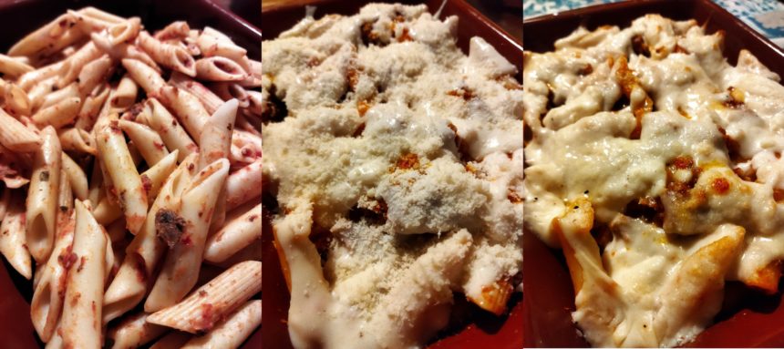 我が家ではそれほど回数は多くないものの、イタリアでは毎日のように食べるパスタ。こないだもマンマんちに行った時に定番のミートソースのパスタが出たのですが、1人暮らしで粉もん制限ダイエットをしているマンマには残ったパスタは全て持って帰らされます。残り物を食べるのは主婦の役目・・・とはいえ、美味しく食べたい!・・・とアレンジを加えてみると、残り物をあっためたものだと食べたがらない息子たちが取り合うほどの大人気メニューに!!というのがTOP写真の料理。