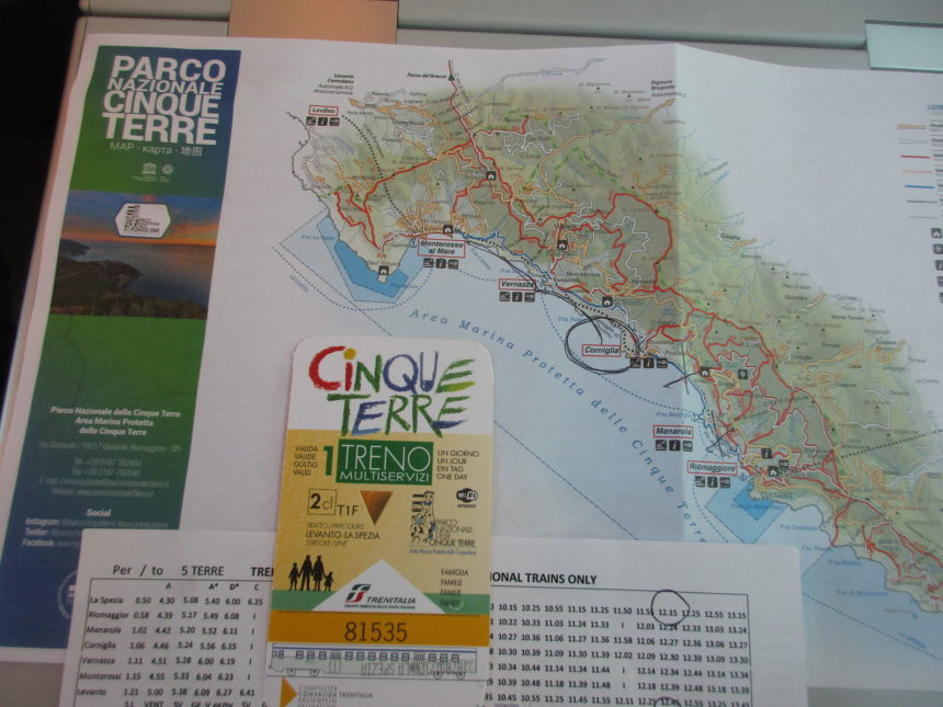 チンクエテッレのスタート地点は、ラ・スペツィアの駅。まずはこの駅のチンクエテッレポイントで、チンクエテッレカードを購入しましょう。駅の表側でなく、1番線ホーム内にあります。私たちは大人2人&子供2人のファミリーカード1日券を購入。1日券には、ラ・スペツイア~チンクエテッレの5つの駅~レヴァントの電車乗り降り自由、チンクエテッレ内のバス、駅構内のトイレやWIFIなどが含まれています。カードはその日のうち、でなく、刻印から24時間なので、昼スタートなら翌日の午前も使用可能!同時に地図と時刻表を渡してくれ、その時点での次の列車に丸をしてくれたり、また、トレッキングコース=リオマッジョーレ⇔マナローラ間(愛の小道・2018年8月現在閉鎖中)、マナローラ⇔コルニリア、にもバツ印をつけてくれたり、スタッフの方はテキパキ、分かりやすいです。