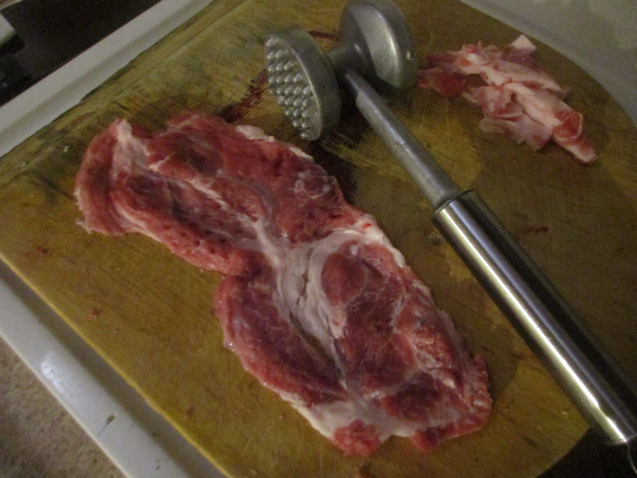 それは・・・肉叩きです!おそらく料理の仕方が違うせいなんでしょうが、肉の薄切りは売っていません。あるのは牛のカルパッチョ用・・・しかしこれは、脂がないので、すき焼きや肉じゃがにしてもあまり美味しくありません。うちは豚肉好き家族ですが、豚肉の薄切りも、あっても脂身の少ない背肉くらい。なので、お好み焼きに使うパンチェッタ(腹肉)や、脂身が多めでよく使用するスカルメリータ(首肩肉)は、叩いて薄くするしかない!売ってるのは、1cmくらいの厚み・・・TOP写真のように、こんなに分厚いの。ちなみにカウンターで「できる限り薄くスライスして~」と言っても、これの半分くらいかな・・・結局叩く羽目になります(苦笑)。それを叩いて、叩いて、