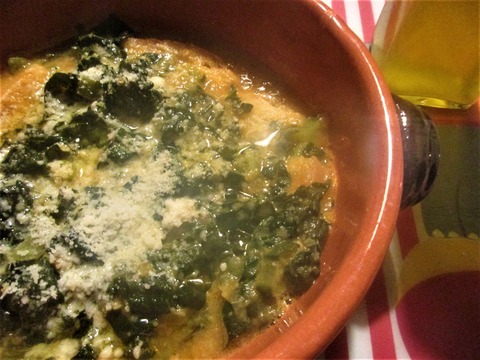 黒キャベツが余っていたのですが、リボッリータはこないだやったし、なんか別バージョンで・・・そしてちょうど余っていたほかの食材も利用できたので、このレストランで食べたミネストローネを再現してみました~これぞザ・トスカーナのパンと黒キャベツの豆スープ!リボッリータの簡易版みたいなものですが、豆スープはこのレシピをベースに野菜ブロードでかなり薄めて、そこに刻んだ黒キャベツを煮ただけ。器の底に固くなったパンを敷いて、あっつあつのスープを注いで粉チーズと新オイルをかければ・・・けっこうなご馳走です💛