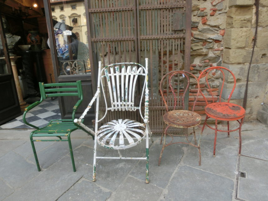 駅やメディチ家礼拝堂に近い、ヴィンテージショップの前。ここはいつ通っても、こんな味のあるイスが並んでいます。