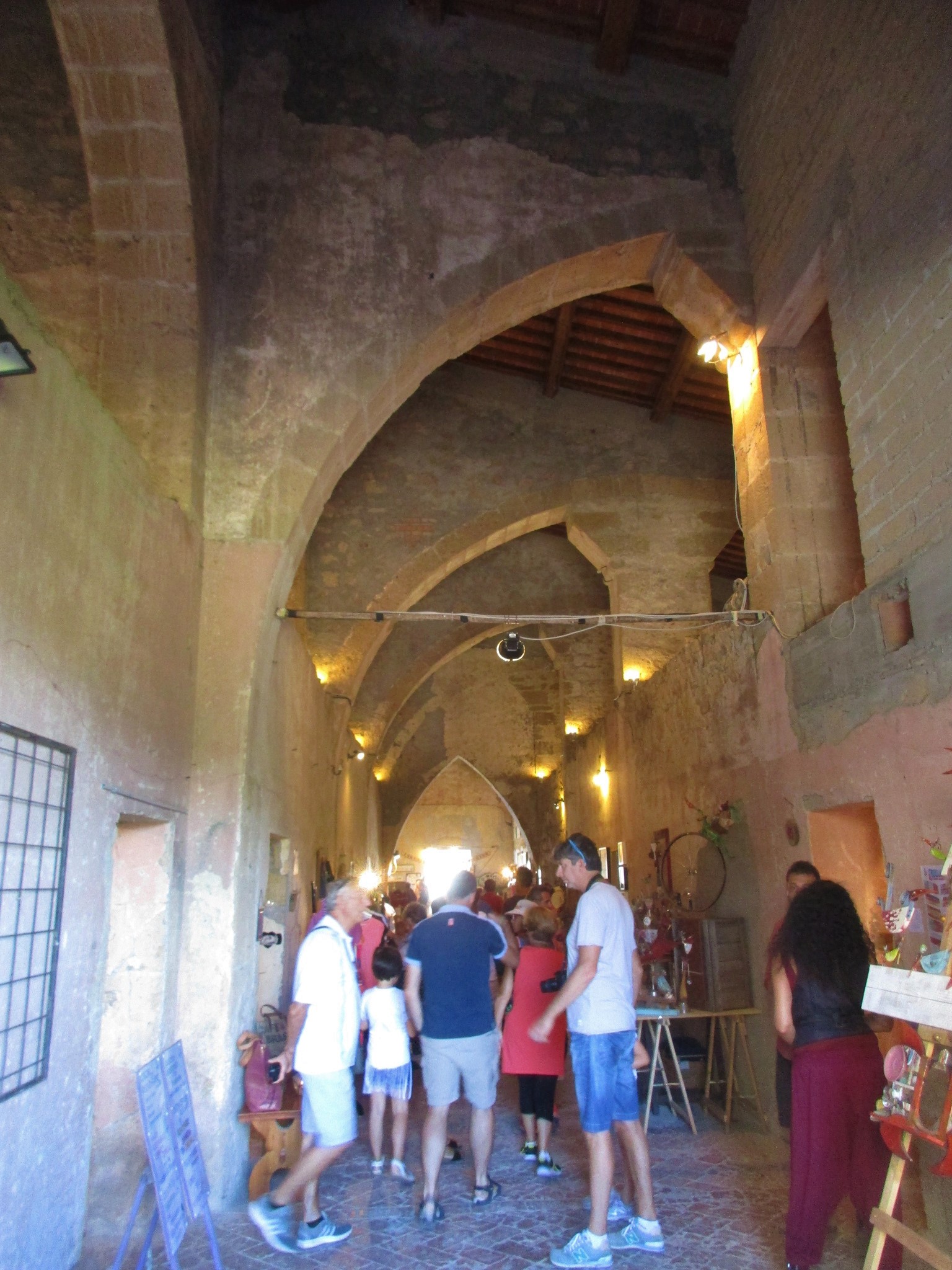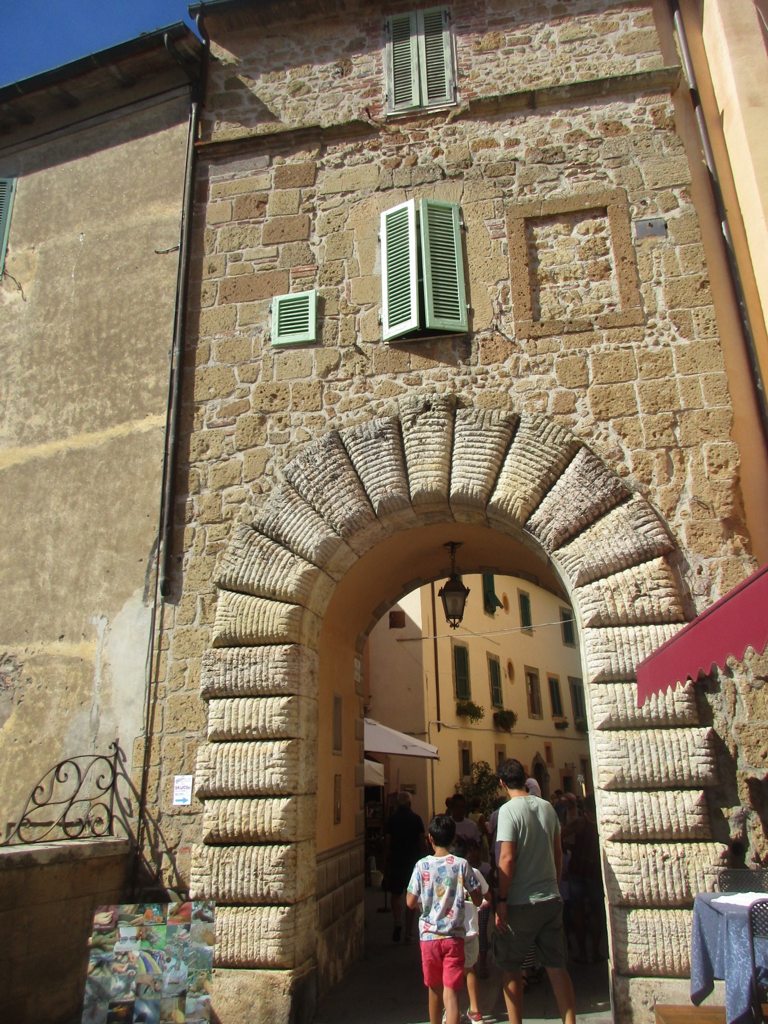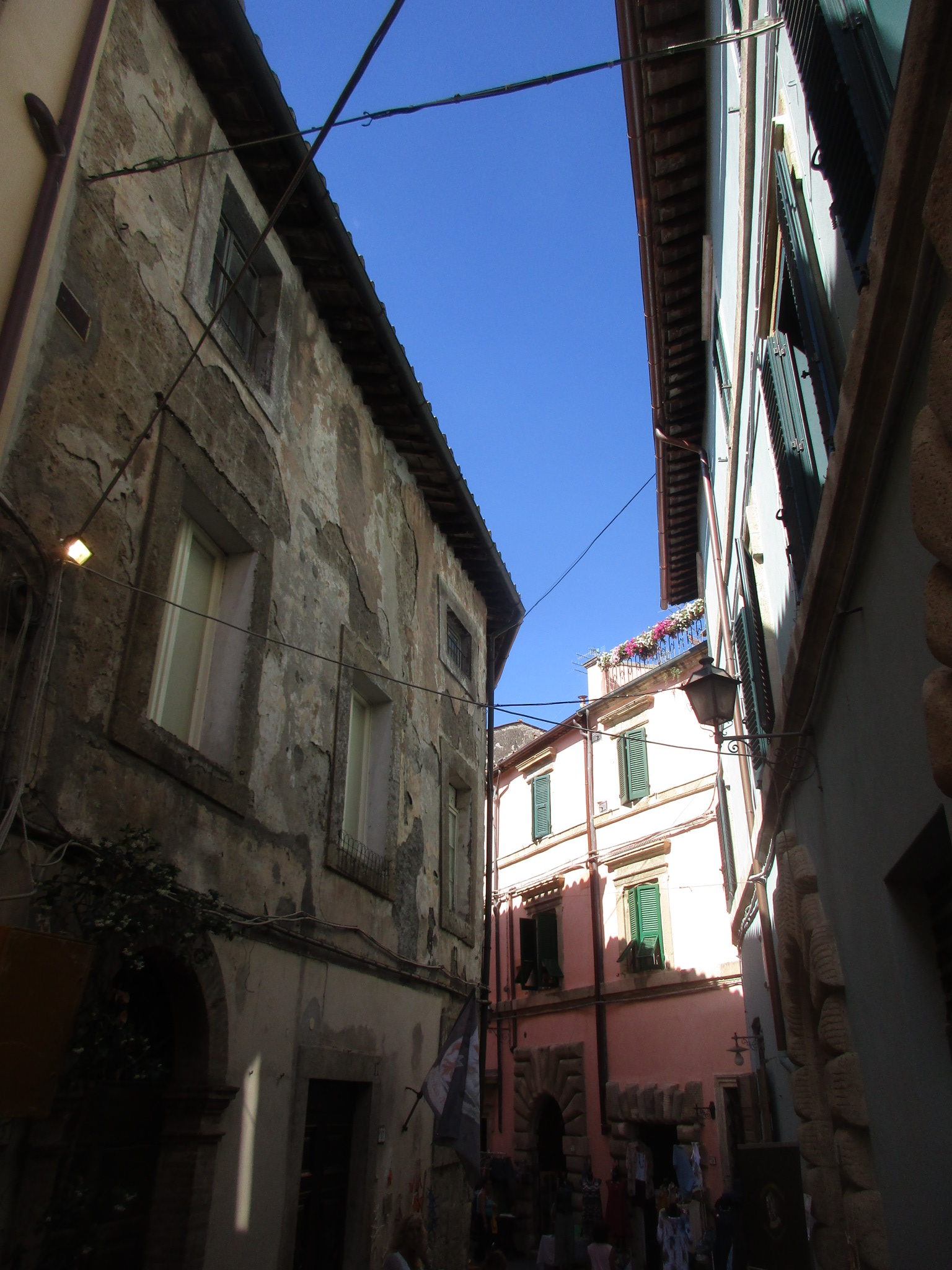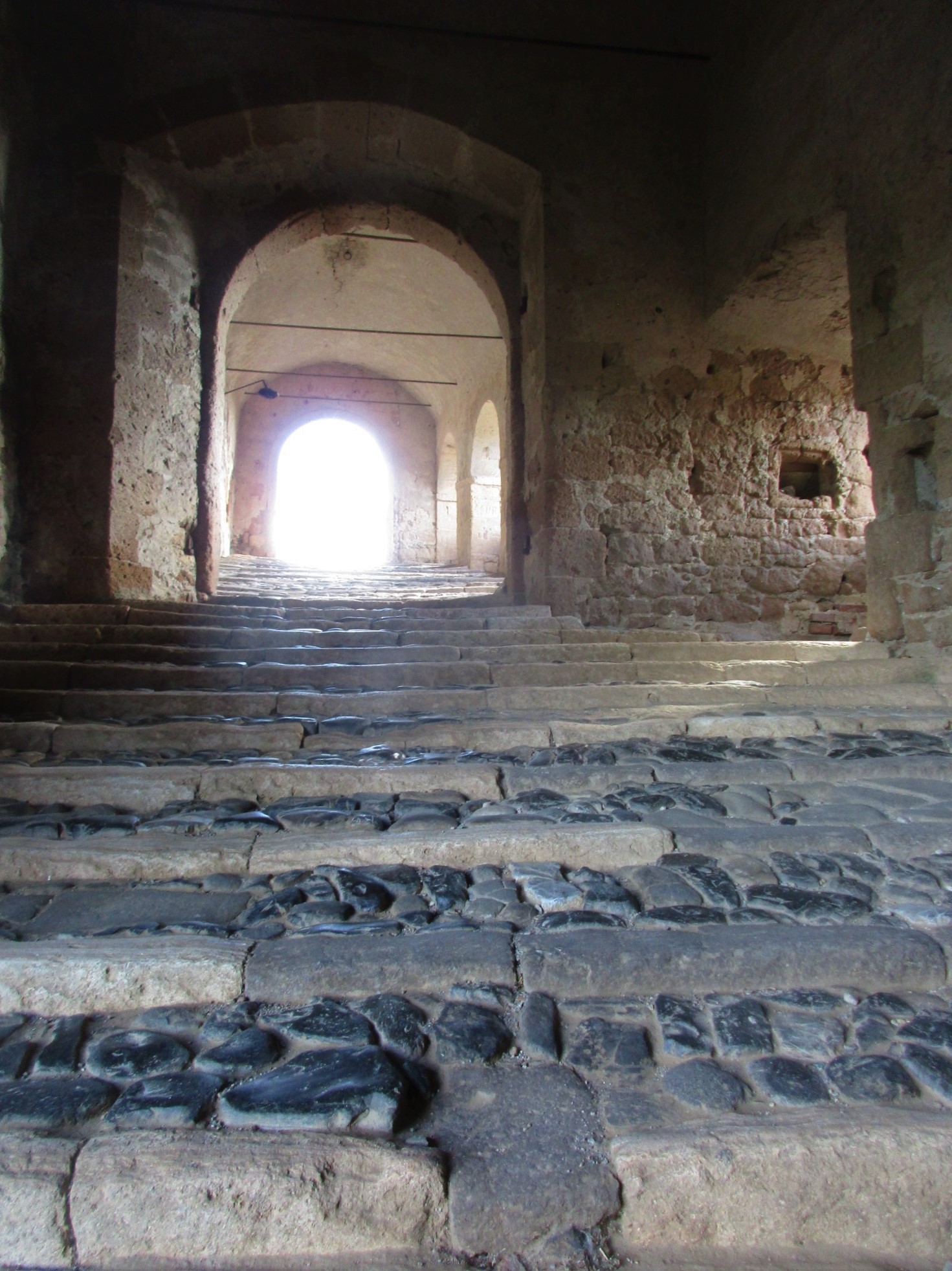 旧市街へのアクセスは全て南から、あとの三方向は全て崖になっています。南西にあるブサッティ広場から入ると、少し商店やレストランがありますが、あとはアップダウンのある狭い路地とアーチ、階段で構成された迷宮のような作り。そのまままっすぐ坂を上がっていくと、コルティローネと呼ばれる建物に到着します。ここは領主であったオルシーニ家のニッコロ4世の命により、1559年に建てられた小麦の倉庫で、現在は主に展示会などのイベントに使用されています。