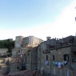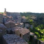 トスカーナ南のマレンマ地方の中で、ピティリアーノ、ソヴァーナと並んで凝灰岩の町として知られるソラーノ。凝灰岩の上にできた「要塞都市」ですが、ピティリアーノのその圧倒的な姿とはちょっと違って、谷の中にひっそりと佇む昔話に出てきそうな村です。写真は町の南西の駐車場からの全景、緑の山の中にひょっこり顔を出しているよう。