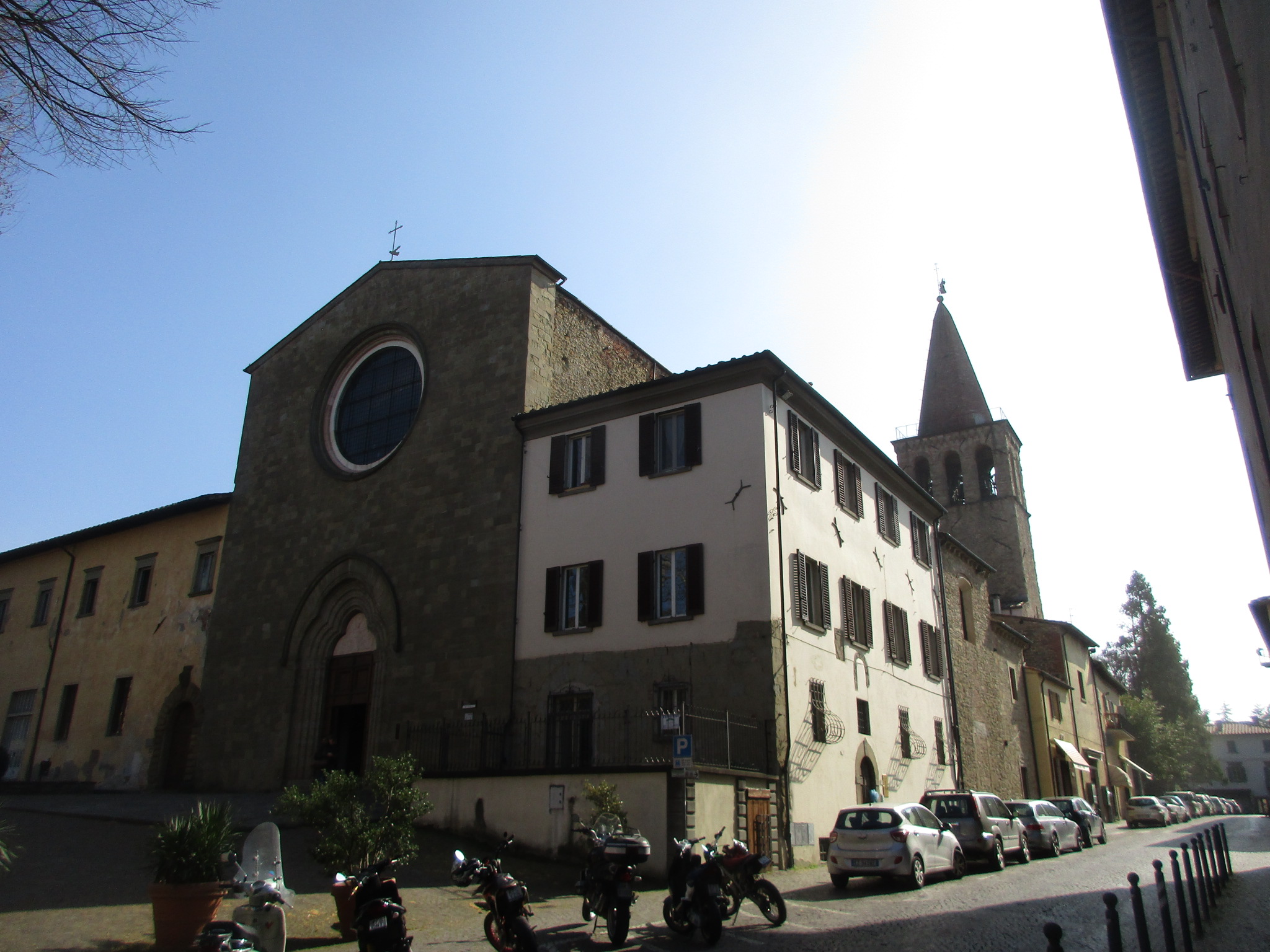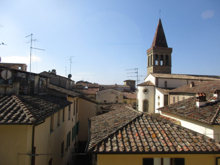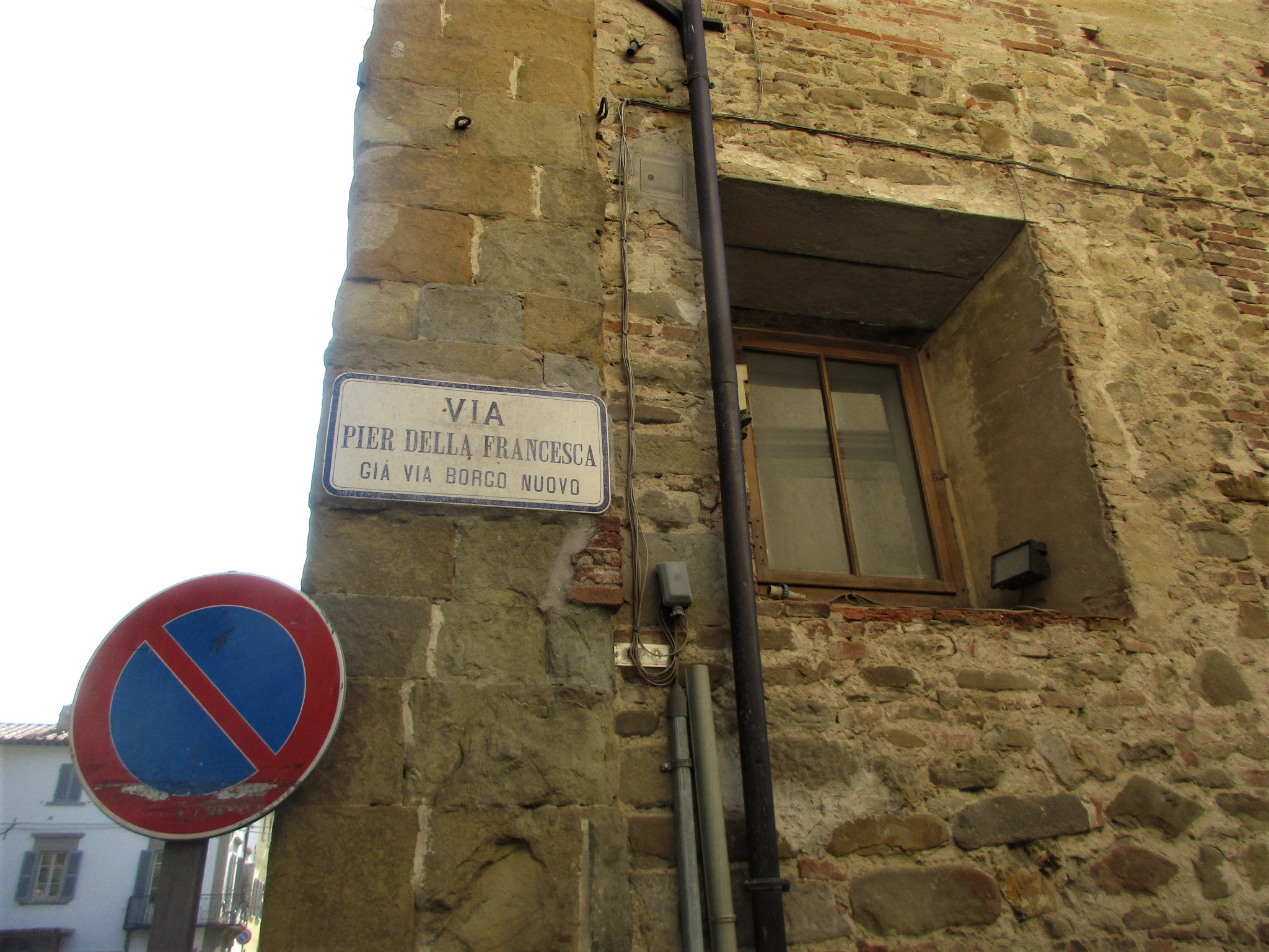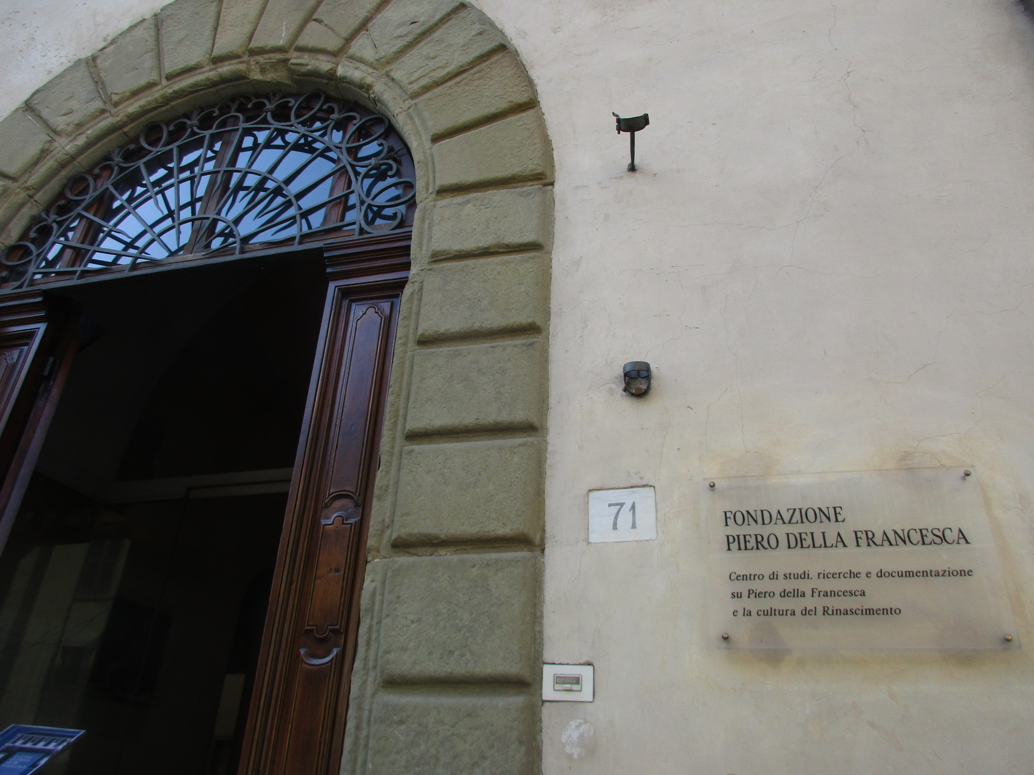 ピエロファンが絶対はずせないのが、ピエロの家=ピエロ・デッラ・フランチェスカ財団です。財団と言ってもピエロを紹介するパネルや動画の投影などが一般公開されている建物で、事務所の一角にはピエロのフレスコ画も残っています。スタッフの方は親切で、いろいろ教えてくれますよ。そして見逃してはいけないのが、最上階にあるパノラマポイント。窓が額縁のようになり、そこに現れる旧市街はまさに絵画のような美しさです。