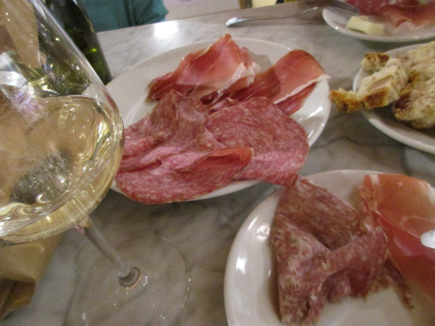 まずは、バルベリーノ・ディ・ムジェッロという、高速道路の出口&アウトレットでまぁ有名な(笑)、小さな町でアペリチェーナ。カウンターでお惣菜とかサルーミをお願いしたんだけど、気の良い?ナポリ人のおっちゃんがてんこ盛りにしたがって、もう大変!