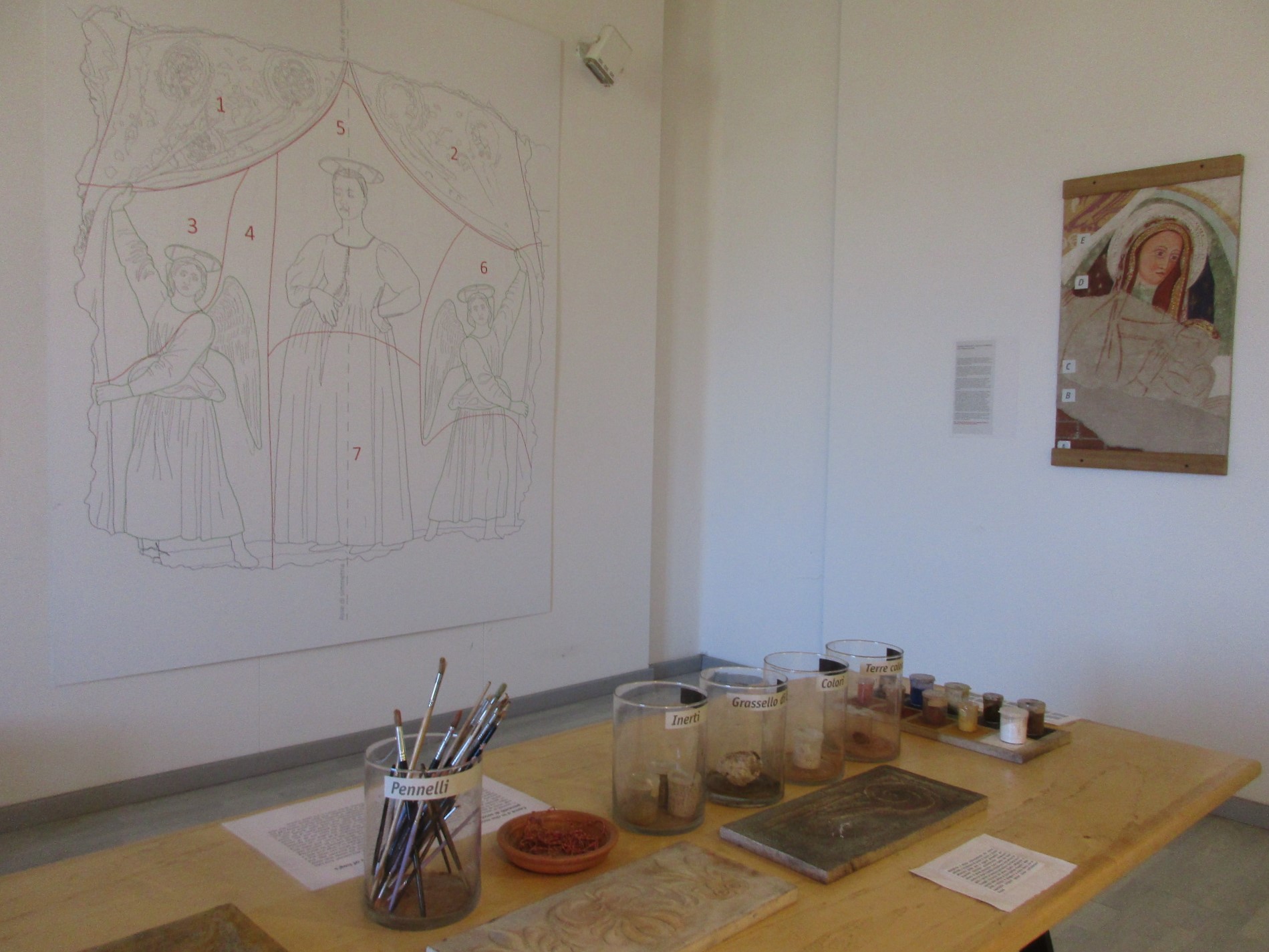 旧市街は目立ったものは何もないのですが、ピエロ・デッラ・フランチェスカファンは絶対はずせない村。標識に沿って歩くと、目の前に現れるのがその名も「出産の聖母博物館」、下の写真右端に写っている以前は学校だった建物で、まさに展示は「出産の聖母」だけのミュージアムがあるのです。現在は作品解説のビデオルーム、作品の部屋、ワークショップなどが行われる部屋、ブックショップがありますが、アンギアーリの老舗生地メーカー・BUSATTI社がスポンサーとなり、展示ルート整備のための内部改装プロジェクトが進んでいるそうですよ。