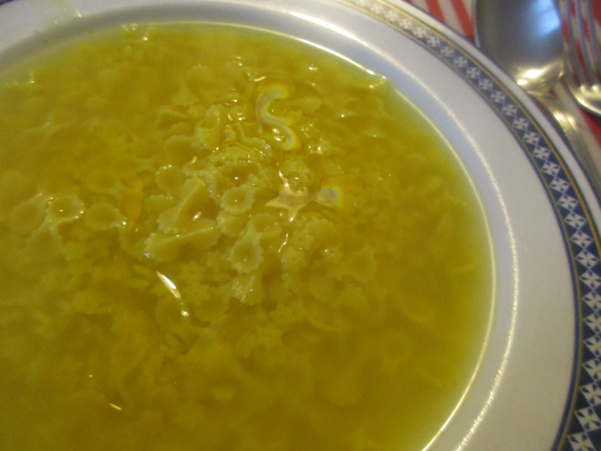 ブロード、とは日本でいう出汁。基本「オドーリ」と呼ばれる香味野菜、玉ねぎ・ニンジン・セロリを煮込んだ野菜の出汁で、さらに鶏肉などで煮込む場合もあります(姑のが絶品なのだけど、まだ習っていない!)。煮込み料理で水分がなくなったら、あた、リゾットの煮込みにもブロードを使います。これでパスタを茹でたパスタ入りスープが「パスタ・イン・ブロード」なのですが、香味野菜から出汁をとるのは時間かかるので、こんな時は!潔く、キューブ状の市販品を使います。私は基本ブロードを作りますが、こういう時の為に有機のブロードキューブを常備。それを沸かしたお湯に入れて~溶かして~ブロード用のパスタ入れて~出来上がり!たぶん、所要時間10分くらい。今日は粉チーズをきらしていましたが、粉チーズとオリーブオイルをかければ立派なご馳走です♪