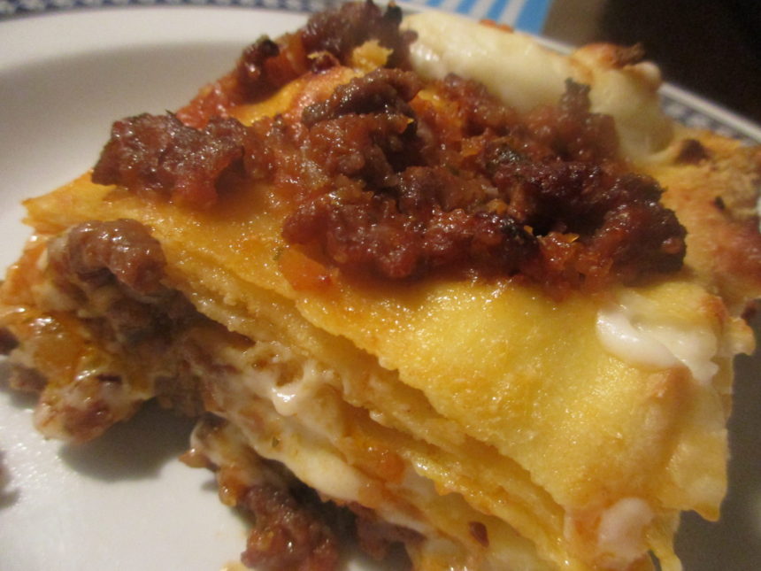イタリアンは基本全部美味しいけれど、も~誰もがウハウハ食べちゃう一品は、私的にはラザニア(イタリア語ではラザーニャ、と真ん中で伸びます)。昔、日本在住だけどご主人がイタリア人の友人が「ラザニア作りたいけど、ラザニアのパスタが売ってない」と嘆いていましたが、なければ作ればいいんです。しかもラザニアのパスタなんて一番簡単!だって伸ばすだけですもん。私の家庭料理のモットーは簡単で美味しい、なので、容器の大きさだいたいで伸ばし、ちょっと角まで届いていなくたって、あるいは大きくったって、そんなん無視、無視。そんなもん重ねて行けば全く見えないし味にも変わりないから、適当でいいんですよ(笑)