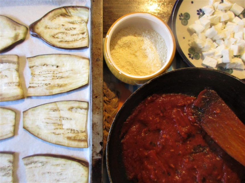 イタリア定番料理の1つ Melanzane alla parmigiana = ナスとパルミジャーノ・チーズのオーブン焼き。ラザニアと同じくらい、みんな大好きな一皿ですが・・・問題は、かなりこってり&重い!というのも、元々のメニューはナスを揚げるんですよね。我が家ではマンマの真似をして、揚げない!軽めに仕上がるのでいくらでも食べられる美味しさです♪