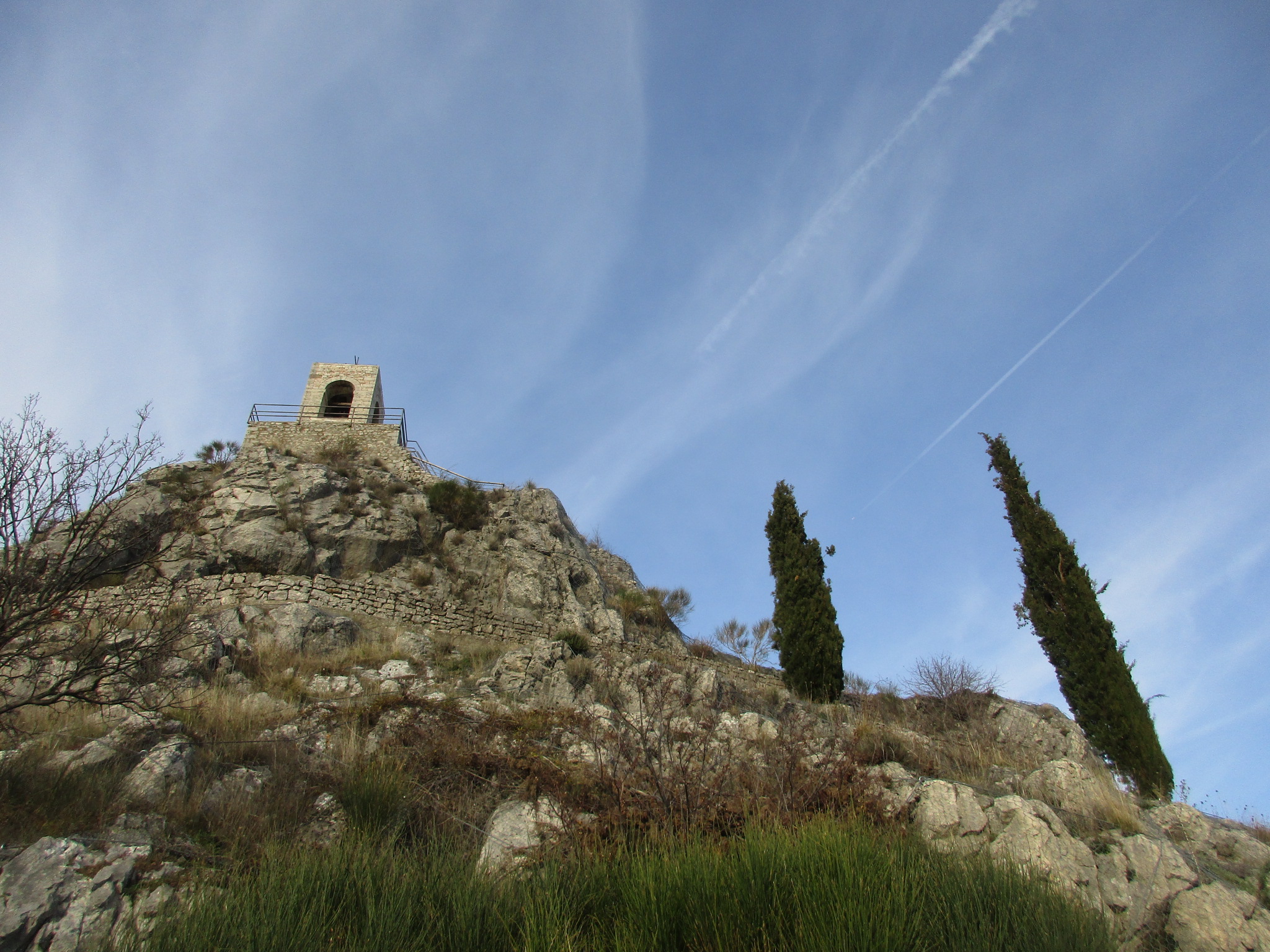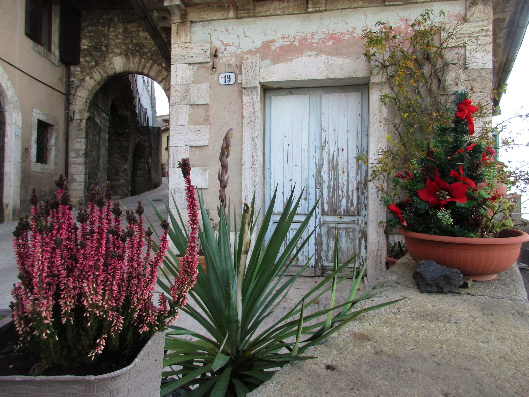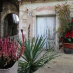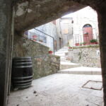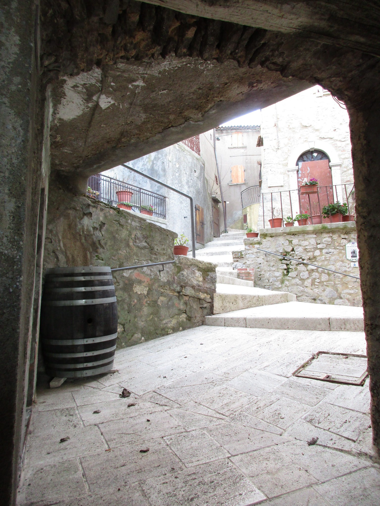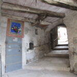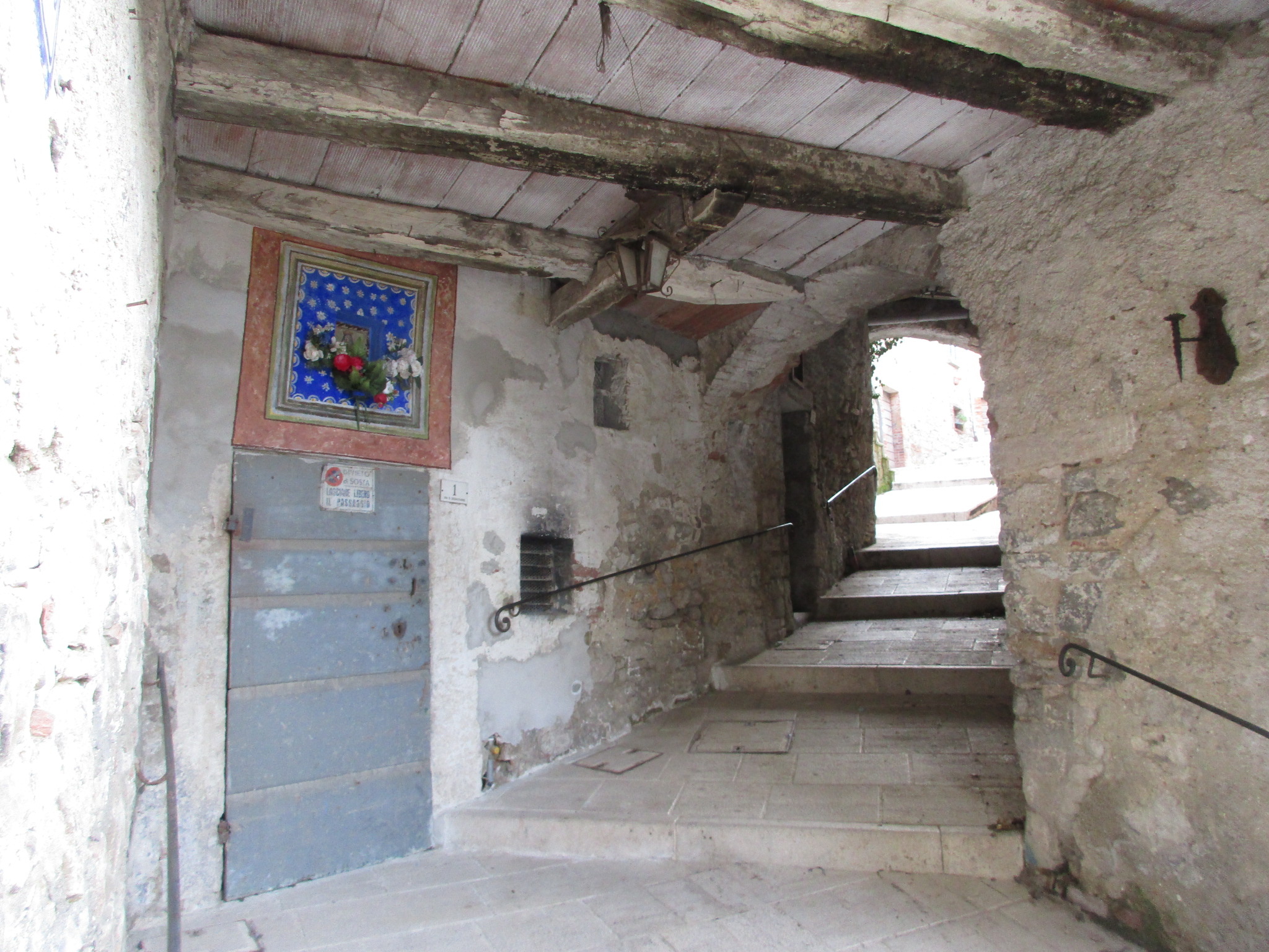 村に入ったら、こんな石畳の坂道を上って、ひたすら上を目指しましょう。村には一般住宅だけで何もないと言っても過言ではありませんが、路地やアーチが好きな人は上るだけでも楽しいです。所々の軒先に、こんな村の絵などが描かれているのも可愛いらしい。