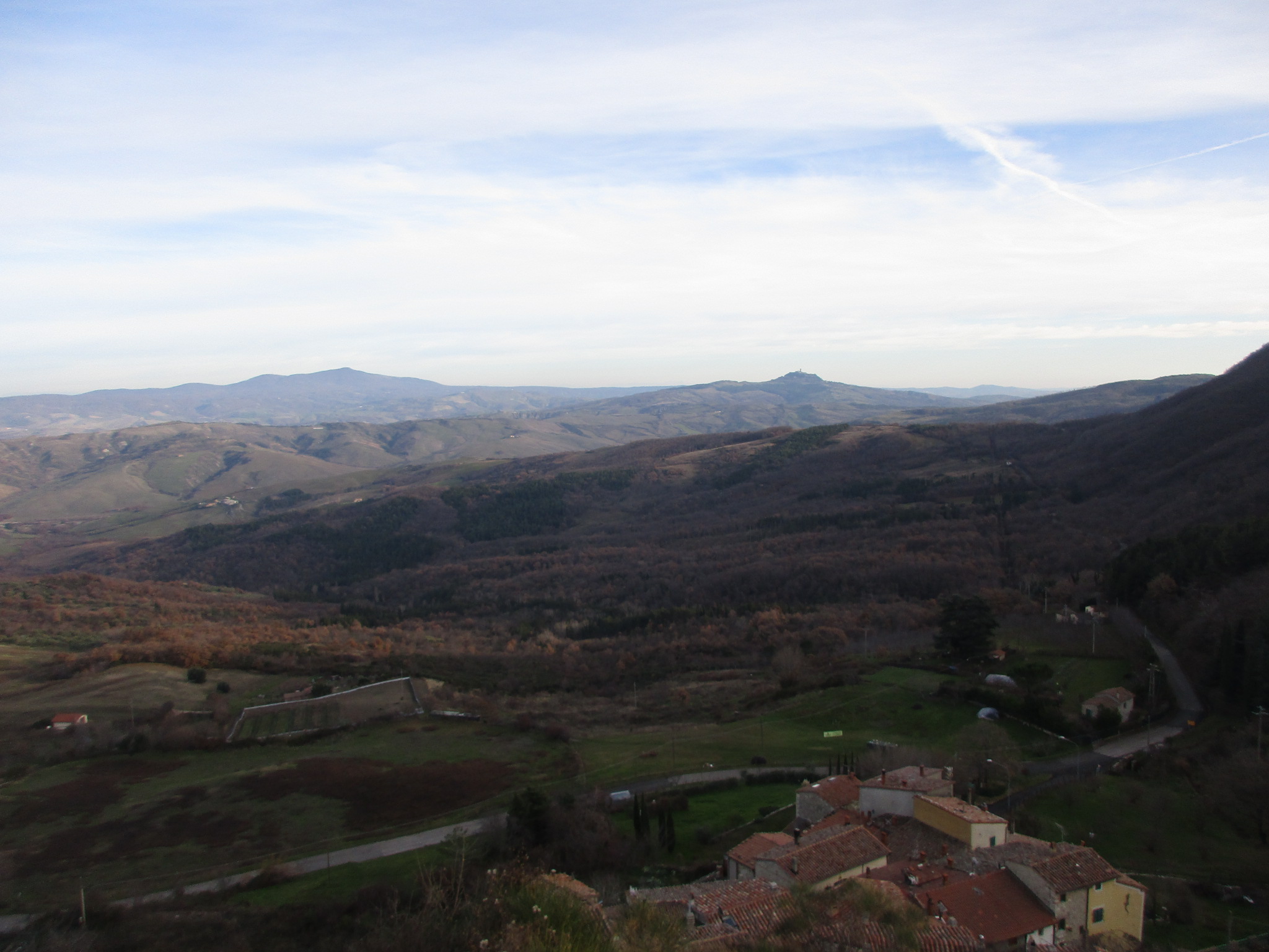 オルチャ渓谷の小さな村、カンピリア・ドにルチャ。ヴィーヴォ・ドルチャと同様、カスティリオーネ・ドルチャの分離集落のひとつです。近くまで来ると、アミアータ山の中腹にひょっこり見えるのが、カンピリアのシンボルであるこの塔です。村のふもとまで来ると、この通り、まさに村のてっぺんに立っているのが要塞、呼び名は要塞となっていますが、小さい塔ですね。元々はこの地を1119年~1423年まで支配していたビスコンティ家の城塞(15世紀に解体)が下にあり、塔はその権力の象徴として建てられたと言われています。