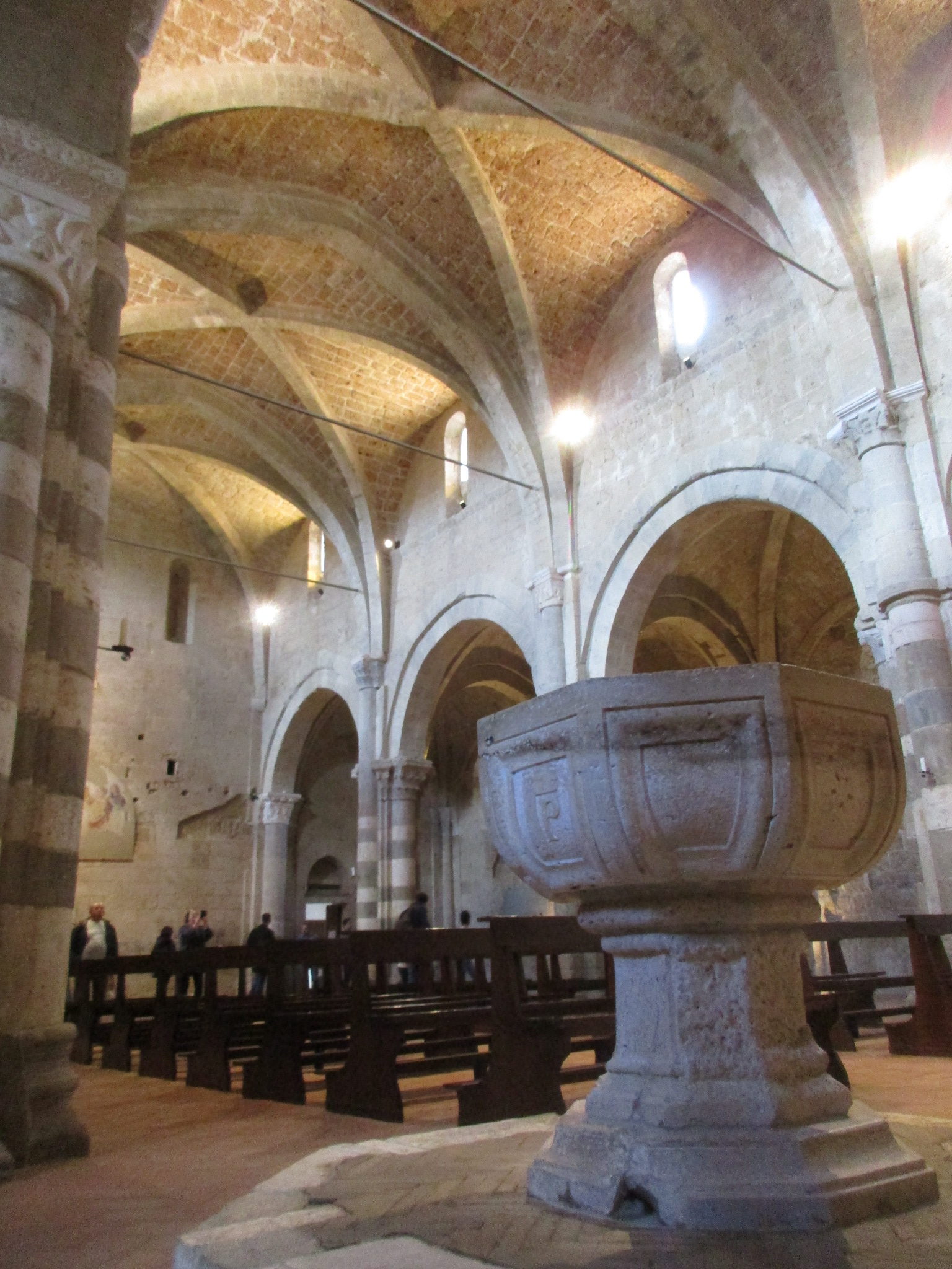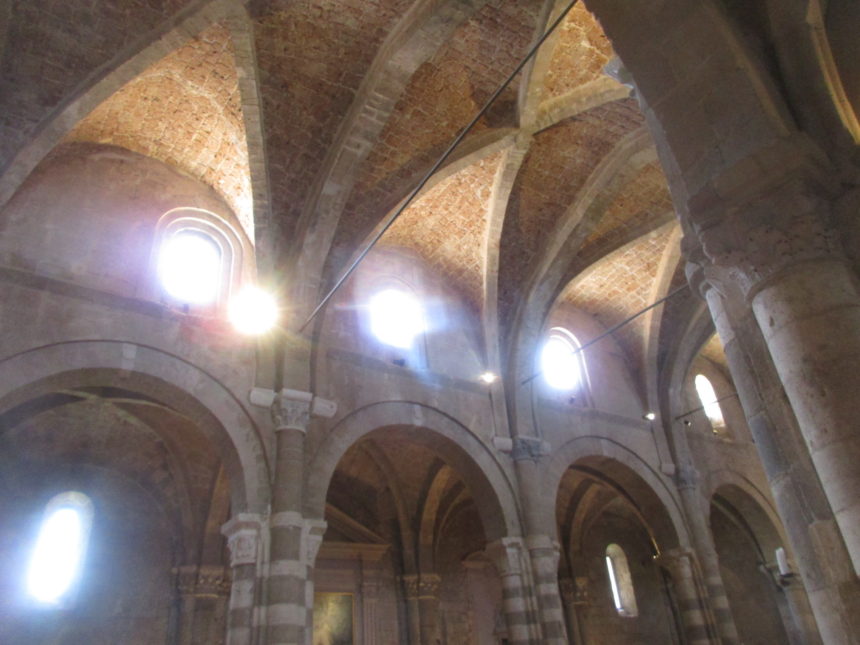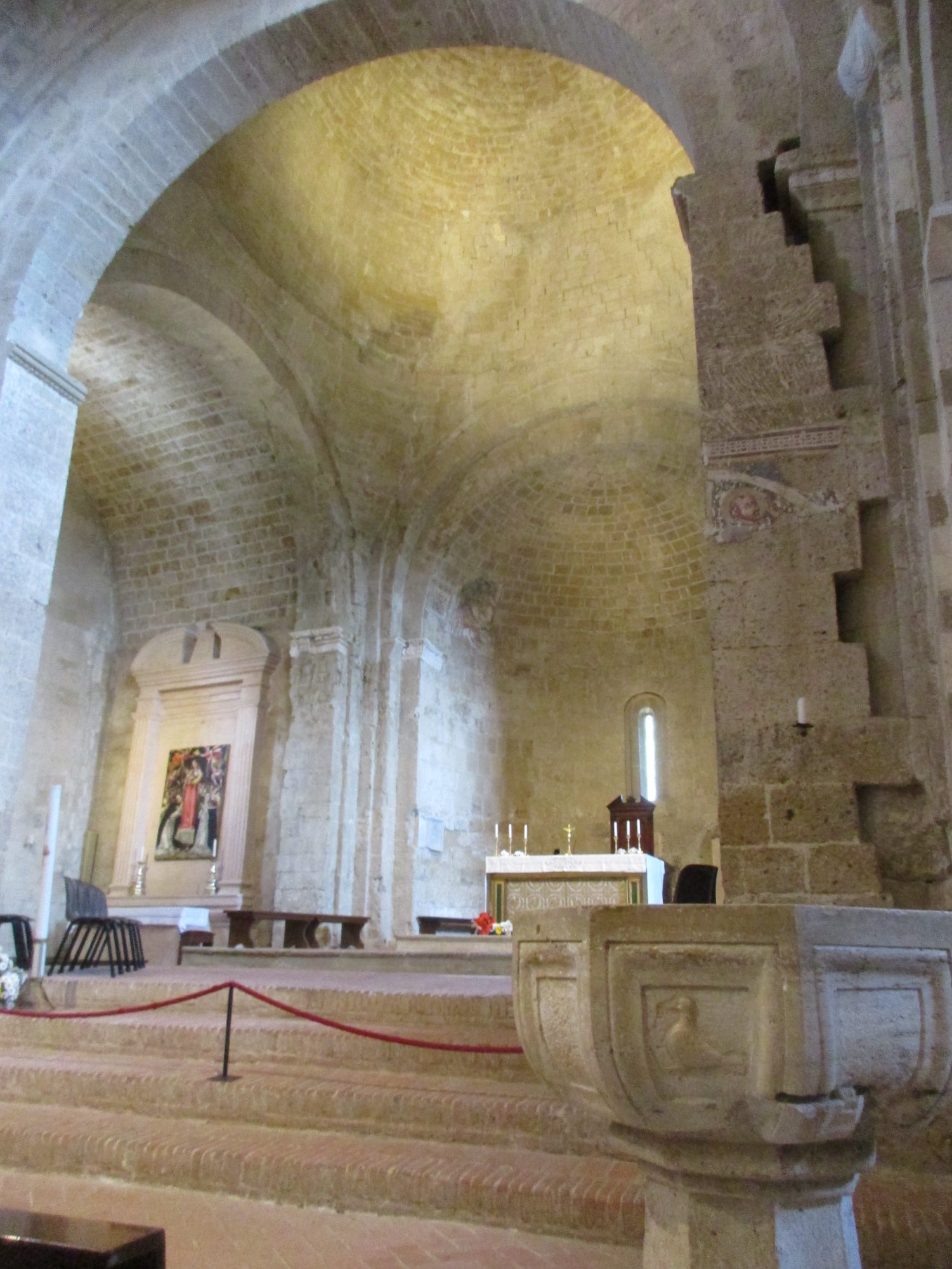 教会の建設にも凝灰岩がたくさん使われ、そのせいか?他の地域で見る教会とは何だ違う雰囲気です。華美な装飾はなく、凝灰岩のベージュが明るく、開放的な印象を与えてくれます。内部は三廊式で、天井はヴォールト天井。左側廊の奥には、聖マミリアーノの遺体が保管されています。一方、右側廊の奥からは、クリプタへ下る階段が。