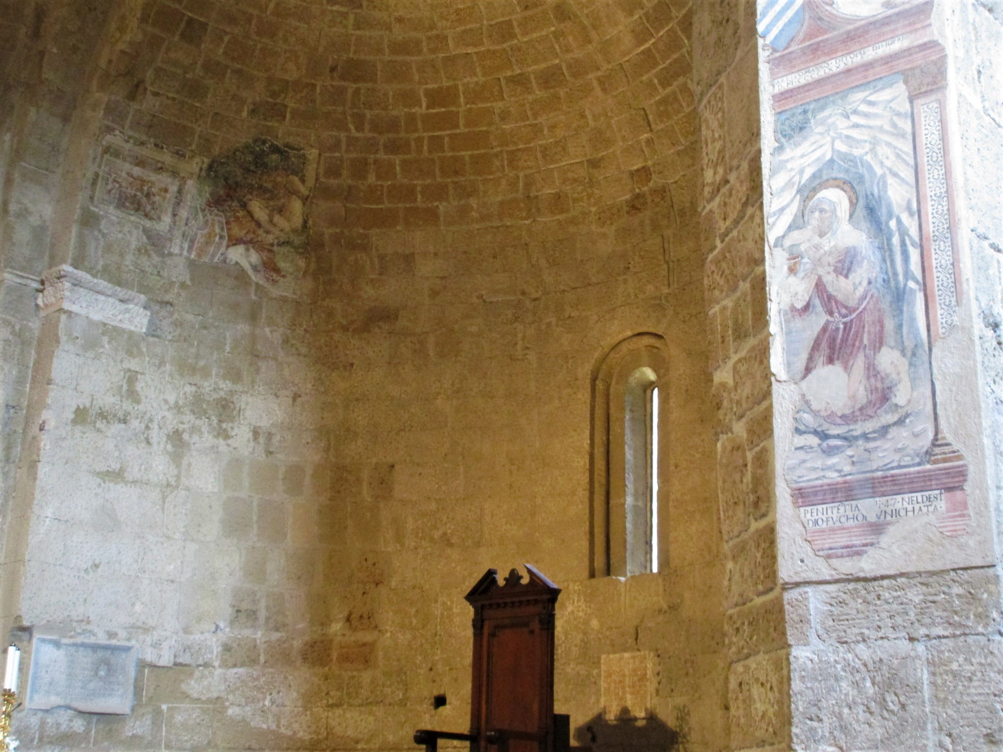 東西に長いソヴァーナの村を東の奥まで行くと、こんな風に後陣が見えてきます。元々はパレルモの司教・マミリアーノがソヴァーナを訪れた後に5世紀頃に司教座が建設され、その後8世紀頃に大聖堂の建設が開始。14世紀には、司教の建物がくっついて建設されてファサートがない、という、ちょっと変わった作りになっています。