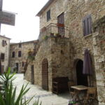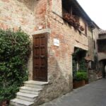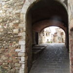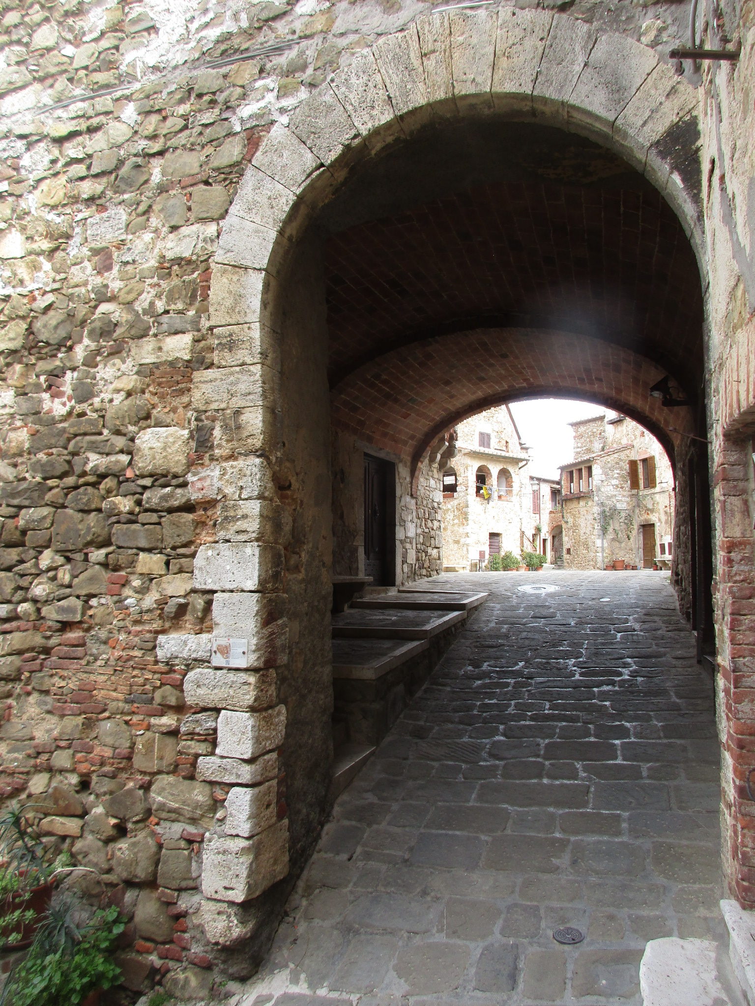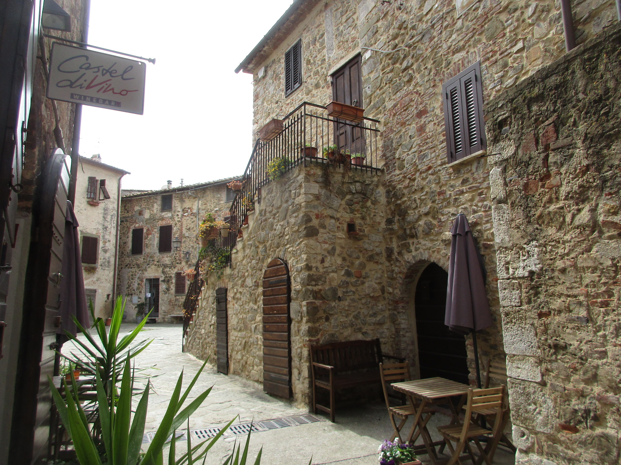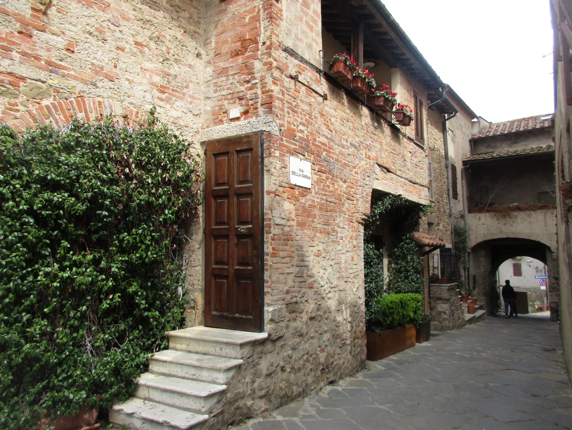 私たちがこの写真の奥から入ってきたのですが、南側の門を入ってすぐ右斜め前の坂道を上り、アーチを抜けるとこんなアングルになります。石畳、アーチ、古い木の扉、石造りの建物とそれをつたう植物・・・小さな村好きの人がゾクゾクするエッセンスが、ここに全て凝縮されています。