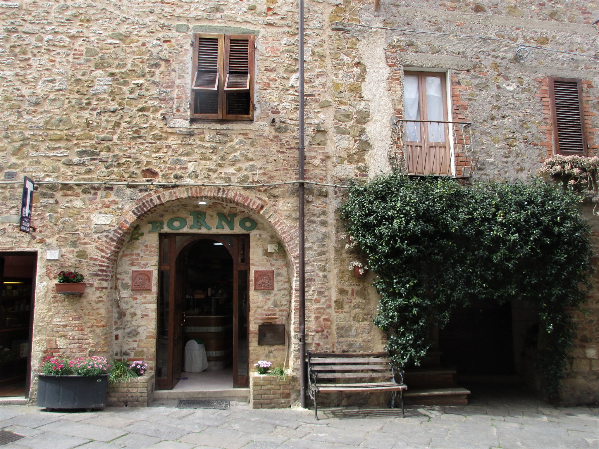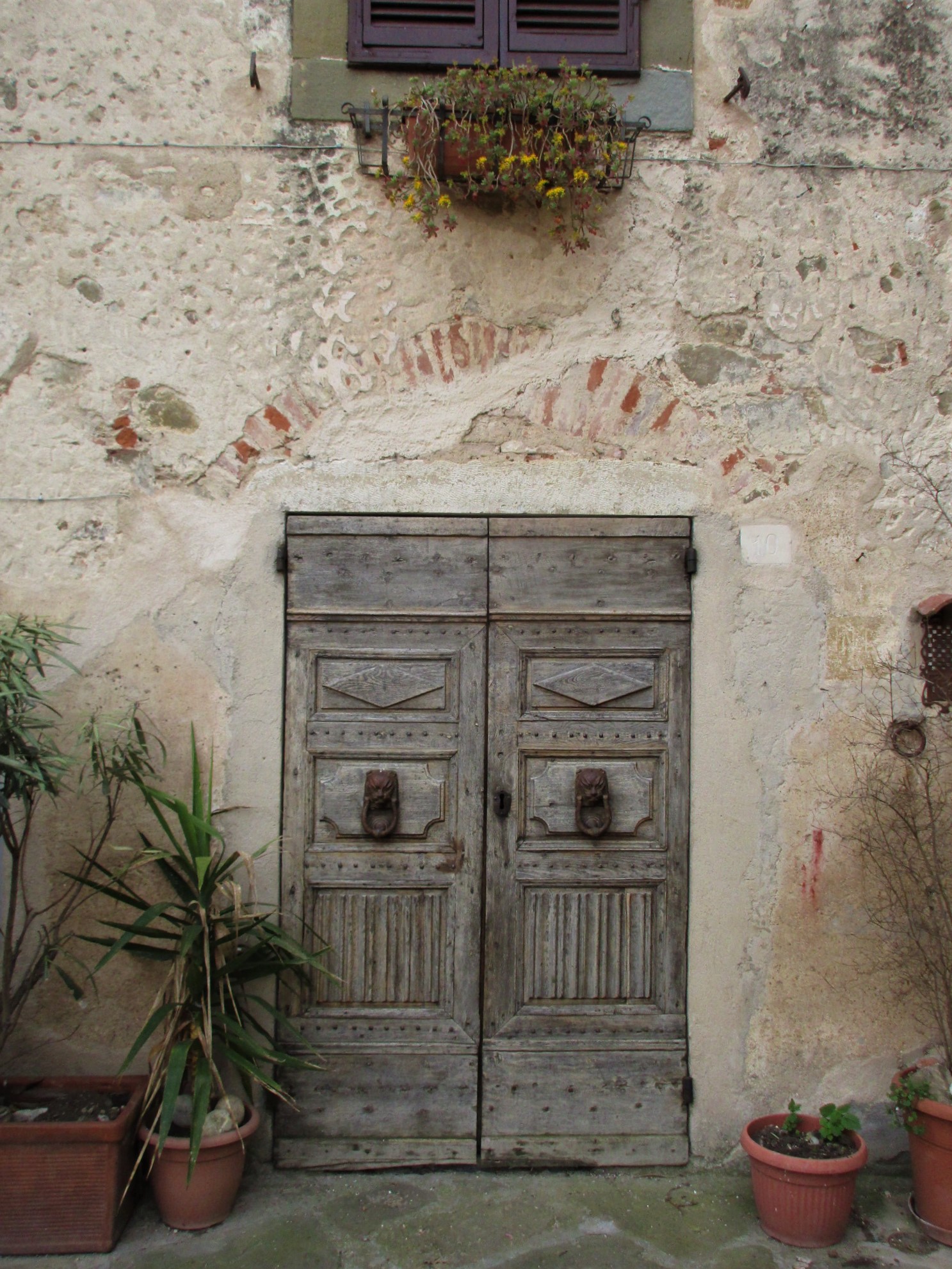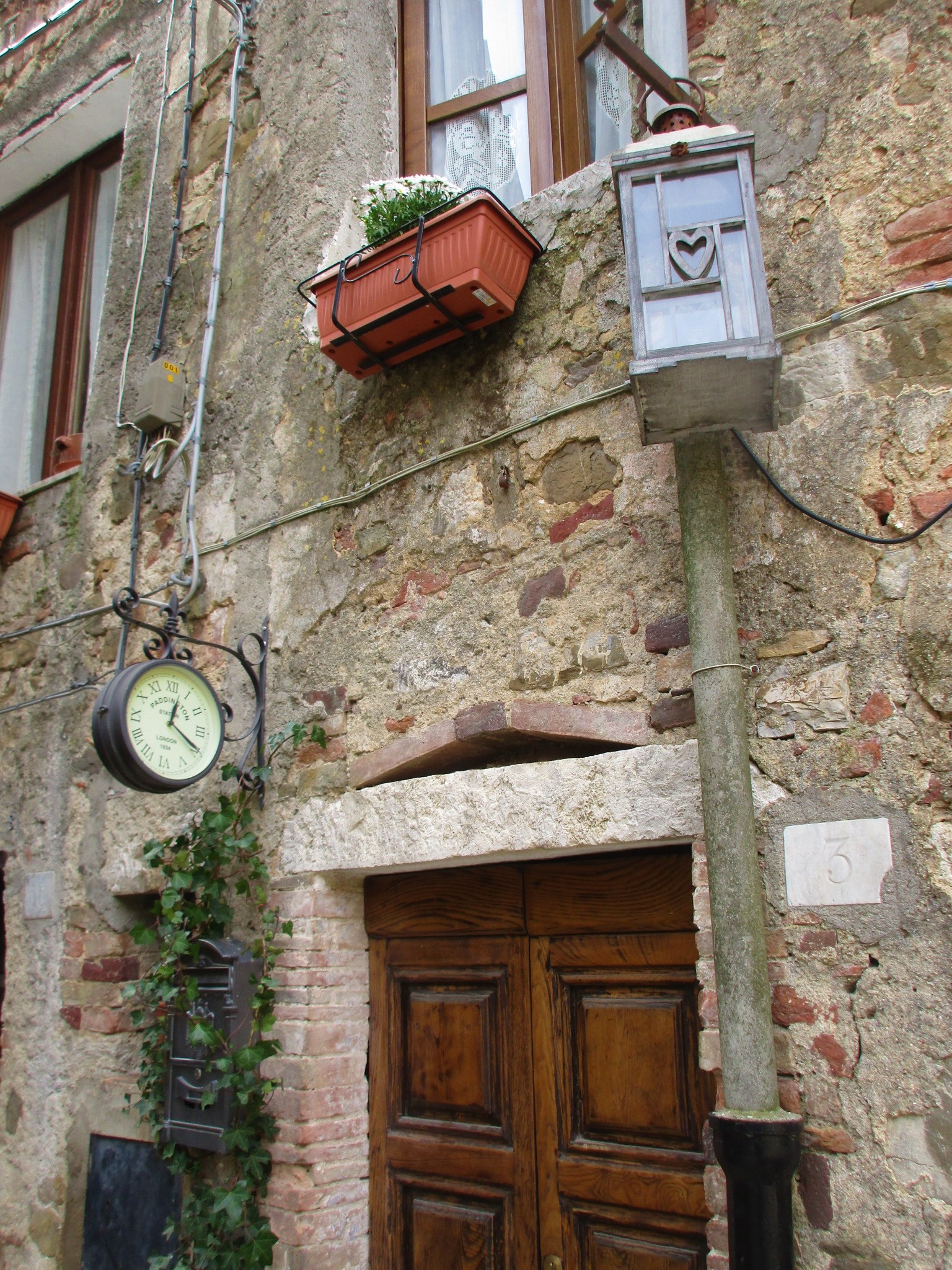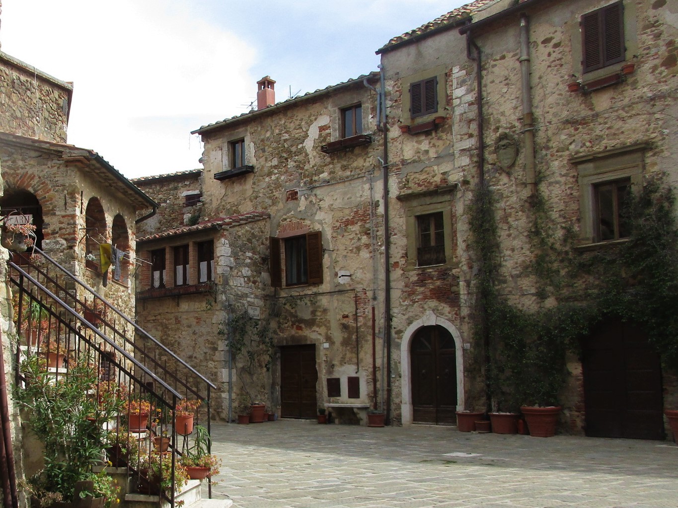 私たちがこの写真の奥から入ってきたのですが、南側の門を入ってすぐ右斜め前の坂道を上り、アーチを抜けるとこんなアングルになります。石畳、アーチ、古い木の扉、石造りの建物とそれをつたう植物・・・小さな村好きの人がゾクゾクするエッセンスが、ここに全て凝縮されています。