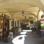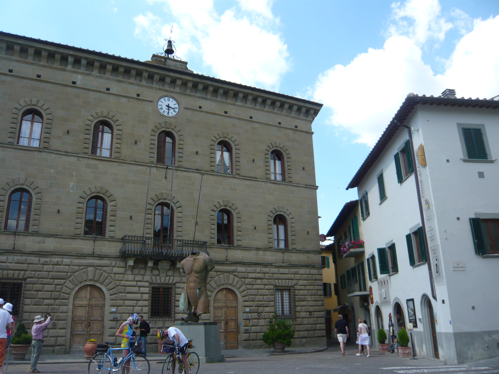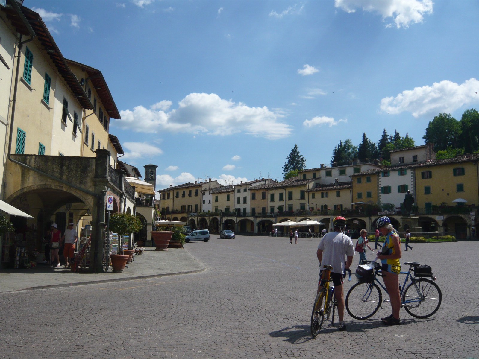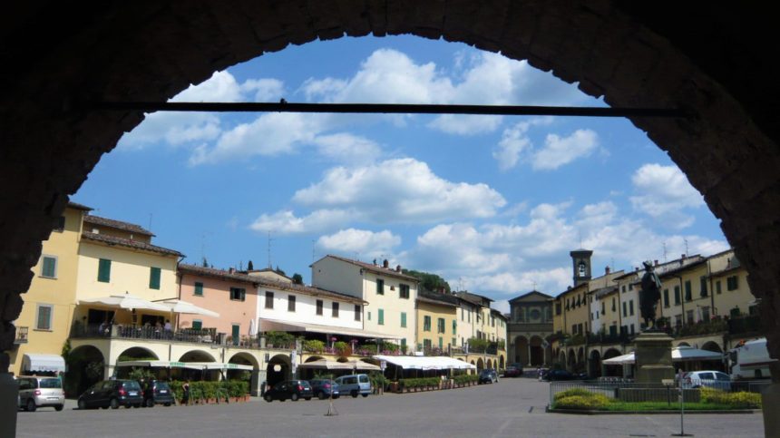 トスカーナの、いやイタリアのワインの中でも日本でもポピュラーなのが、キアンティ・クラッシコ。その生産ゾーンの中心的な村が、このグレーヴェ・イン・キアンティです。村のシンボルともいえるのが、この三角形のジャコモ・マテオッティ広場。教会を頂点に伸びる2つの辺は柱廊のある建物で、たくさんのお店やレストラン、エノテカなどが並びます。