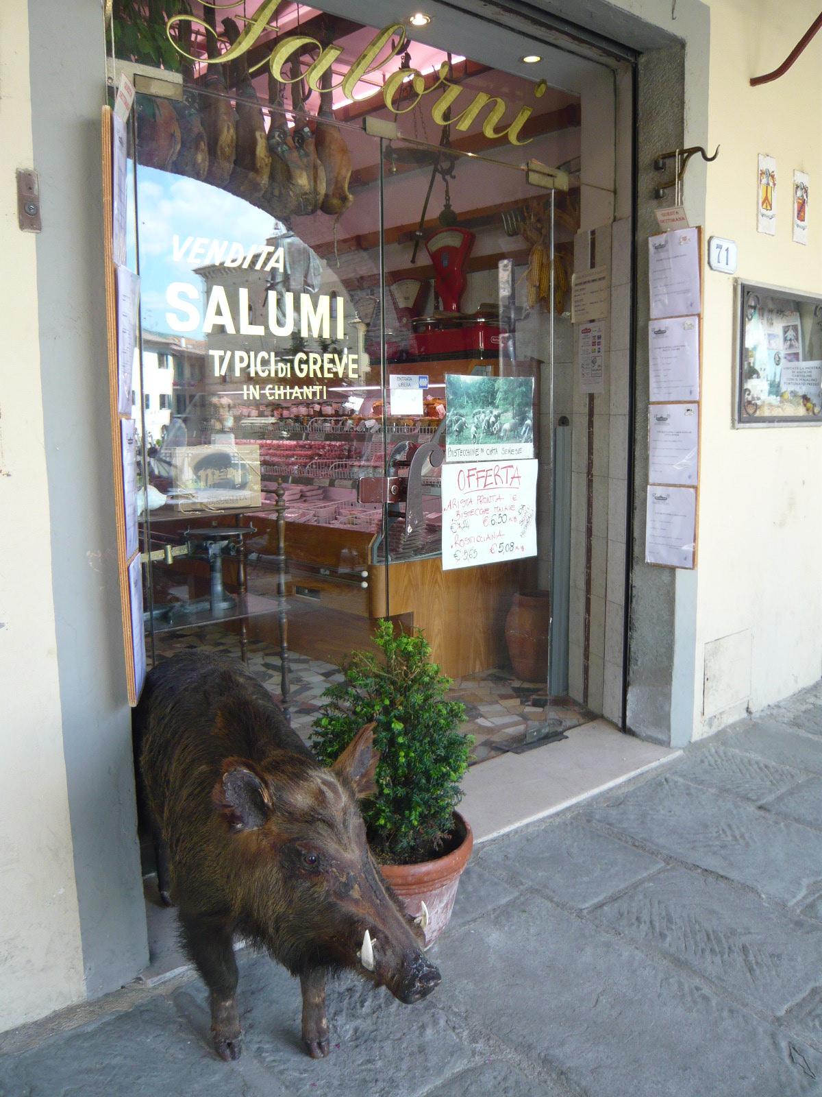 更に先にあるのが1806年創業の老舗の肉屋・ファロルニ。ここも、入口に猪の剥製がお出迎えしてくれるので分かりやすいです。精肉も普通に売ってますが、10時~19時半まで毎日開いてるビストロでランチも良し、ここのサラミなどの製品や肉以外のお土産になりそうな食材、そして可愛いのが豚の形をした豚グッズ!生ハムがズラリと吊るされた店内に、入るだけでも楽しいですよ。